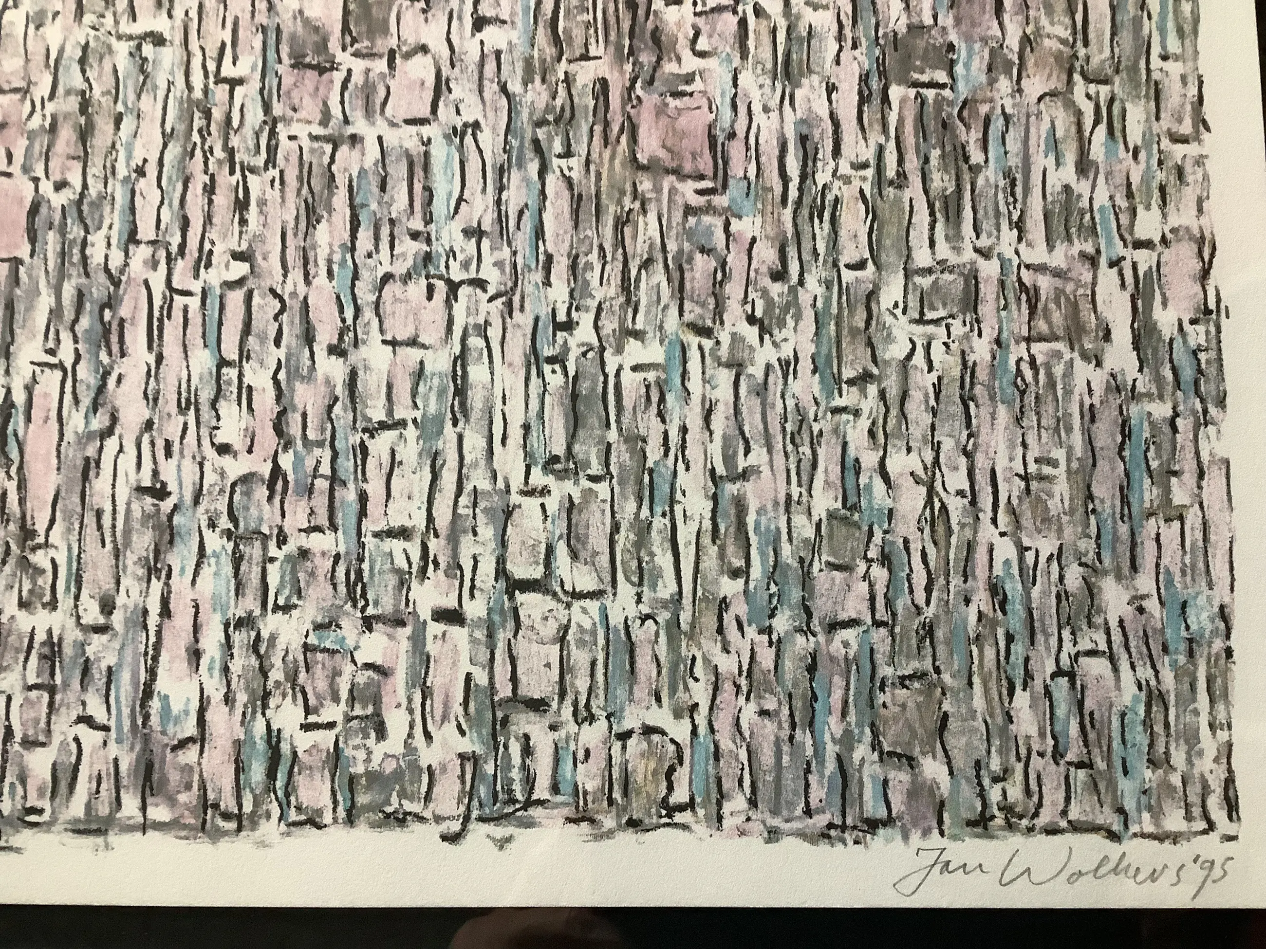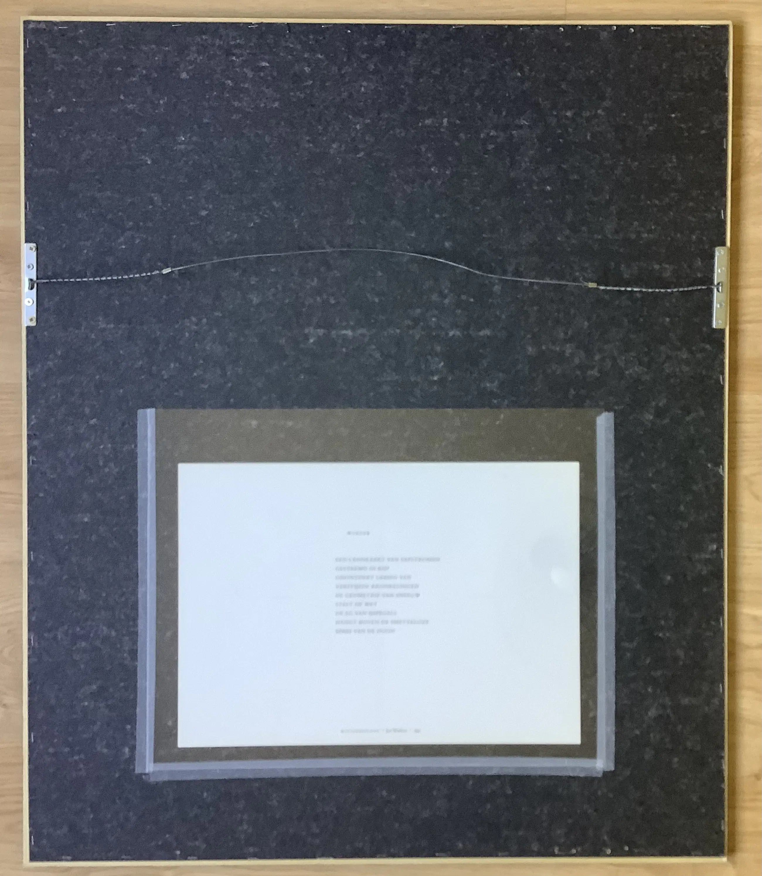 De zeefdruk en de foto zijn prachtig ingelijst in een dubbel passe partout. Het gedicht zit netjes achter een perspex plaat op de achterzijde van het werk. Zie foto’s. Helaas niet heel duidelijk gezien de spiegeling van het glas. Deze wijze van inlijsten is uniek. Een must have voor de echte liefhebber van Jan Wolkers.