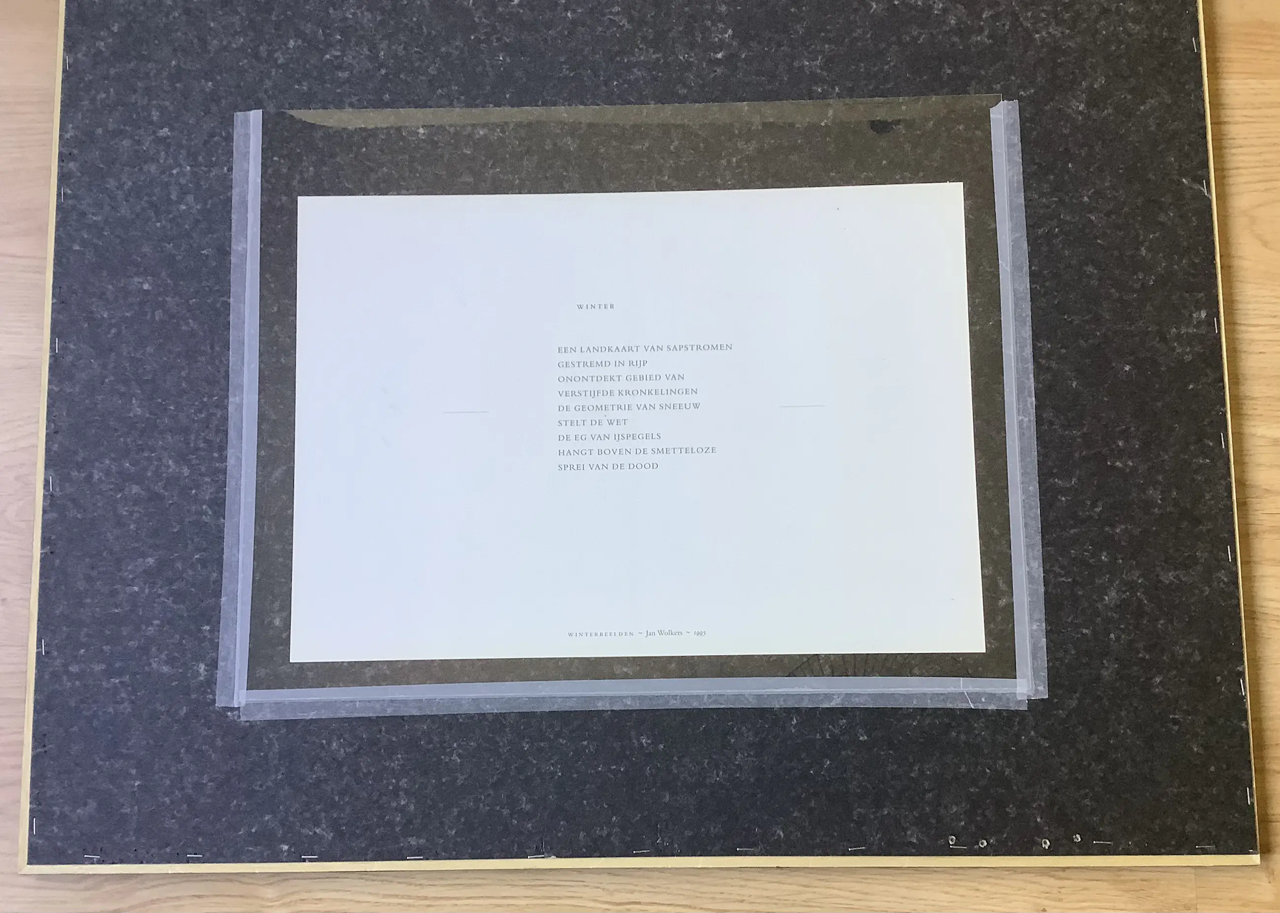 Deze zeefdruk is nummer 12 uit de cassette Winterbeelden uit 1995. De serie bestaat uit zeefdrukken, foto’s gemaakt door Steye Raviez en gedichten van Jan Wolkers.