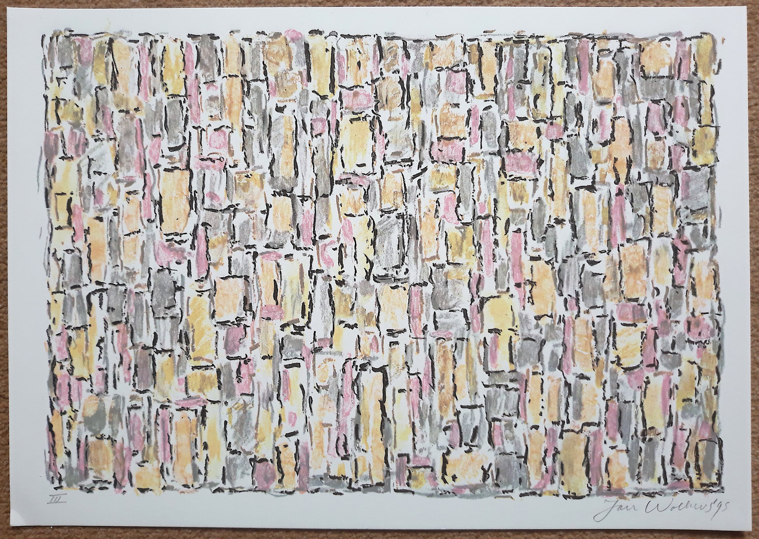 Mooie, gestructureerde compositie van Jan Wolkers uit de portfolio Winterbeelden. Zeefdruk op papier, met potlood gesigneerd, gedateerd (‘95) en genummerd (III). In uitstekende conditie.