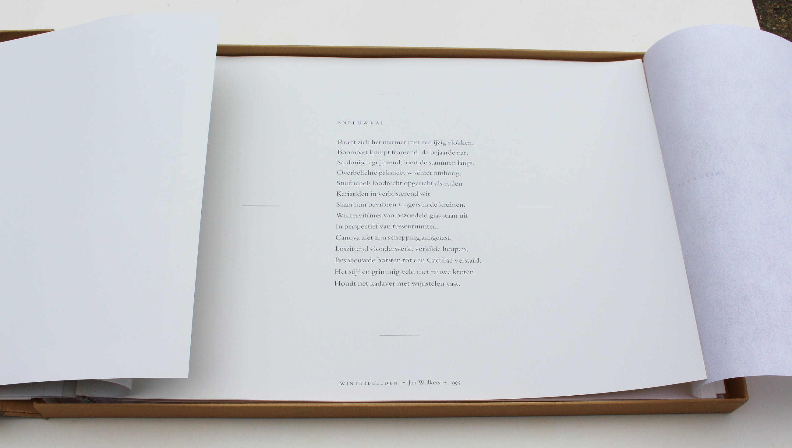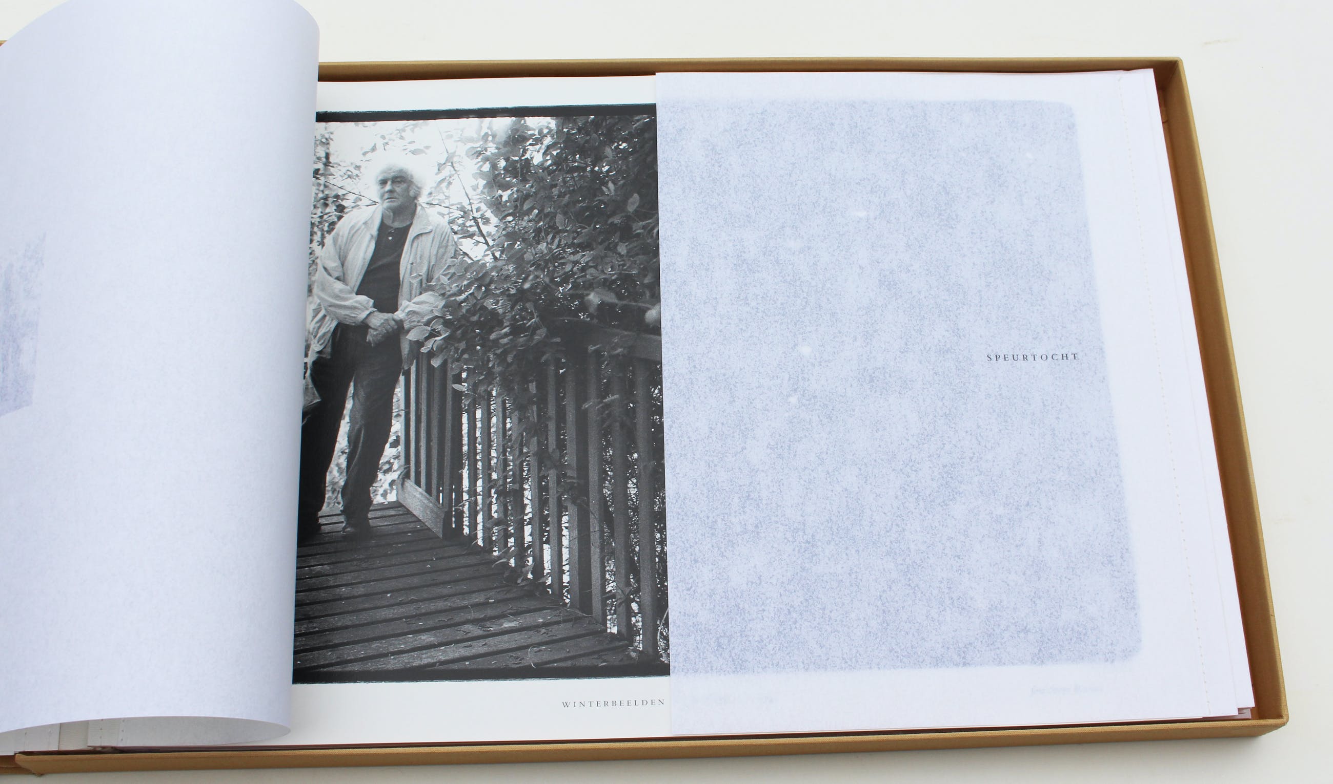 De gedichten, zeefdrukken en zwart-witfoto’s zijn losbladig opgenomen. De zeefdrukken werden gedrukt op 300 grams Velin van Arches, de gedichten en foto’s op 230 grams Savannah Natural Art Mat en de rest van omslag en binnenwerk op 160 en 230 grams Pergamenata Wit en 250 grams Grafiset Wit.