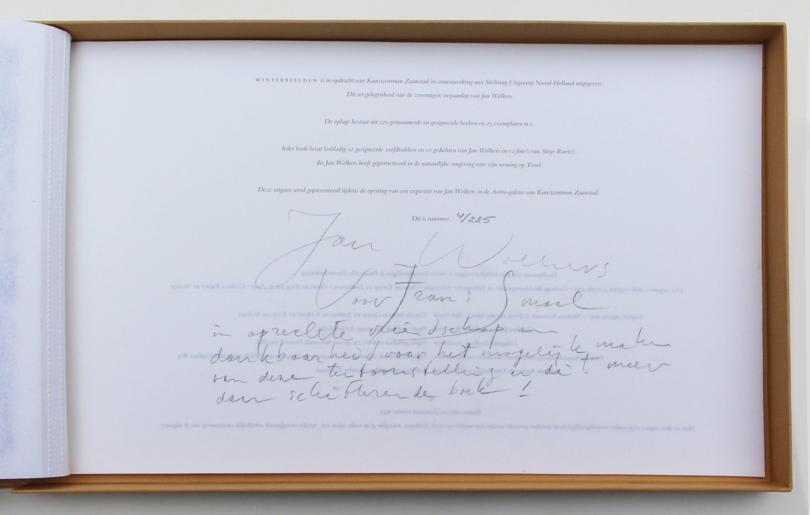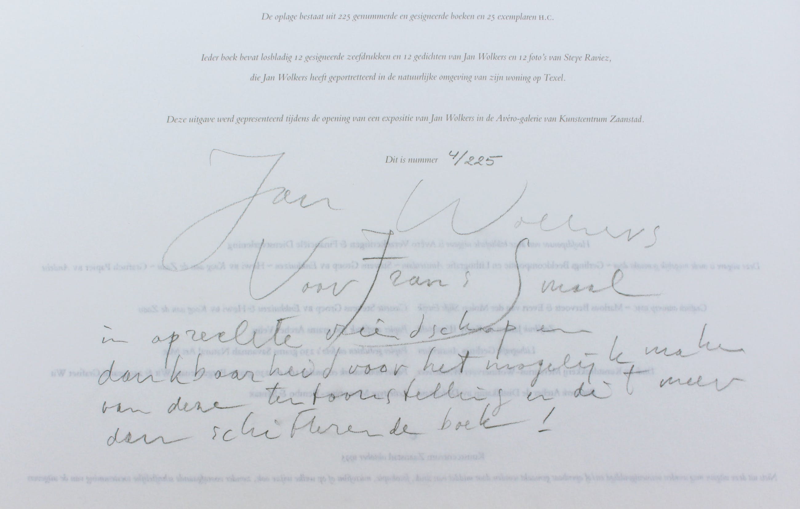 uitgave van Kunstcentrum Zaanstad, Zaandam i.s.m Stichting uitgeverij Noord-Holland, Wormerveer, 1995, gesigneerd (en met opdracht aan organisator) door Jan Wolkers en genummerd 4/225