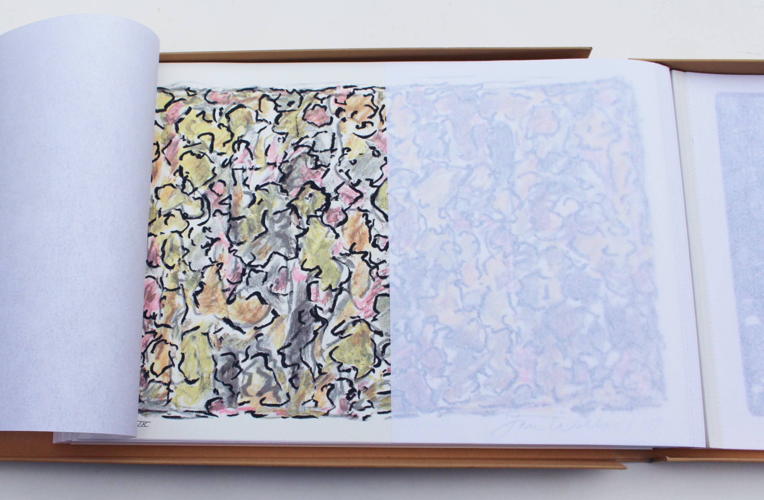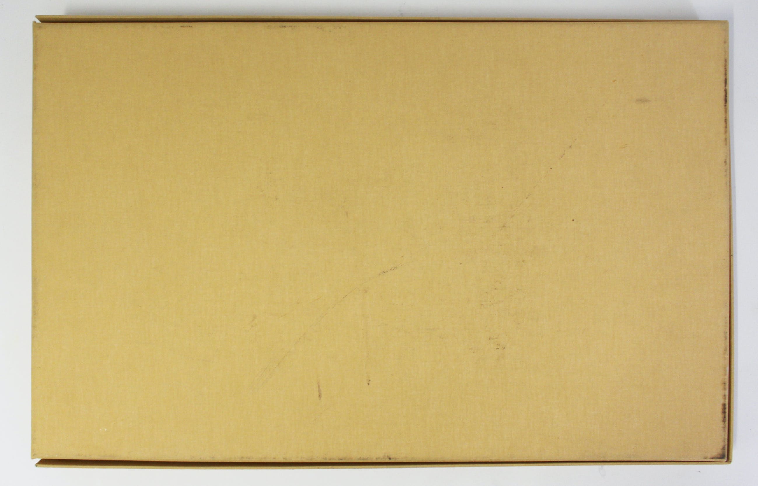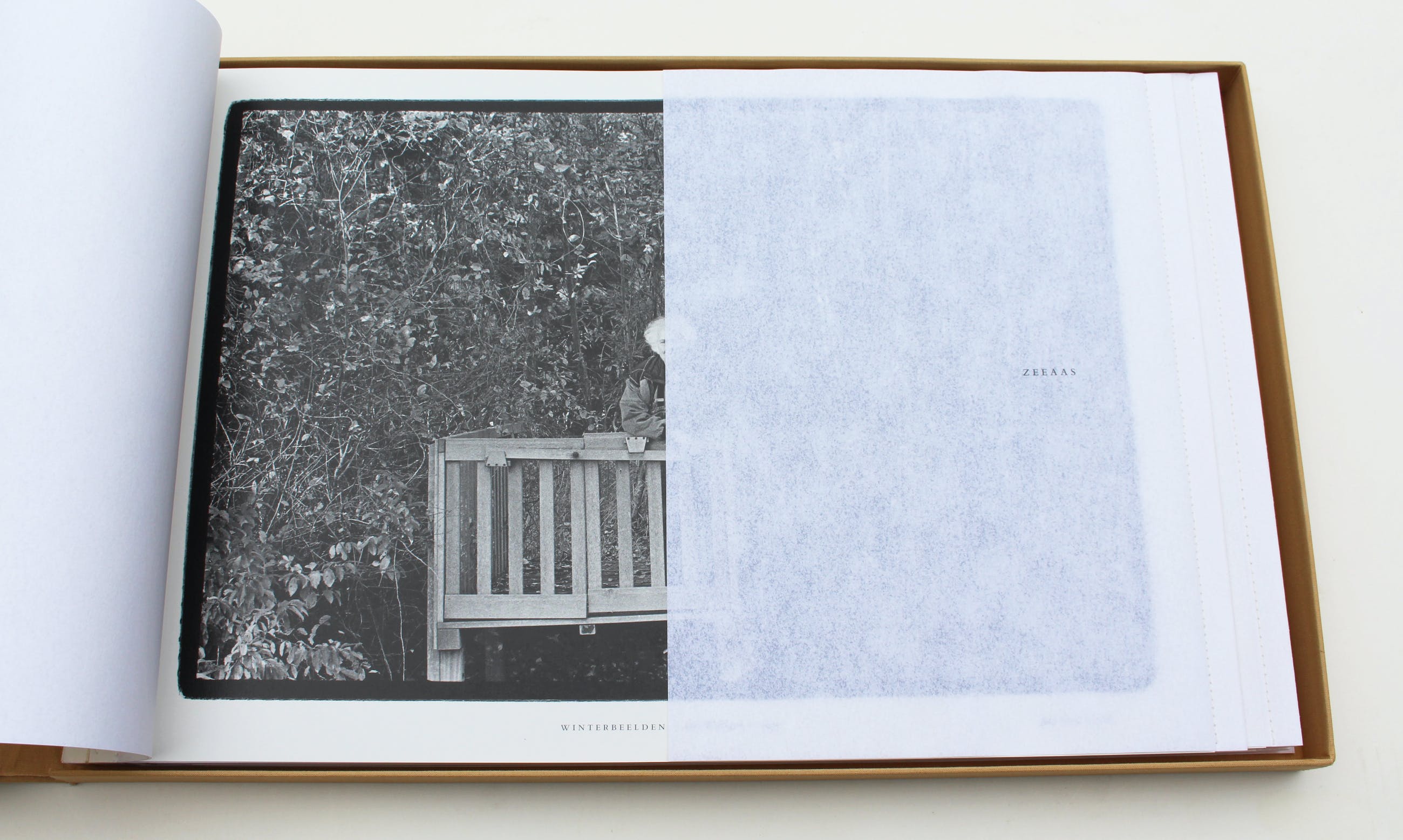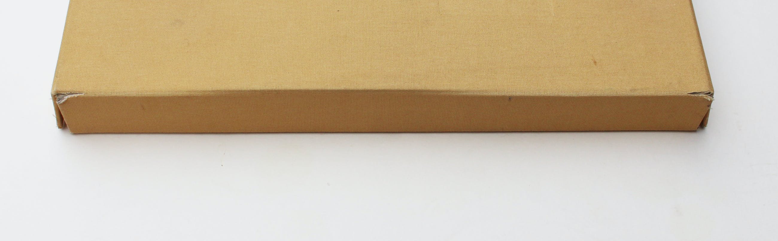 het geheel gebundeld via de Japanse bindwijze met linnen stroken in linnen overslagdoos met opdruk.