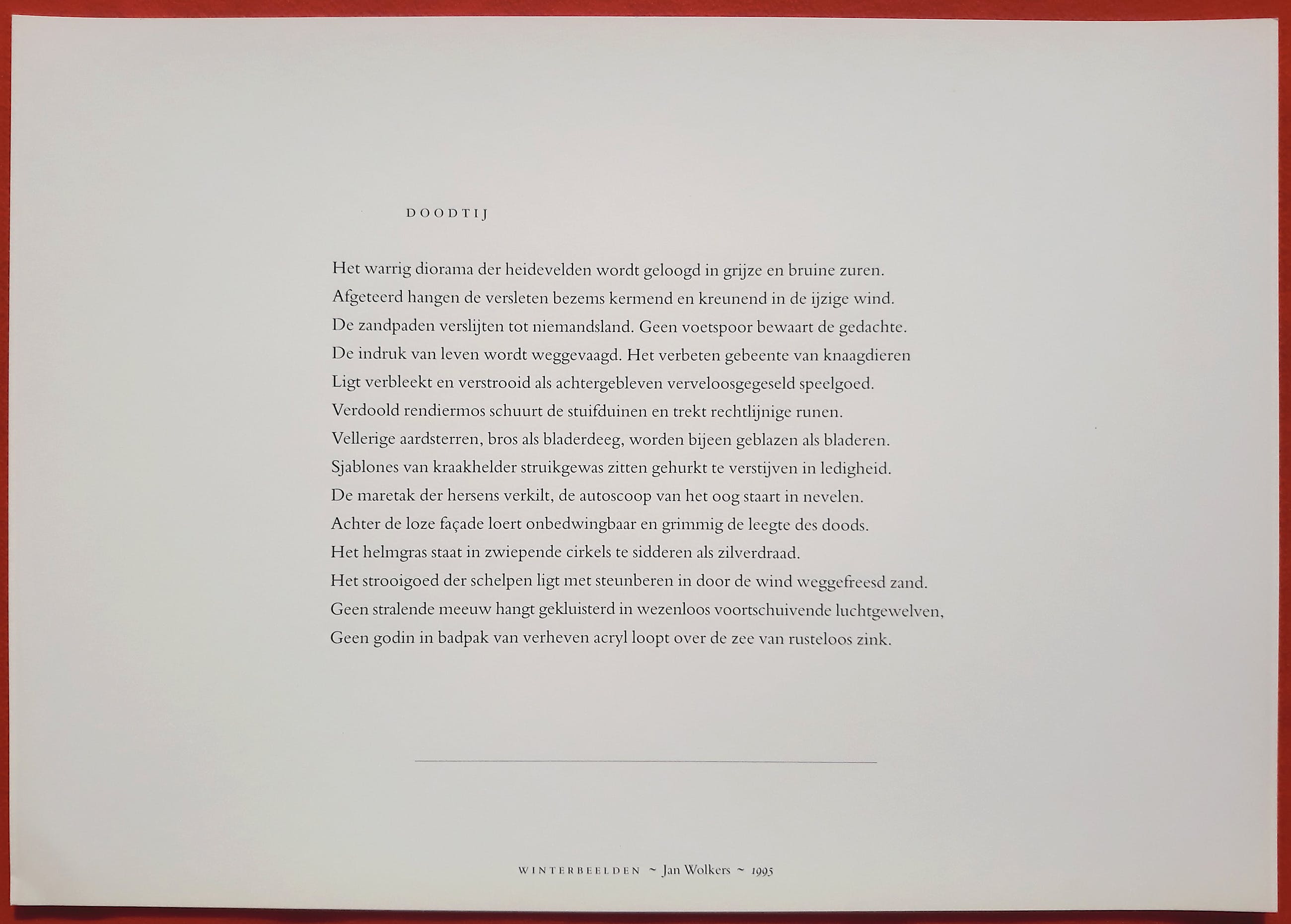 Mooie compositie van Jan Wolkers uit de portfolio Winterbeelden. Zeefdruk op papier, met potlood gesigneerd, gedateerd (‘95) en genummerd (XI). In zeer goede conditie; miniem kreukje in hoek van witte marge linksonder.