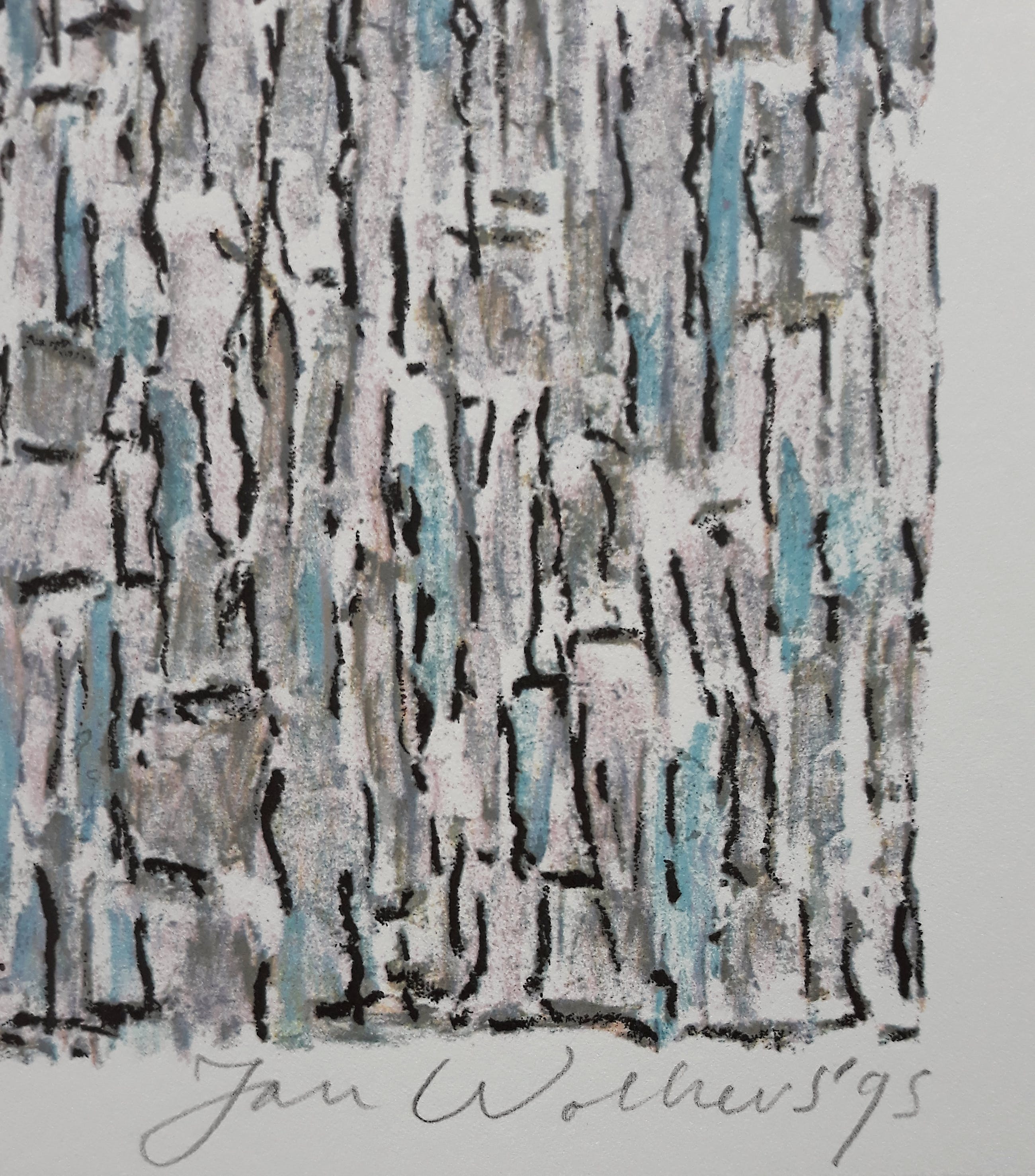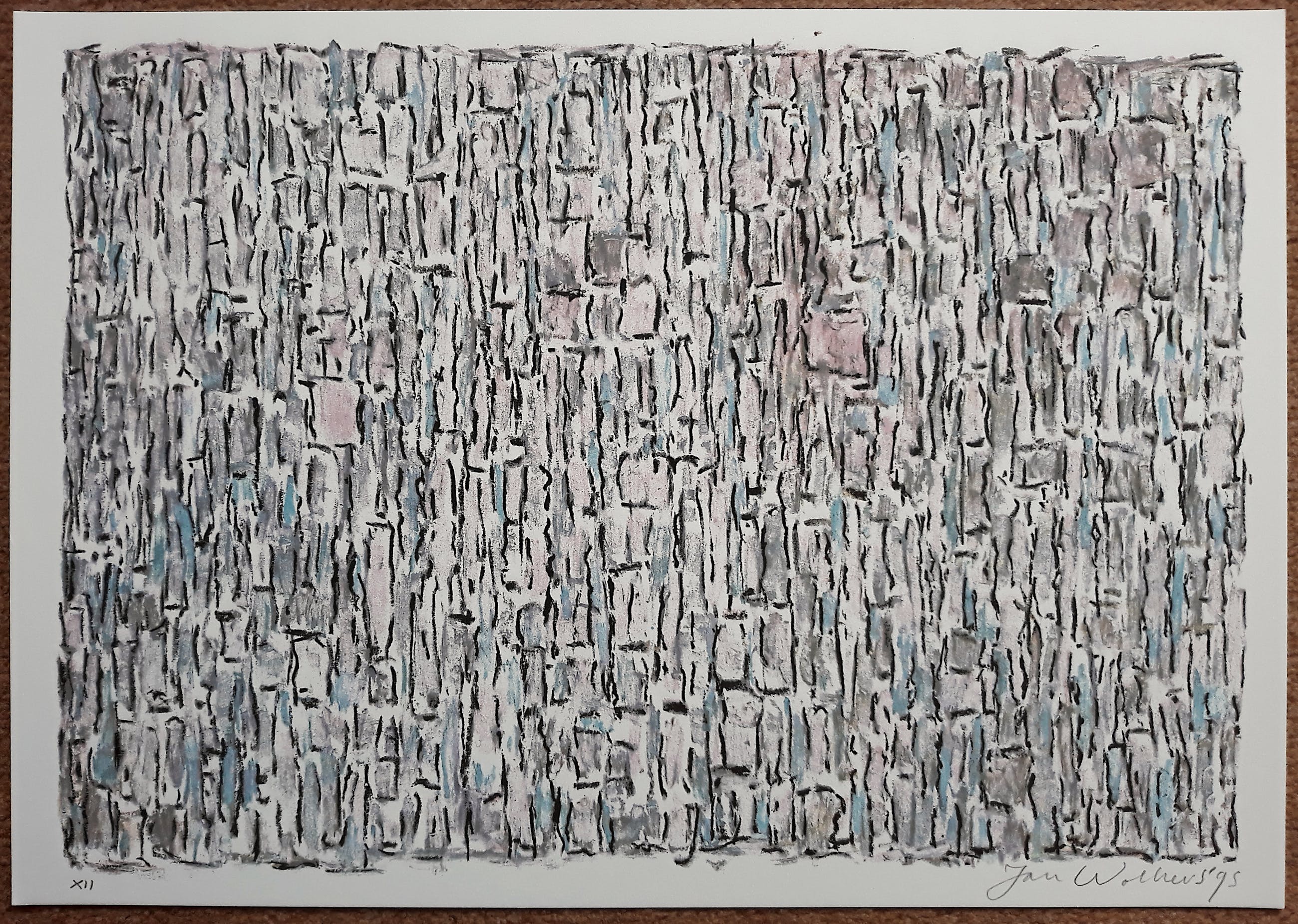 Mooie, gestructureerde compositie van Jan Wolkers uit de portfolio Winterbeelden. Zeefdruk op papier, met potlood gesigneerd, gedateerd (‘95) en genummerd (XII). In uitstekende conditie.