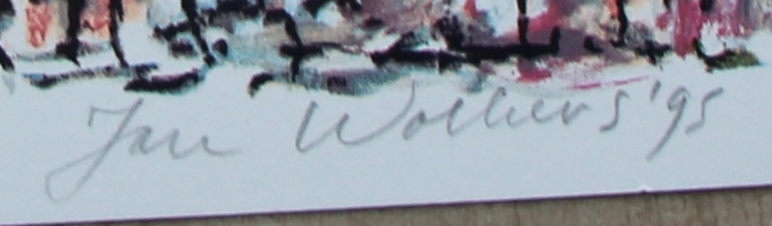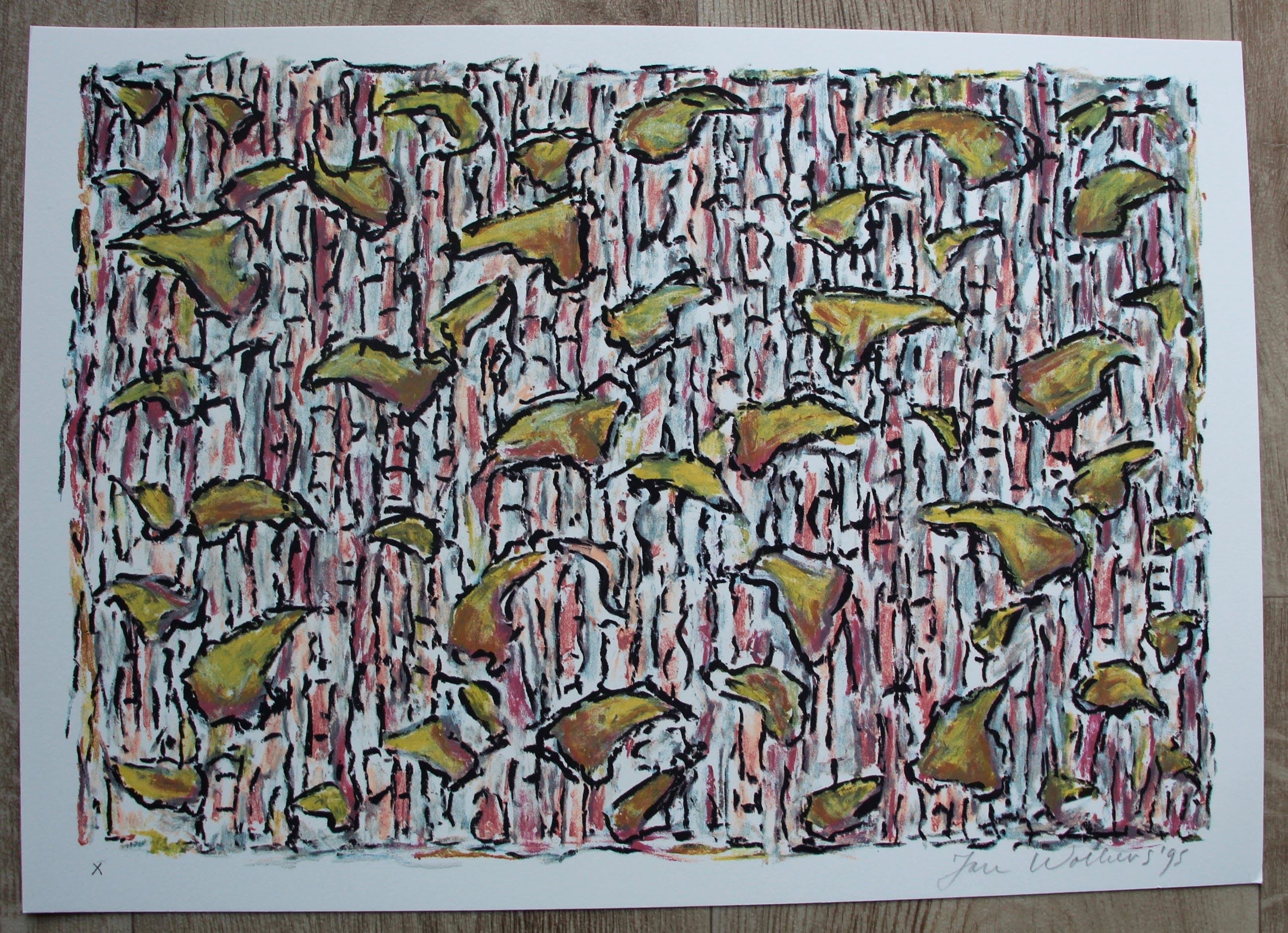 Zeefdruk van Jan Wolkers. Titel: Winterbeelden. Jaar: 1995. Nummer: X. Ter gelegenheid van de zevenstigste verjaardag van Jan Wolkers verscheen bij Kunstcentrum Zaandam in samenwerking met de Stichting Uitgeverij Noord-Holland de bibliofiele uitgave Winterbeelden. Speciaal hiervoor maakte Wolkers twaalf zeefdrukken. Papierformaat is H31 x b44 cm. Afmetingen voorstelling: H28 x b40 cm. Het werk is rechtsonder gesigneerd en linksonder genummerd door de kunstenaar. De authenticiteit van het aangeboden werk wordt volledig gegarandeerd. Een certificaat van echtheid kan, op aanvraag worden gemaild.