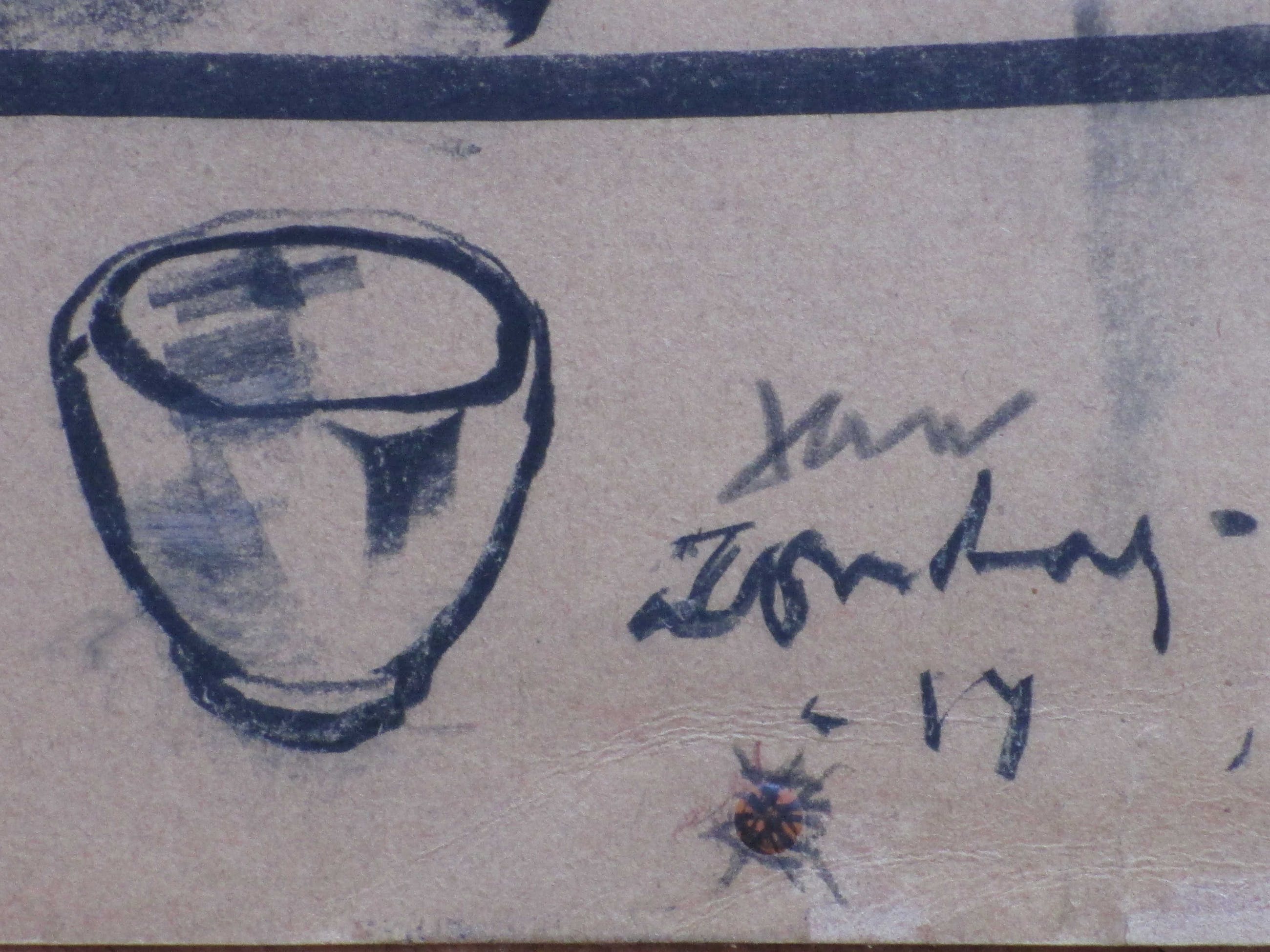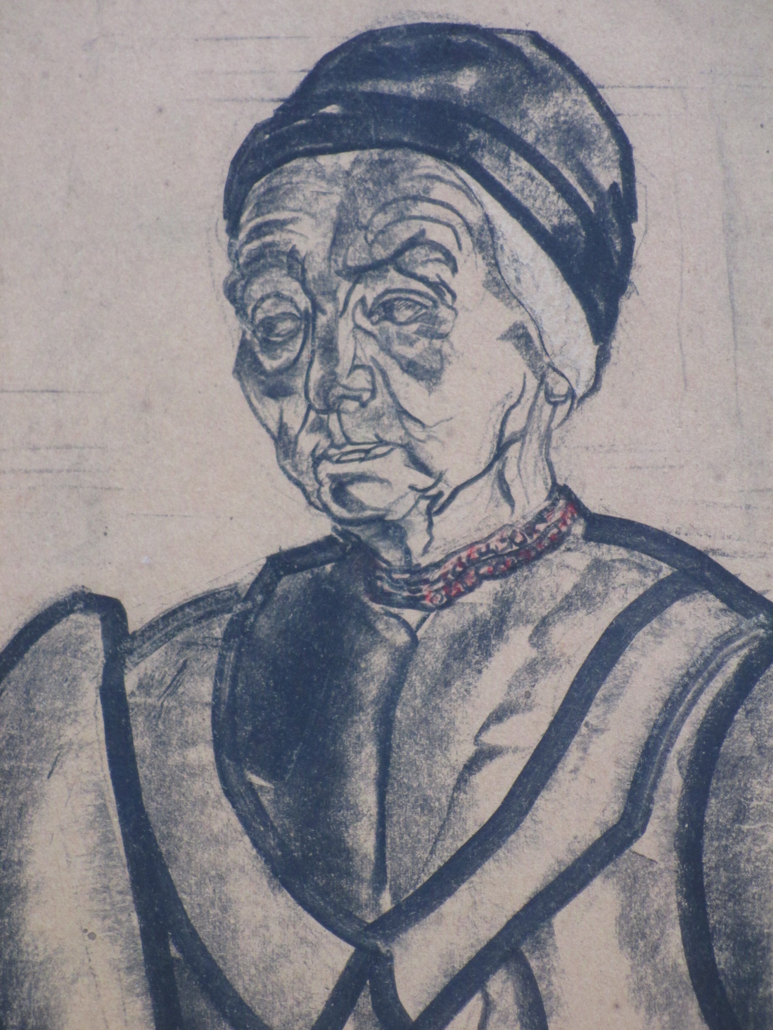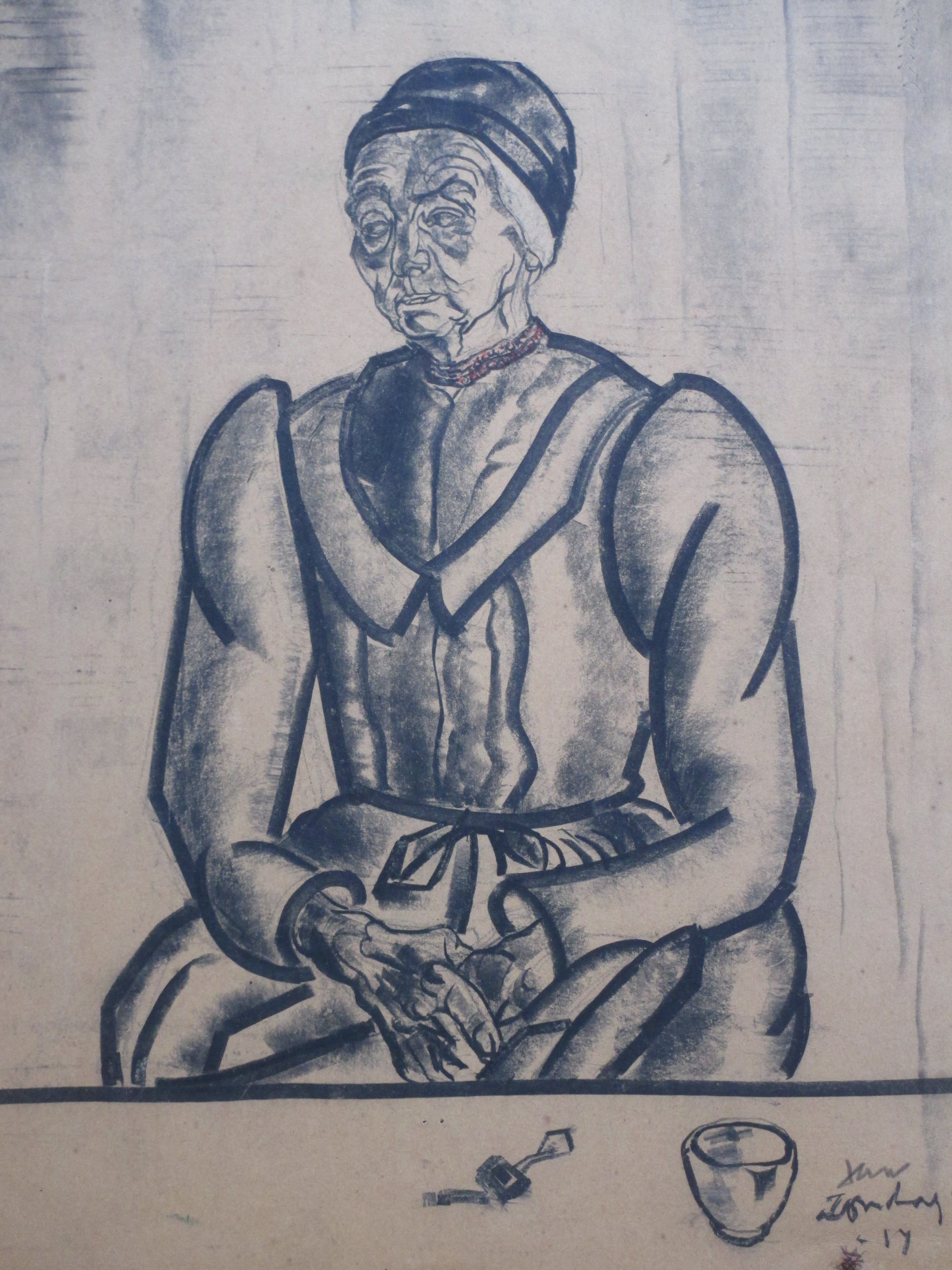 Houtskooltekening door Jan Zondag. Voorstelling van een zittende dame. Verwijzing op achterzijde: Tante Meu (zie afbeelding) Losbladig, beeldmaat 52x45, bladmaat 63x49 Gesigneerd en gedateerd rechtsonder: 'Jan Zondag '17' Authenticiteit volledig gegarandeerd