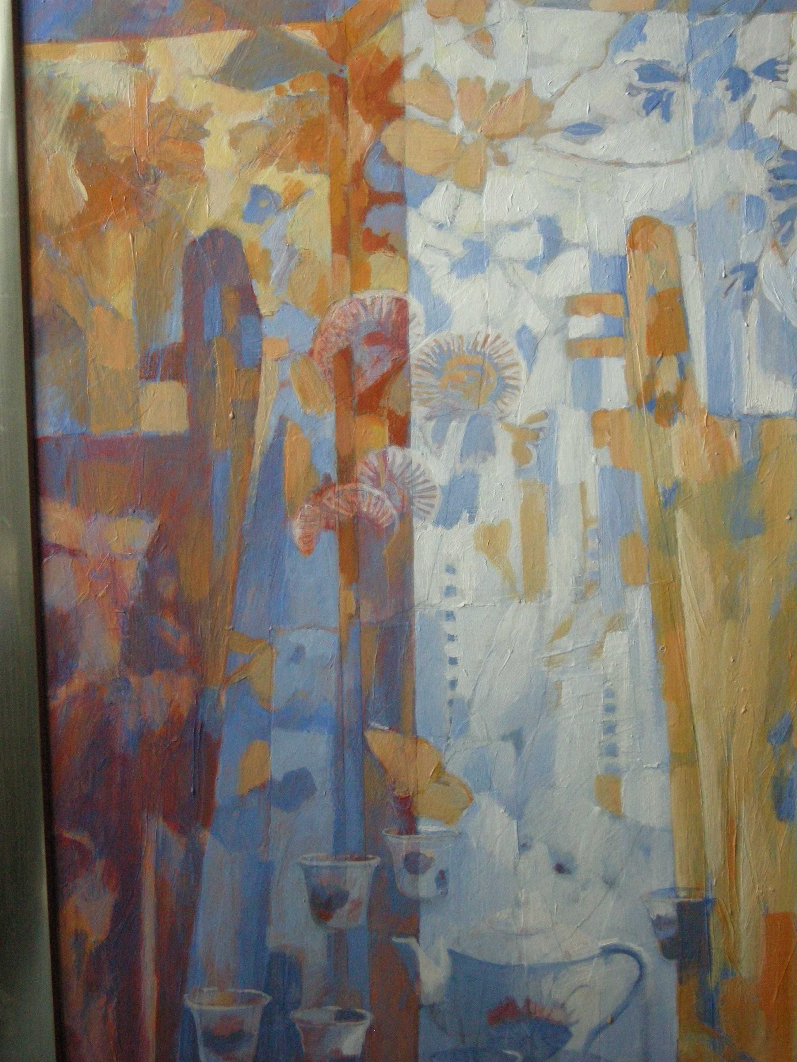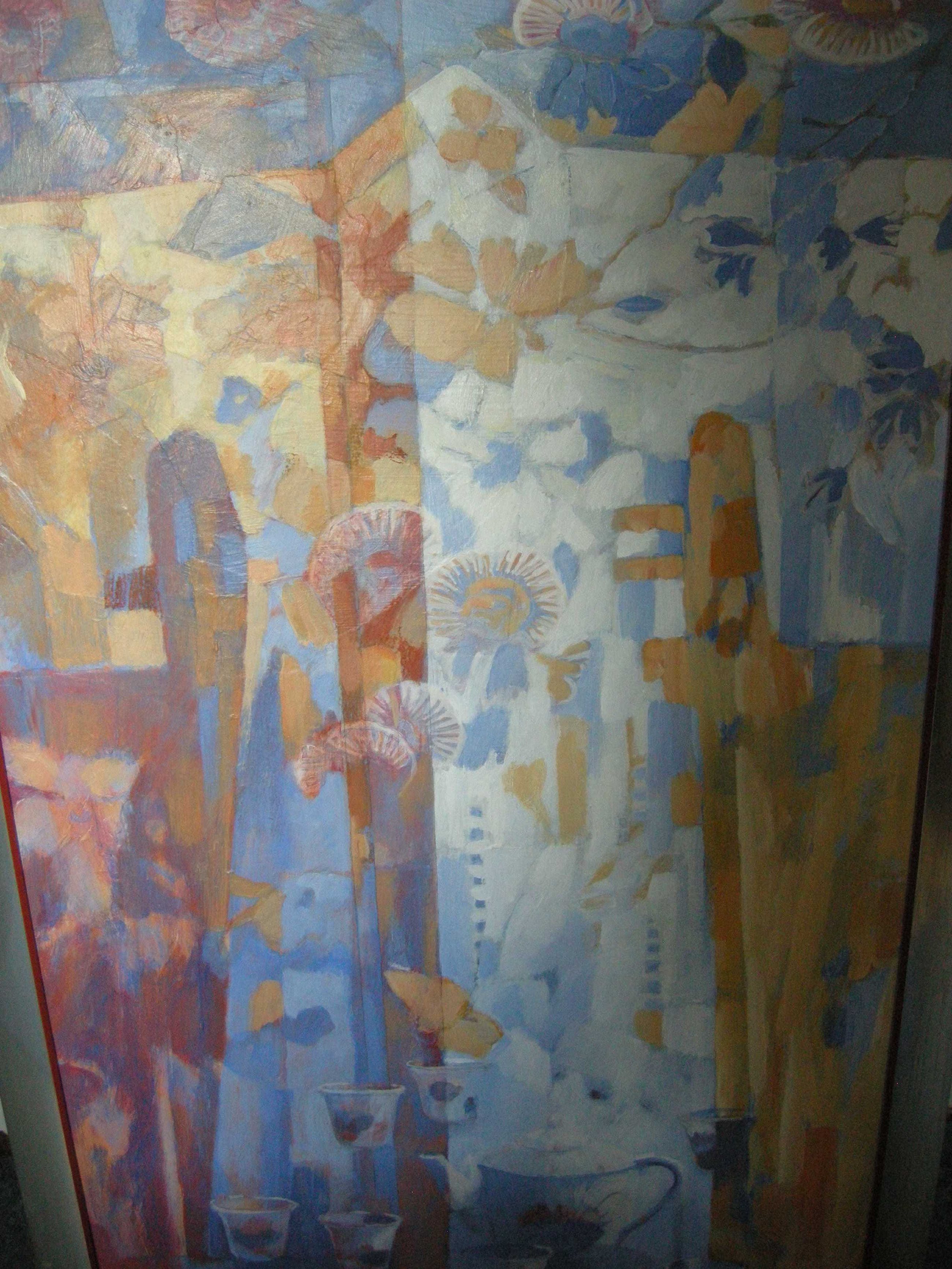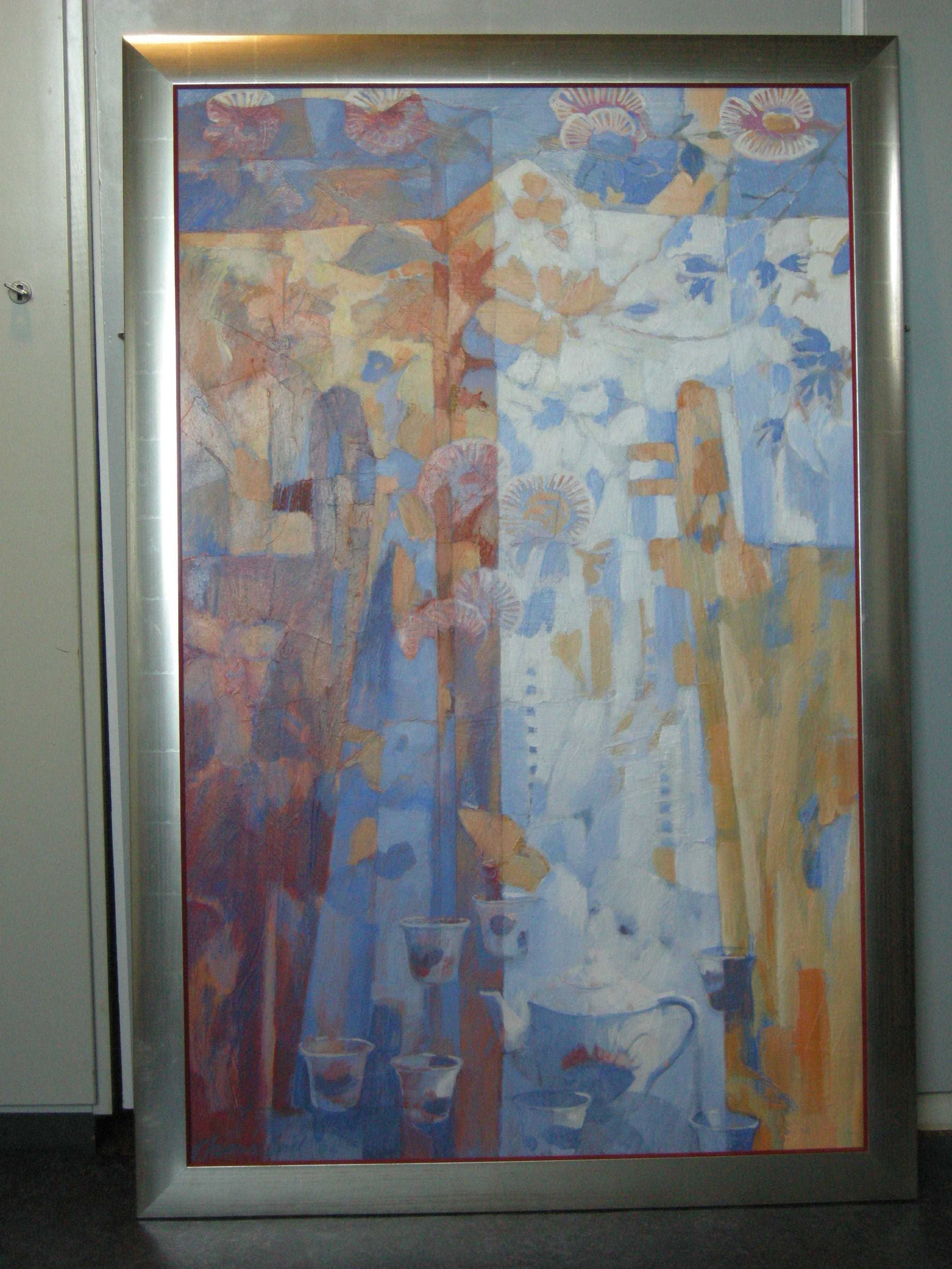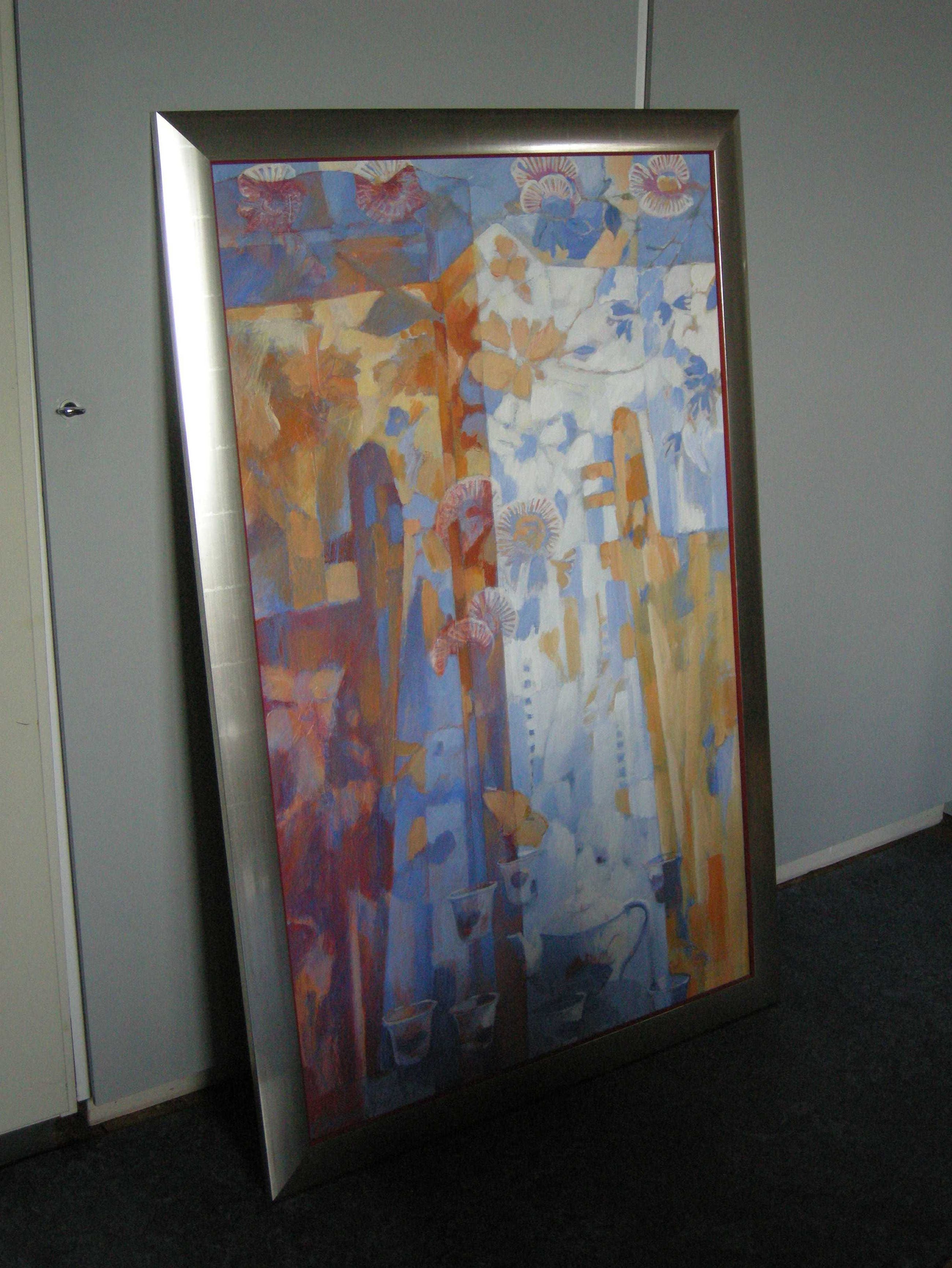 Fraai schilderij van een kimono omringd door Japanse voorwerpen: chrysanten, theeservies, een (kabuki)masker. In plat vlak geschilderd, waardoor deze motieven lijken te zweven. Als extra dimensie biedt het kunstwerk een lichte en meer donkere helft. Het geheel levert een altijd boeiend en kleurrijk beeld op - dat helaas nauwelijks op foto's weer te geven is. Het schilderij is met acrylverf op mdf-plaat geschilderd, waardoor het niet verkleurt en geen onderhoud behoeft. Het is mooi ingelijst in een mat-zilveren houten lijst, waarvan de binnenrand rood gekleurd is.