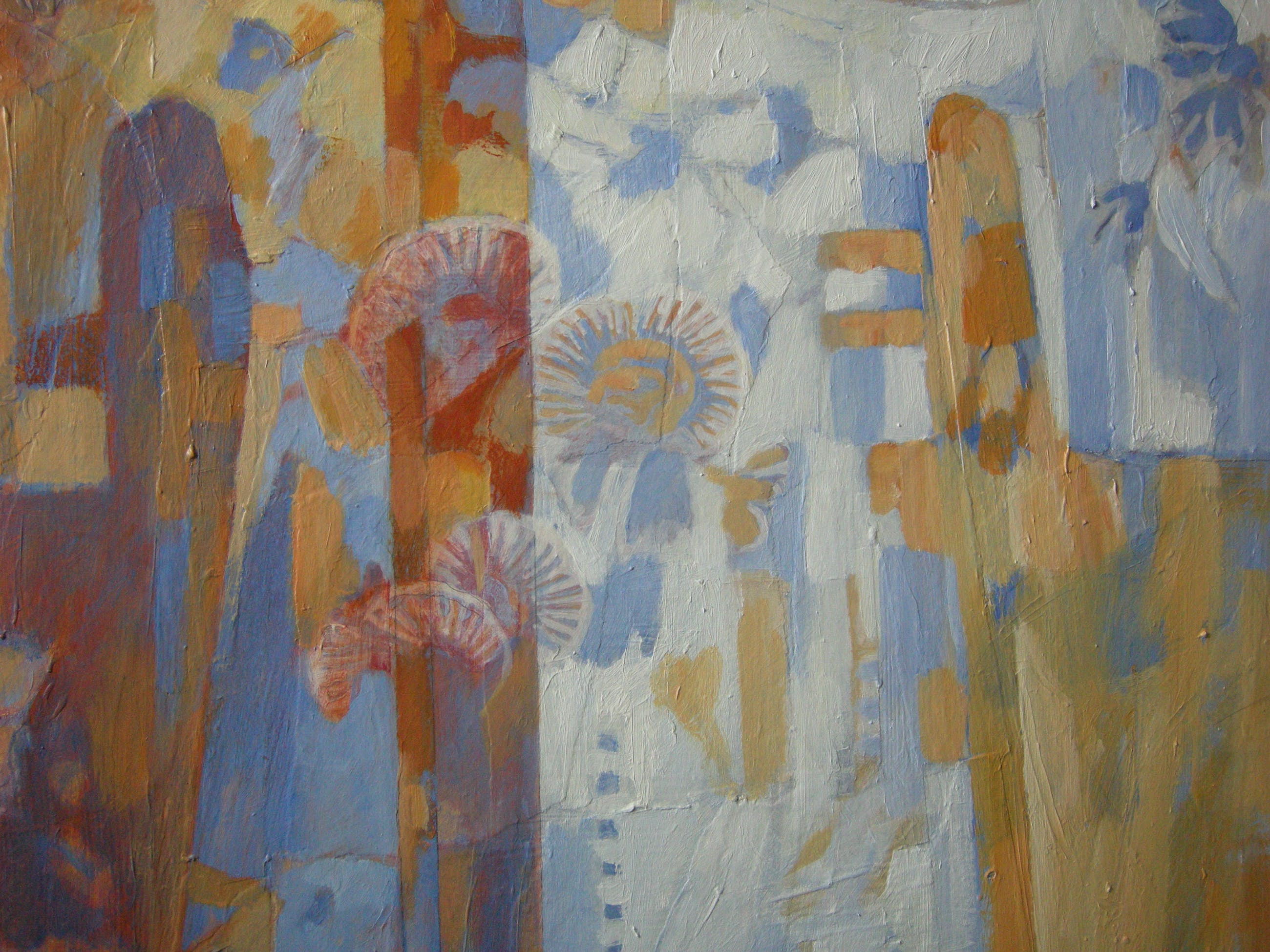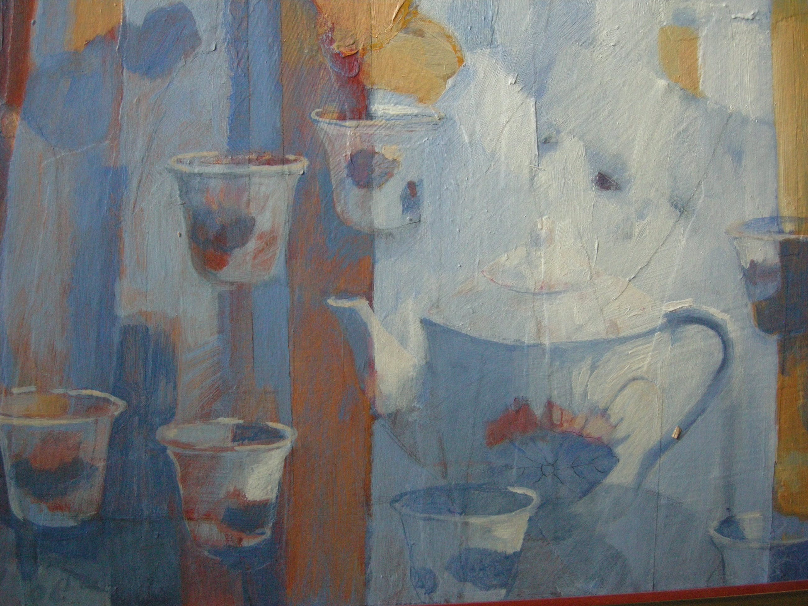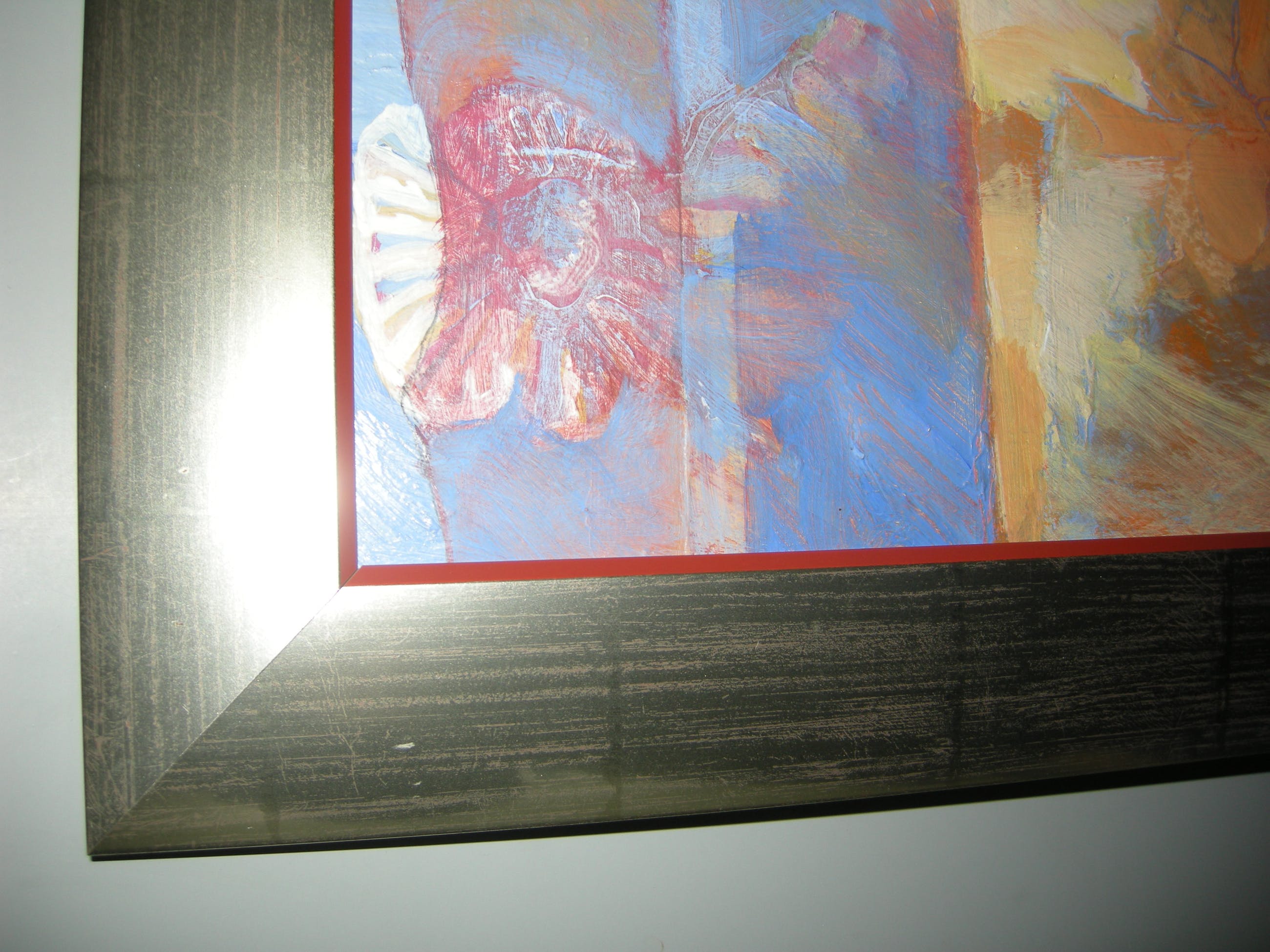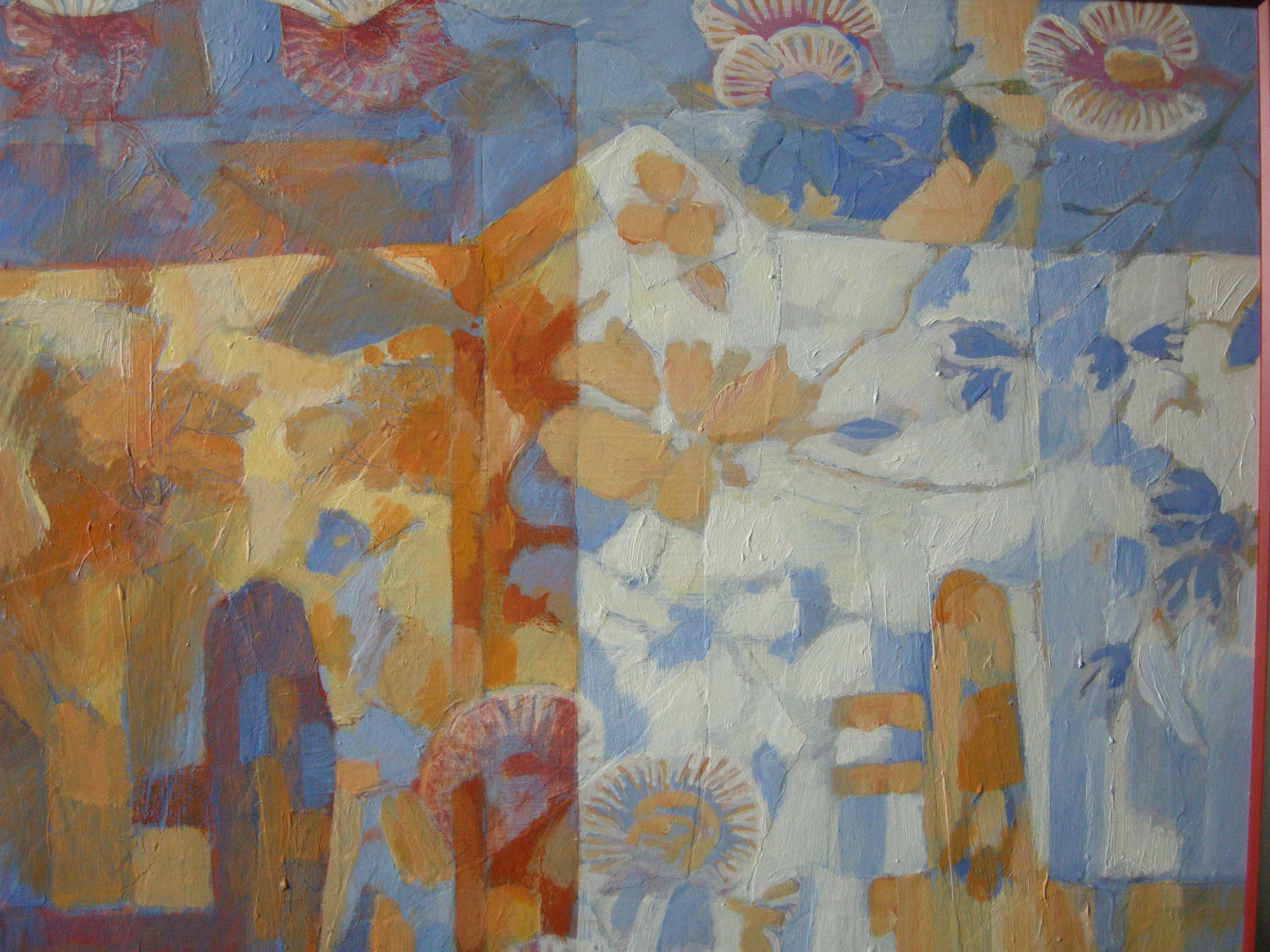 Fraai schilderij van een kimono omringd door Japanse voorwerpen: chrysanten, theeservies, een (kabuki)masker. In plat vlak geschilderd, waardoor deze motieven lijken te zweven. Als extra dimensie biedt het kunstwerk een lichte en meer donkere helft. Het geheel levert een altijd boeiend en kleurrijk beeld op - dat helaas nauwelijks op foto's weer te geven is. Het schilderij is met acrylverf op mdf-plaat geschilderd, waardoor het niet verkleurt en geen onderhoud behoeft. Het is mooi ingelijst in een mat-zilveren houten lijst, waarvan de binnenrand rood gekleurd is.
