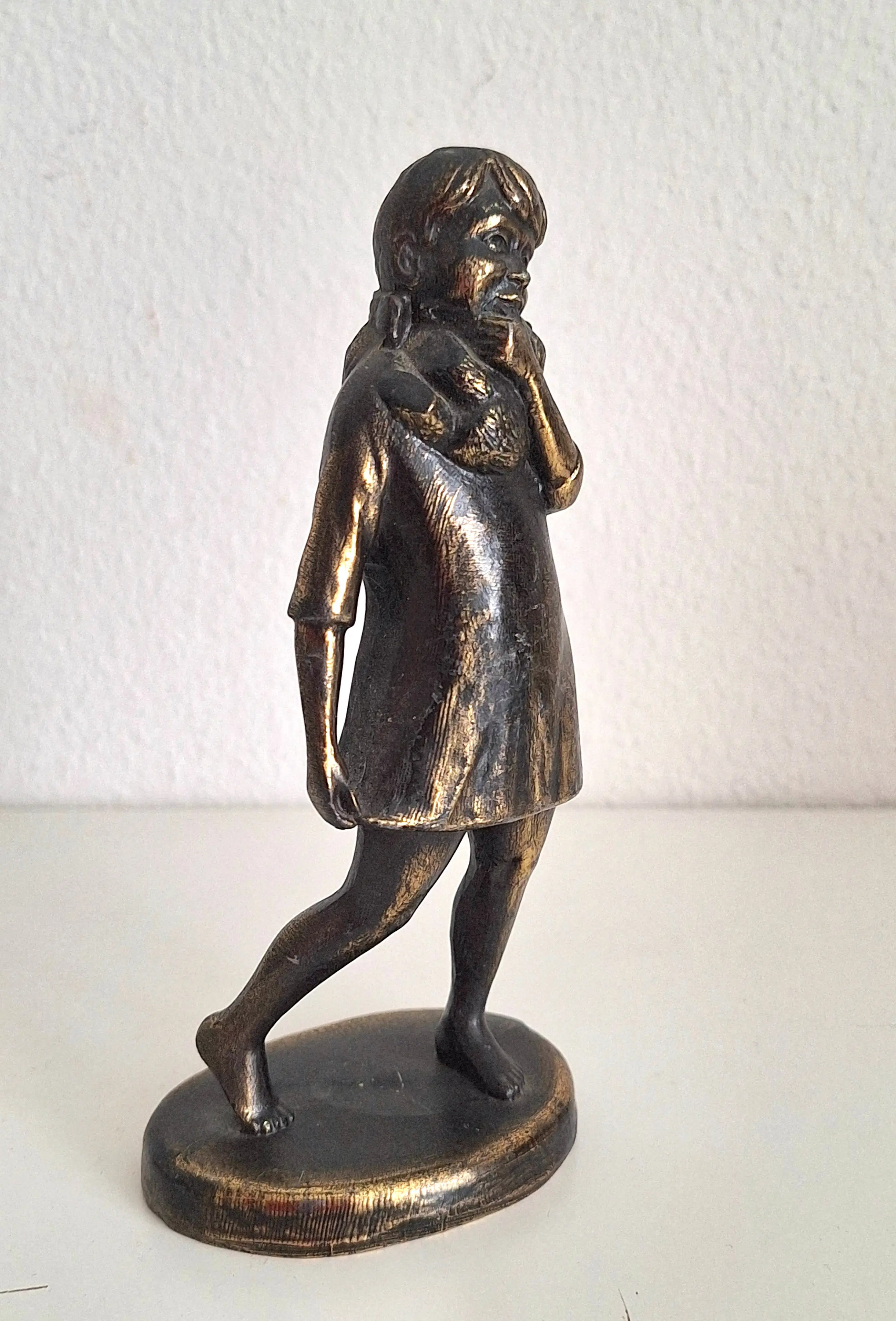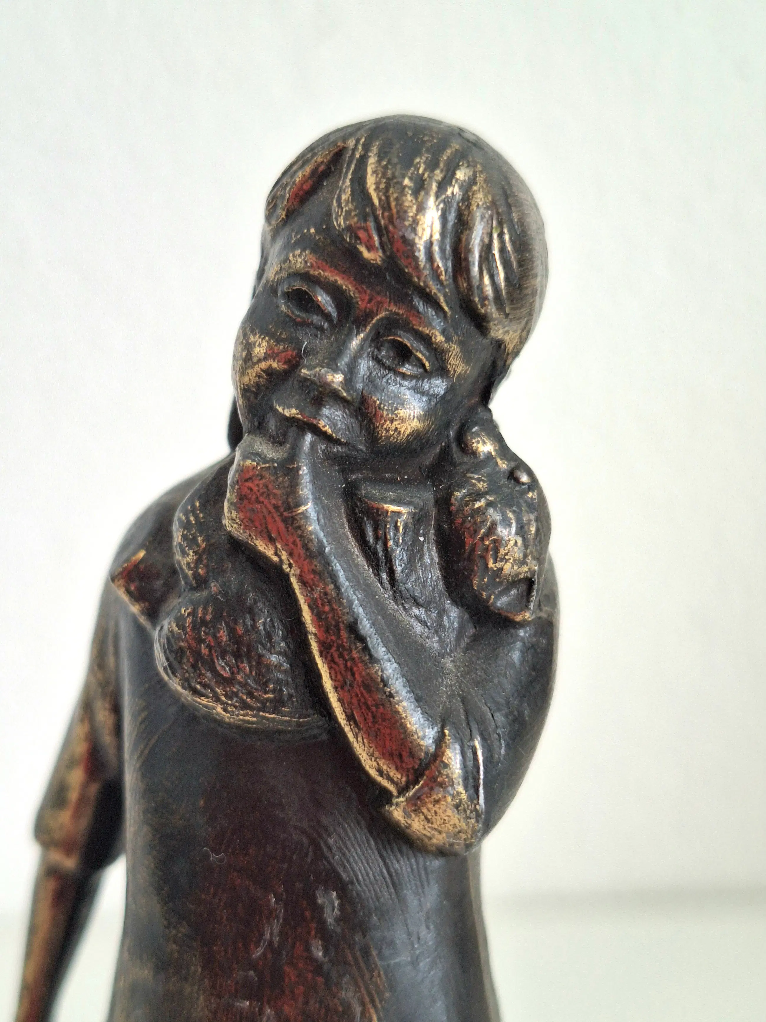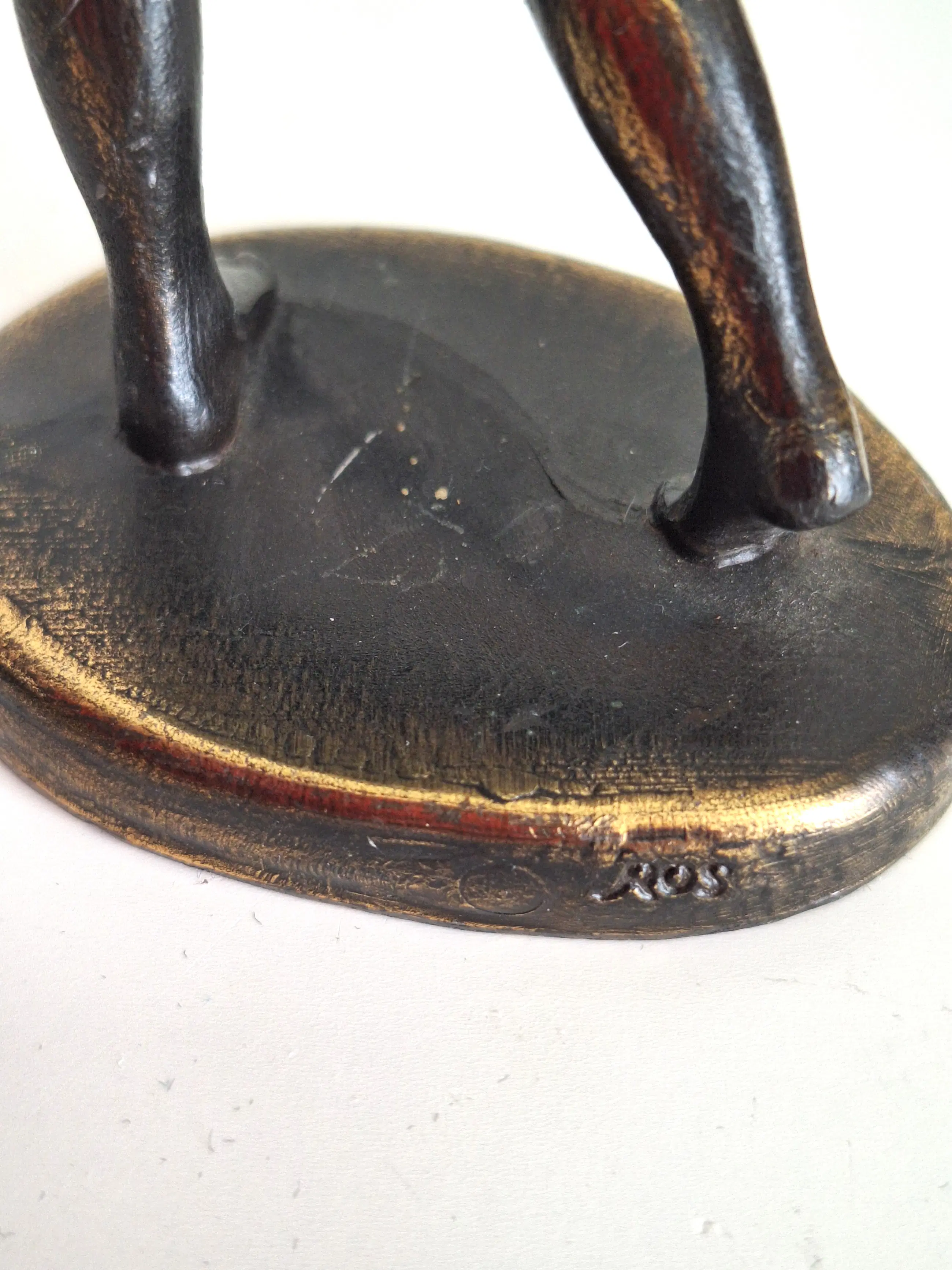 Het beeldje is verbronsd en heeft een fraai patina. Het heeft een expressieve en gedetailleerde uitstraling.
