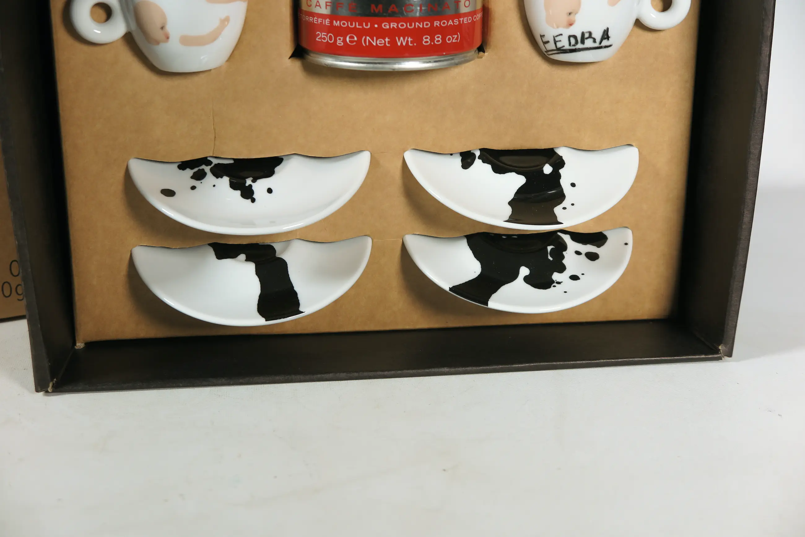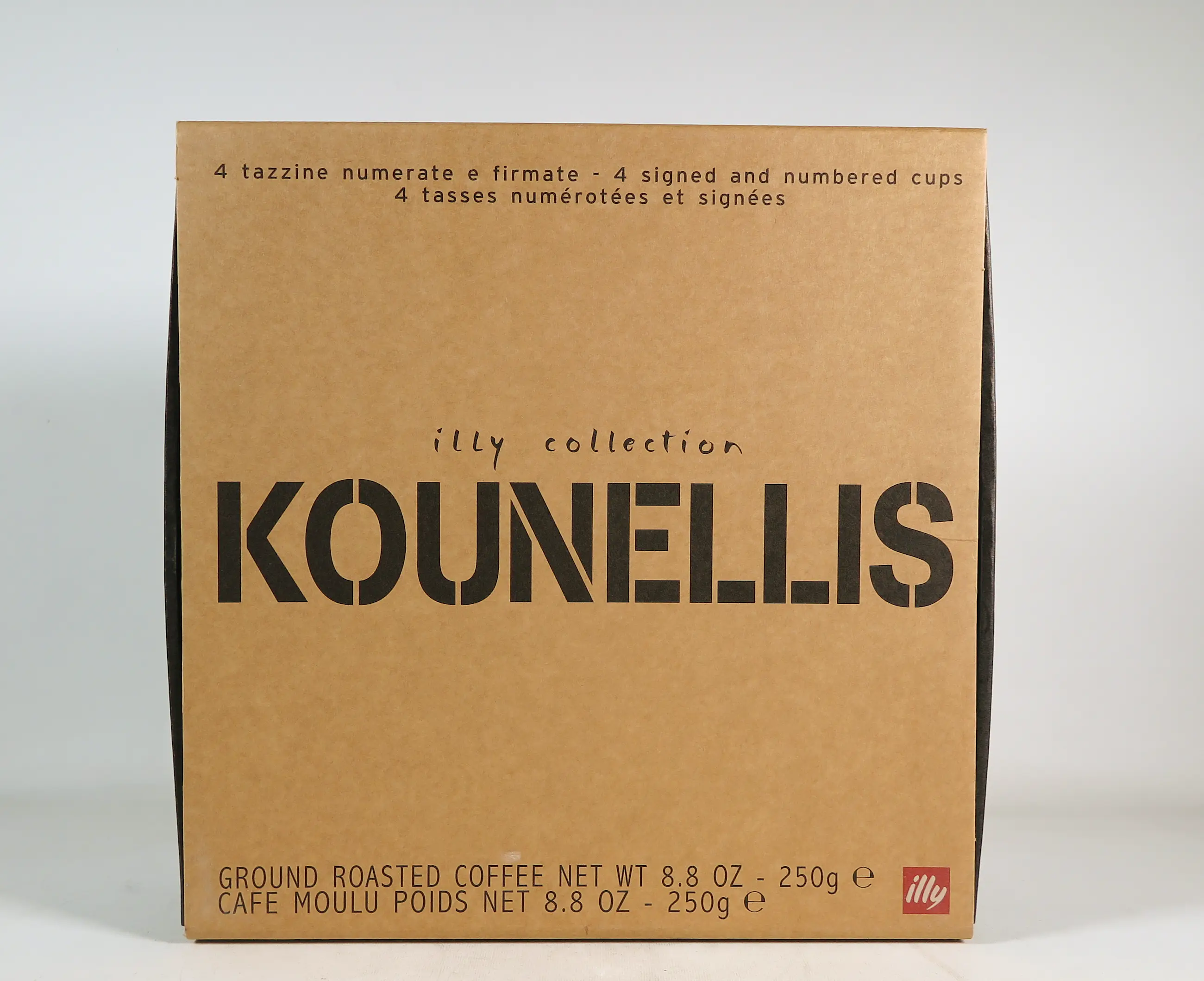 Ontworpen door Jannis Kounellis voor het koffiemerk Illy, een 4-persoons porseleinen espresso-set, bestaande uit vier kopjes, vier schoteltjes en een blik met koffie.
