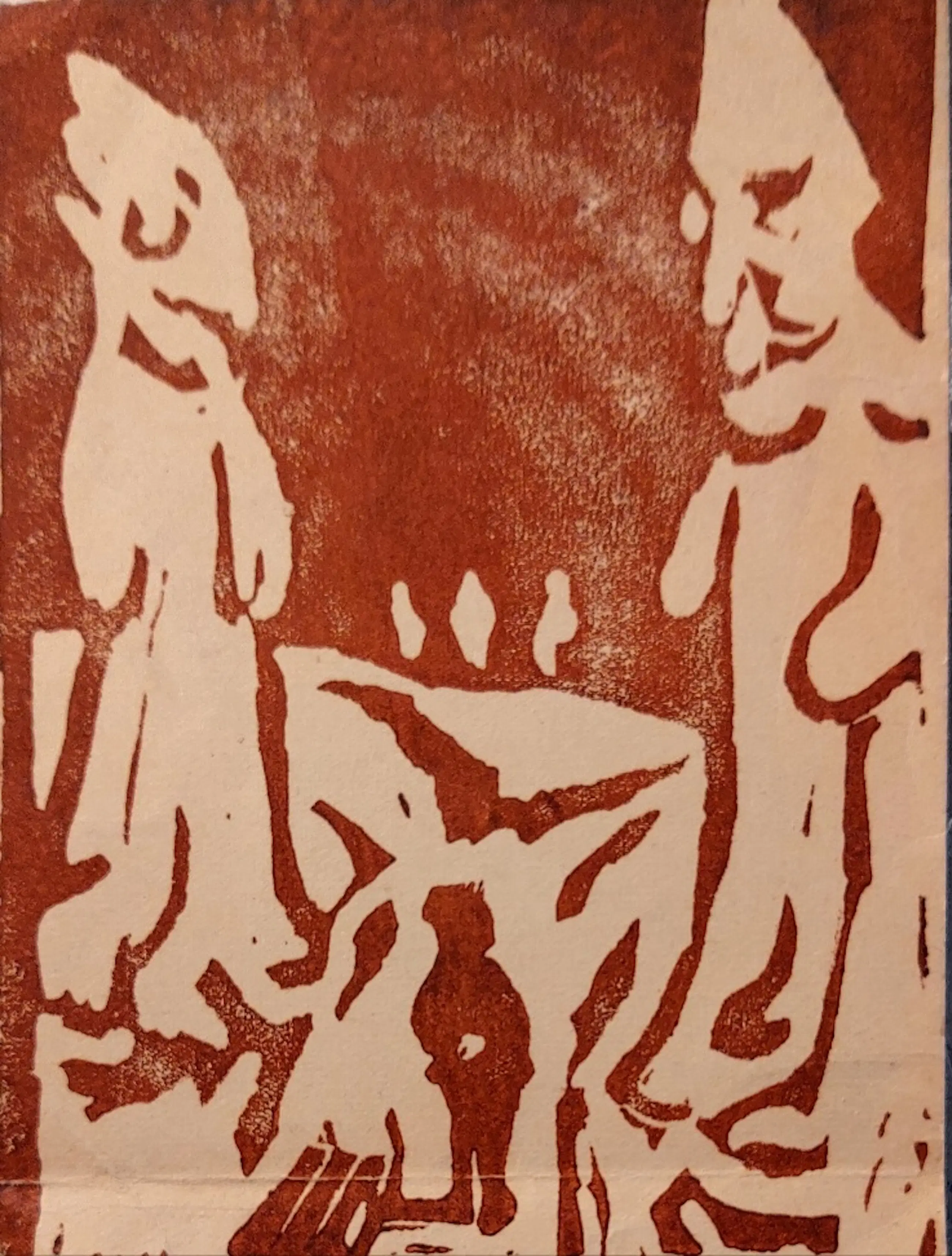 Hout of linosnede, aan de achterzijde in potlood gesigneerd/geschreven. Onderste randje is omgevouwen geweest, ook een plakbandrestje aan de achterzijde