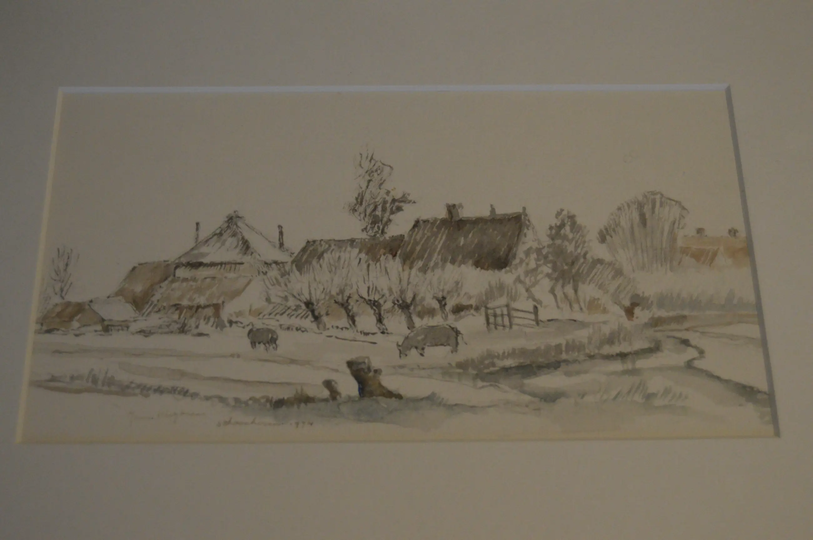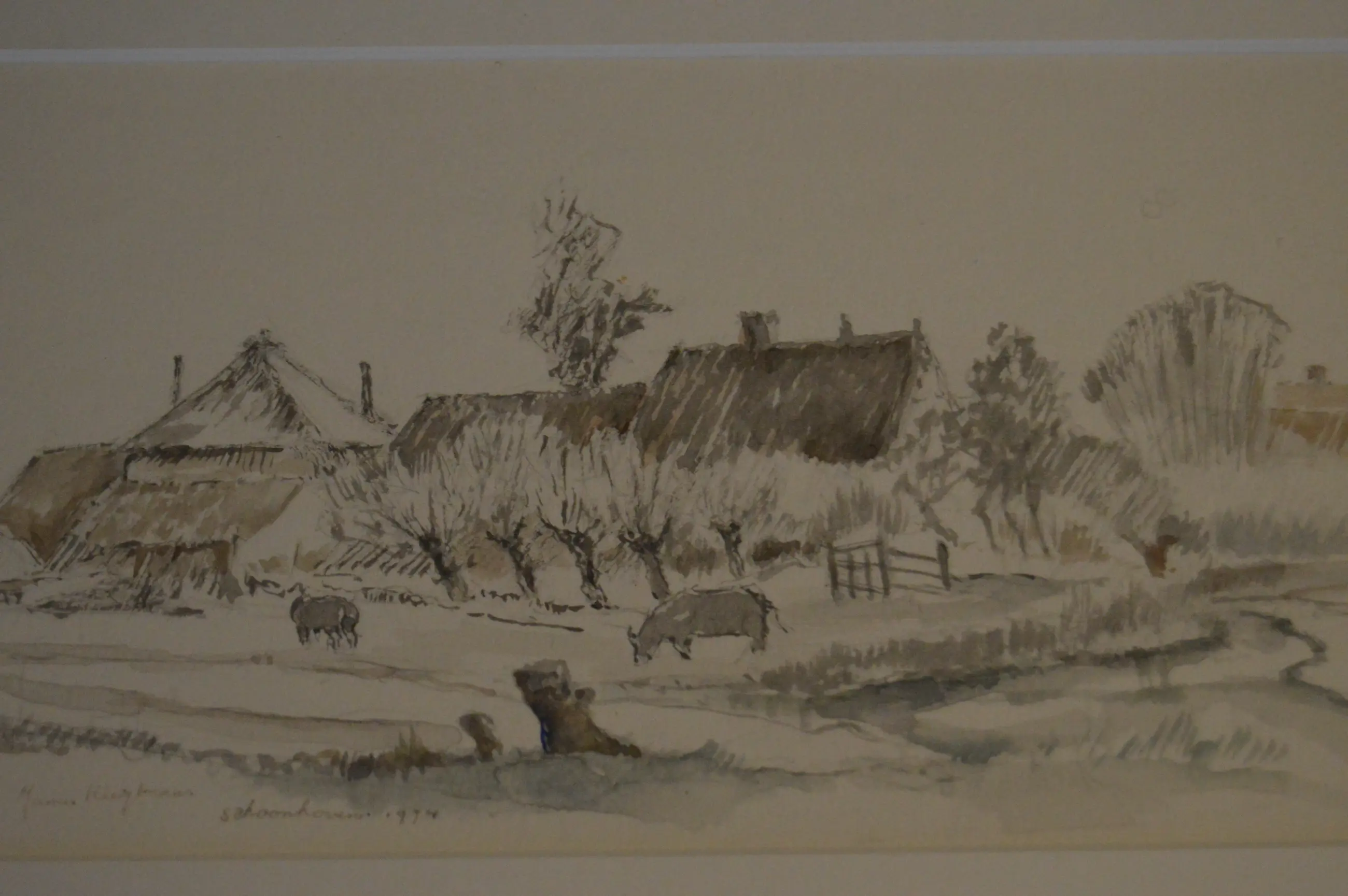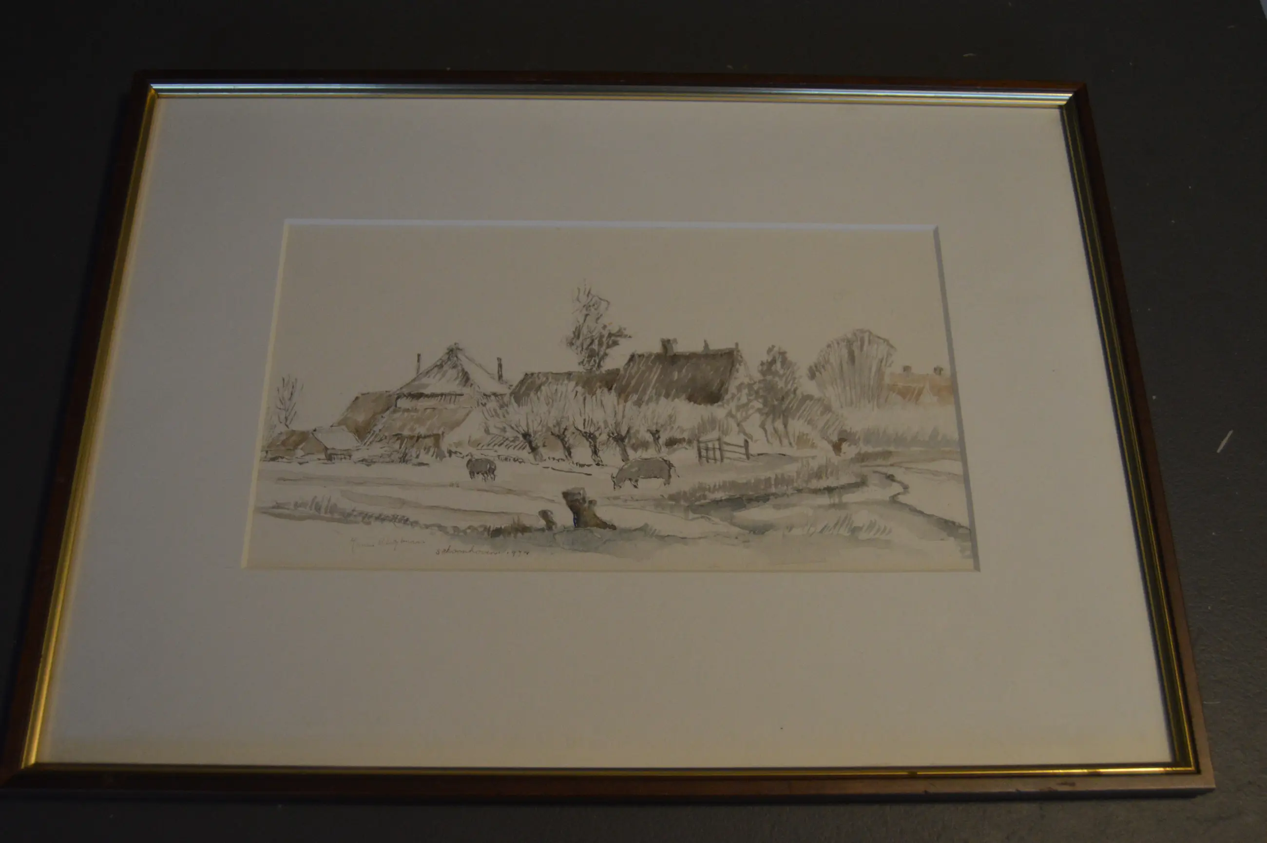 Landschap in de plaats Schoonhoven. Gemengde techniek. Ingelijst achter glas. Gesigneerd voluit linksonder in het werk. Daarnaast titel; Schoonhoven.