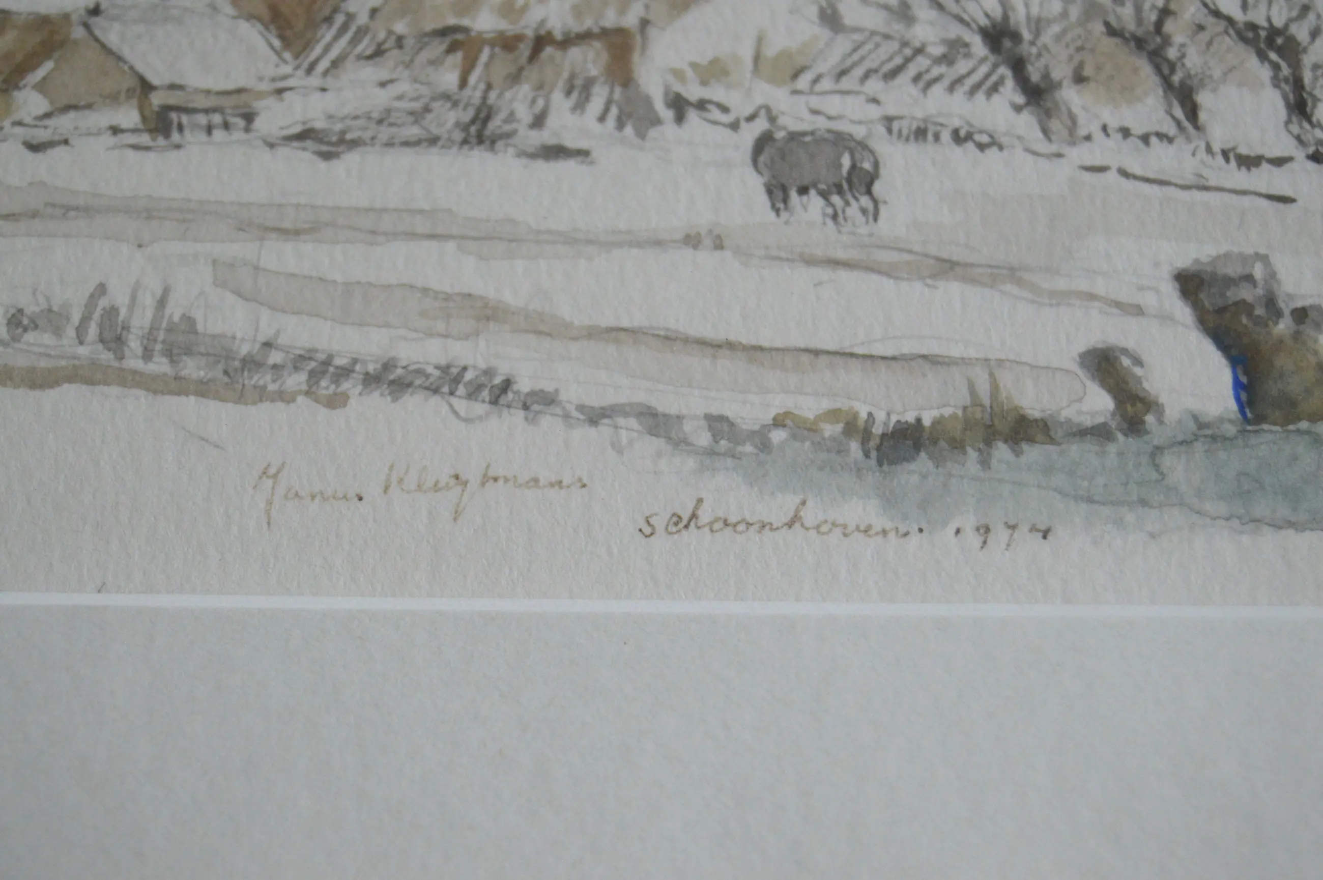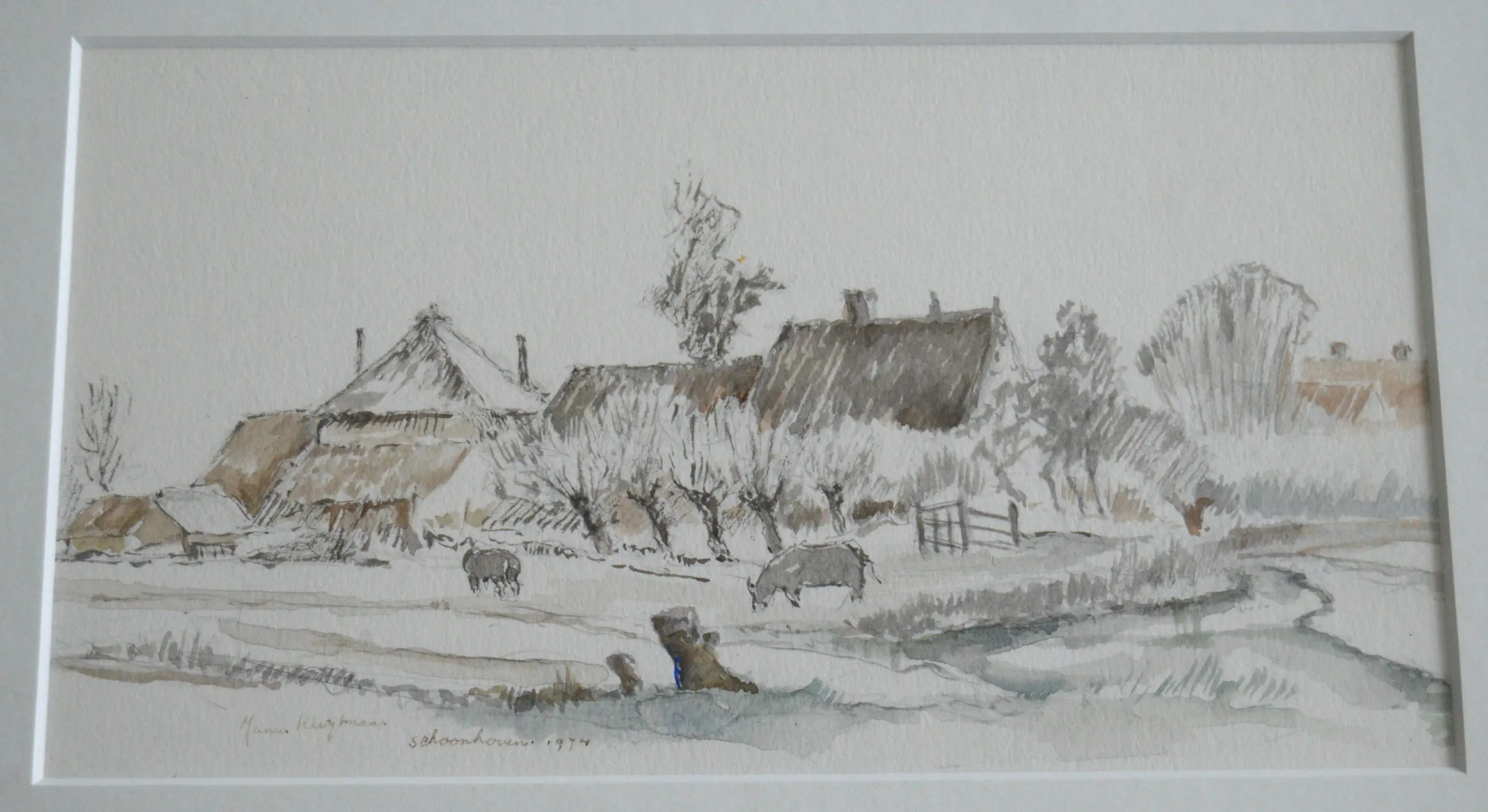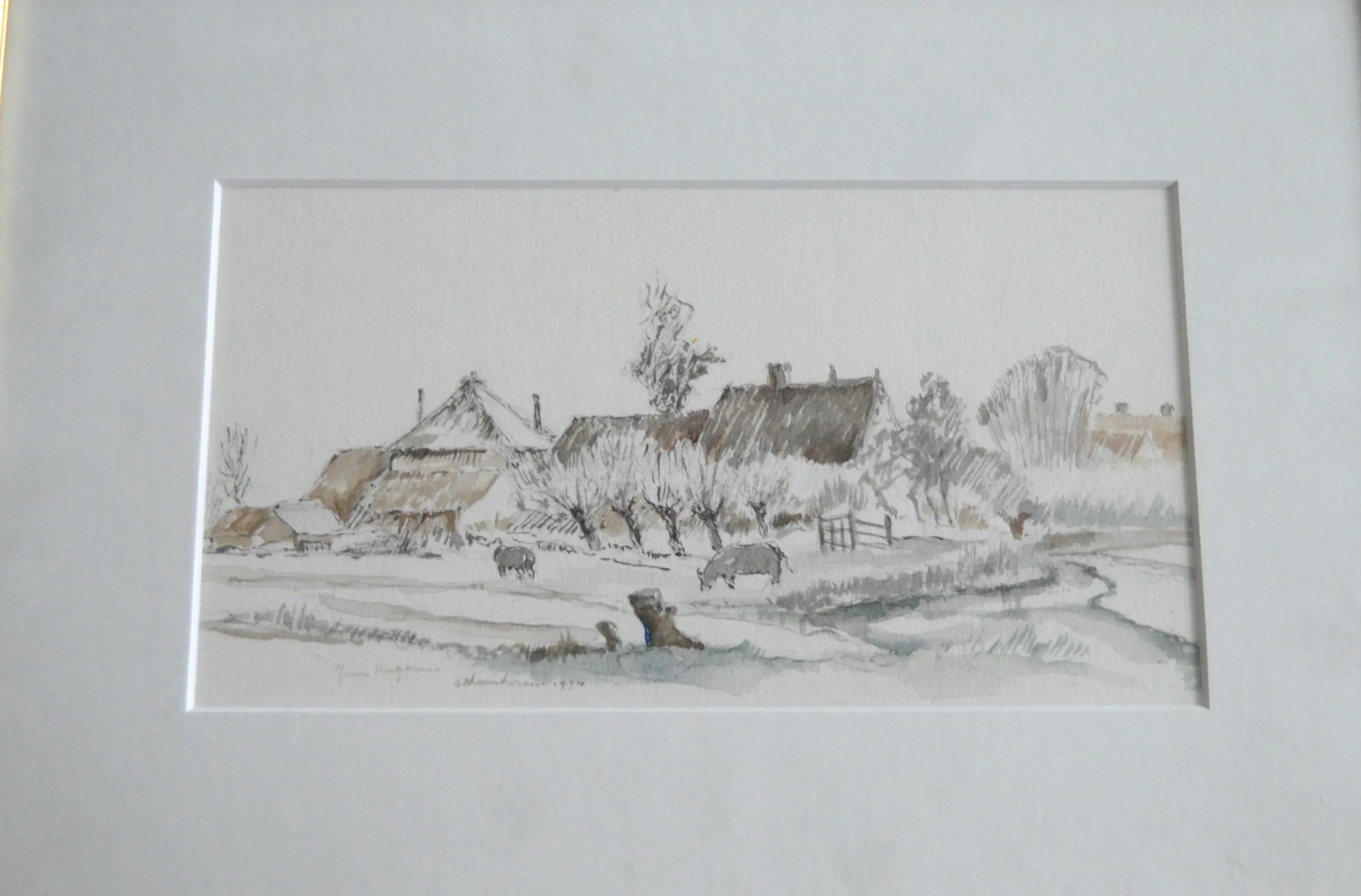 Schoonhoven. Gemengde techniek; een landschap in de plaats Schoonhoven. Gesigneerd linksonder in het werk. Datum; 1974. Titel; 'Schoonhoven'