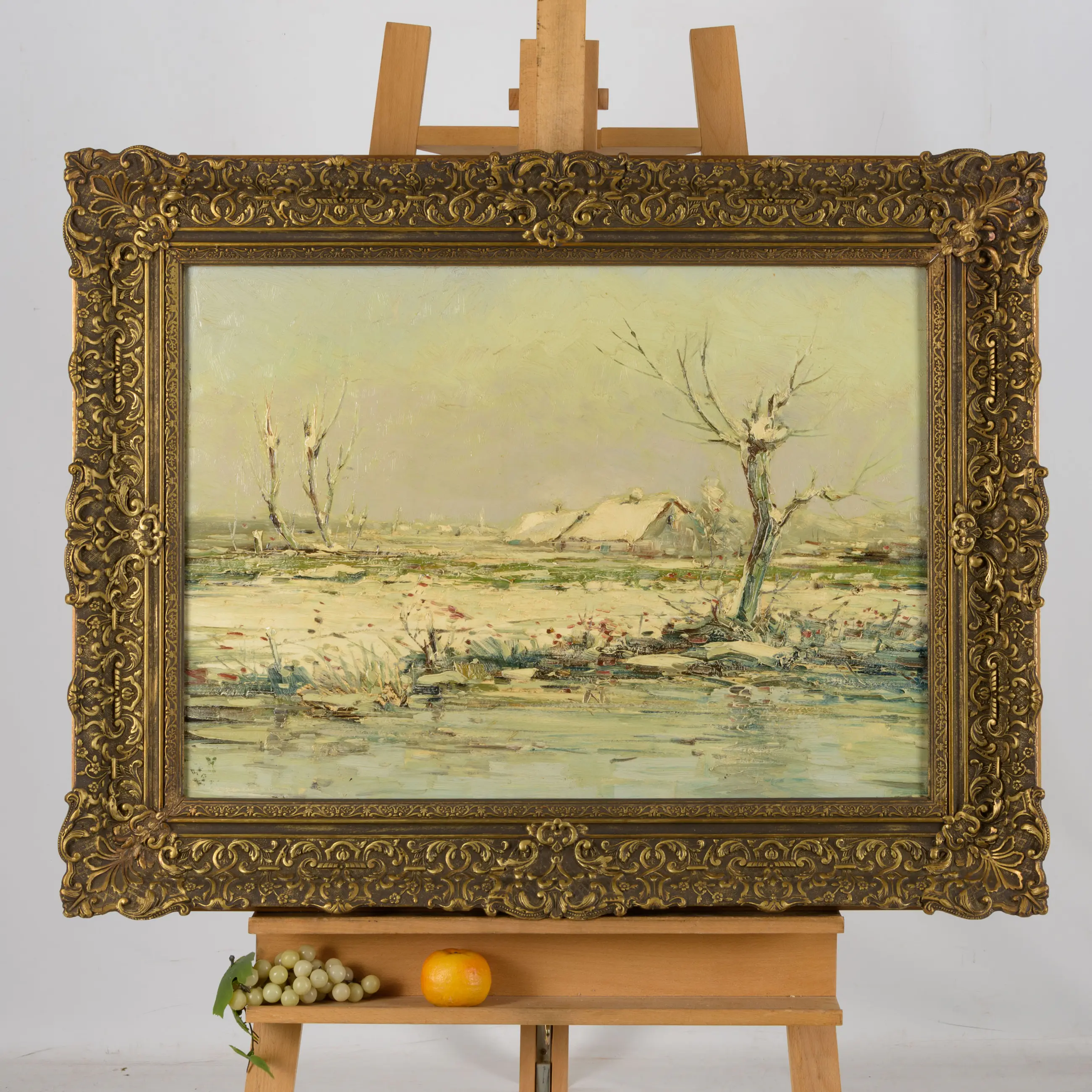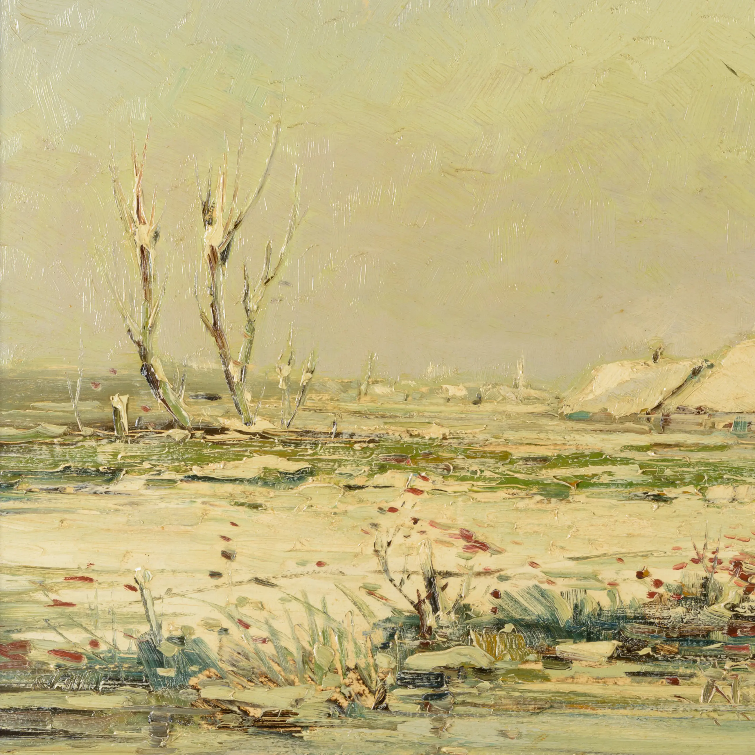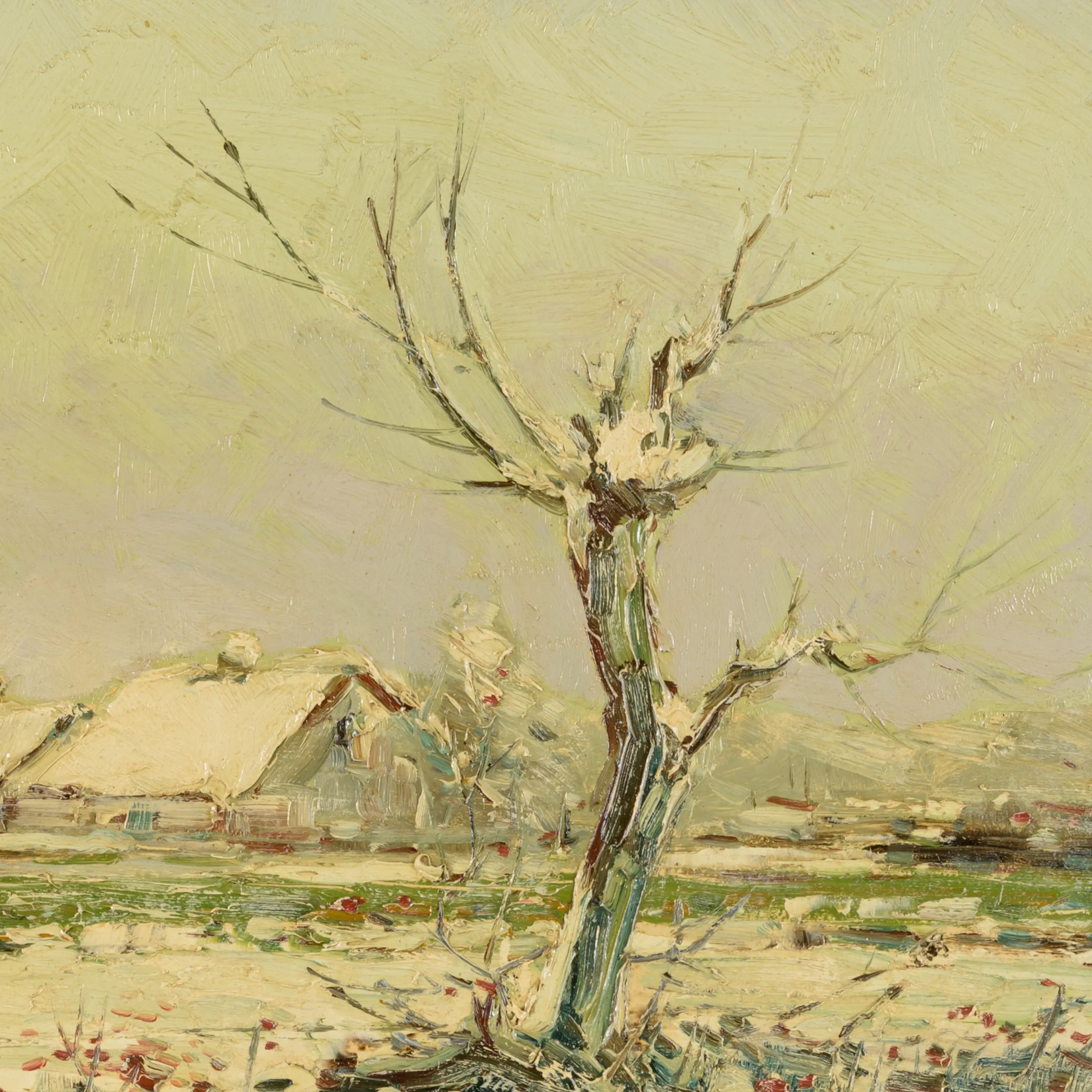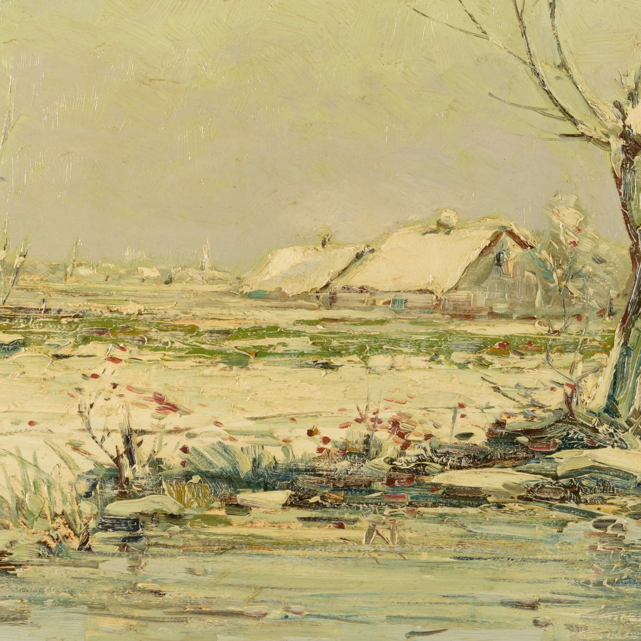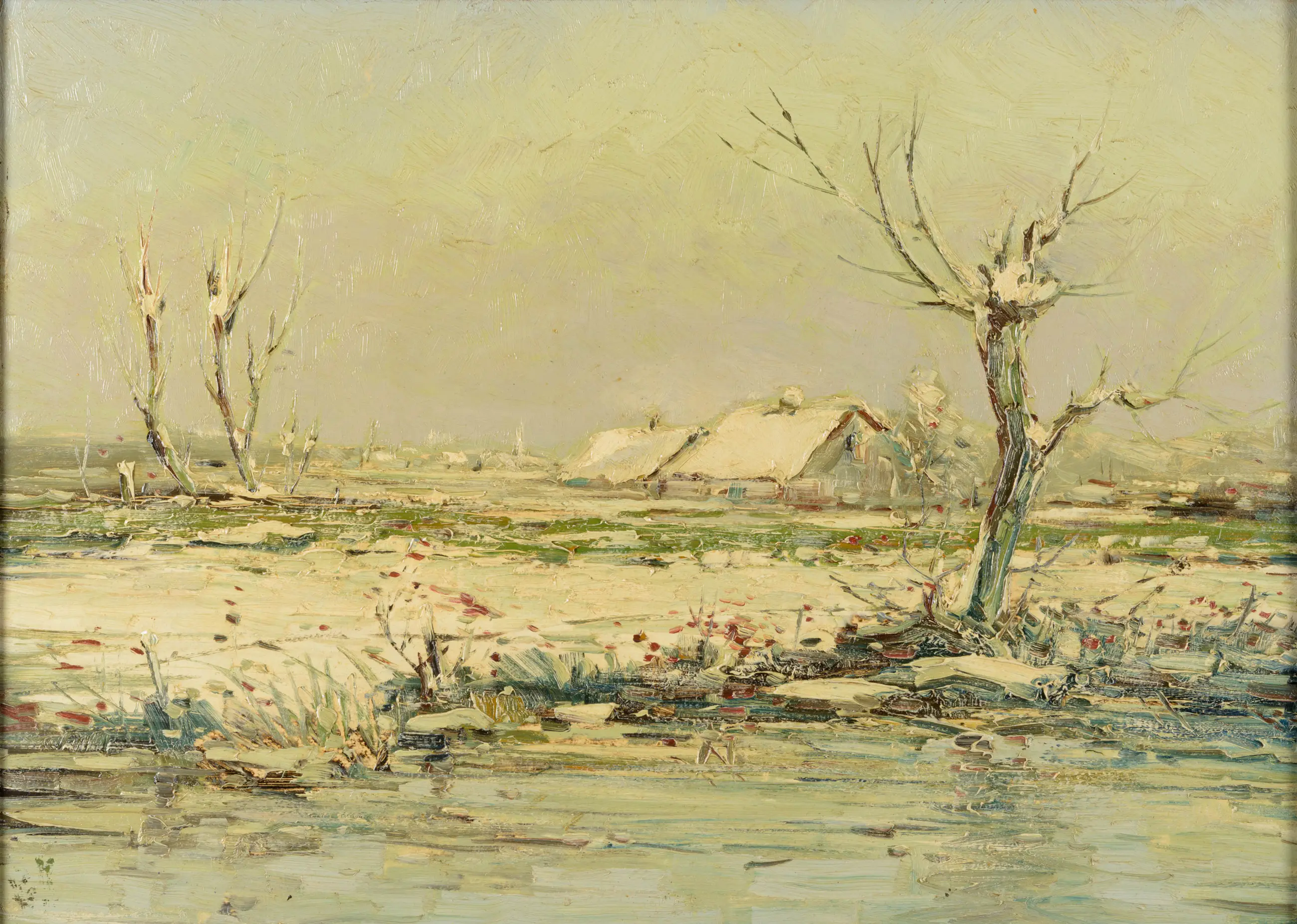Een mooi impressionistisch winterlandschap. Het is gemaakt door Janus (Adrianus) Sibens (1906-1964). Hij was een schilder afkomstig uit het Brabantse dorp Wouw. Aanvankelijk was hij een bakkersleerling, maar toen hij 24 was begon hij met kunstschilderen. Sibens' werk kenmerkt zich door een duidelijk impressionistische stijl. Hij maakt overtuigend gebruik van kleuren en heeft een licht speelse toets. Sibens' oeuvre bestaat voornamelijk uit landschapsvoorstellingen en interieurs.