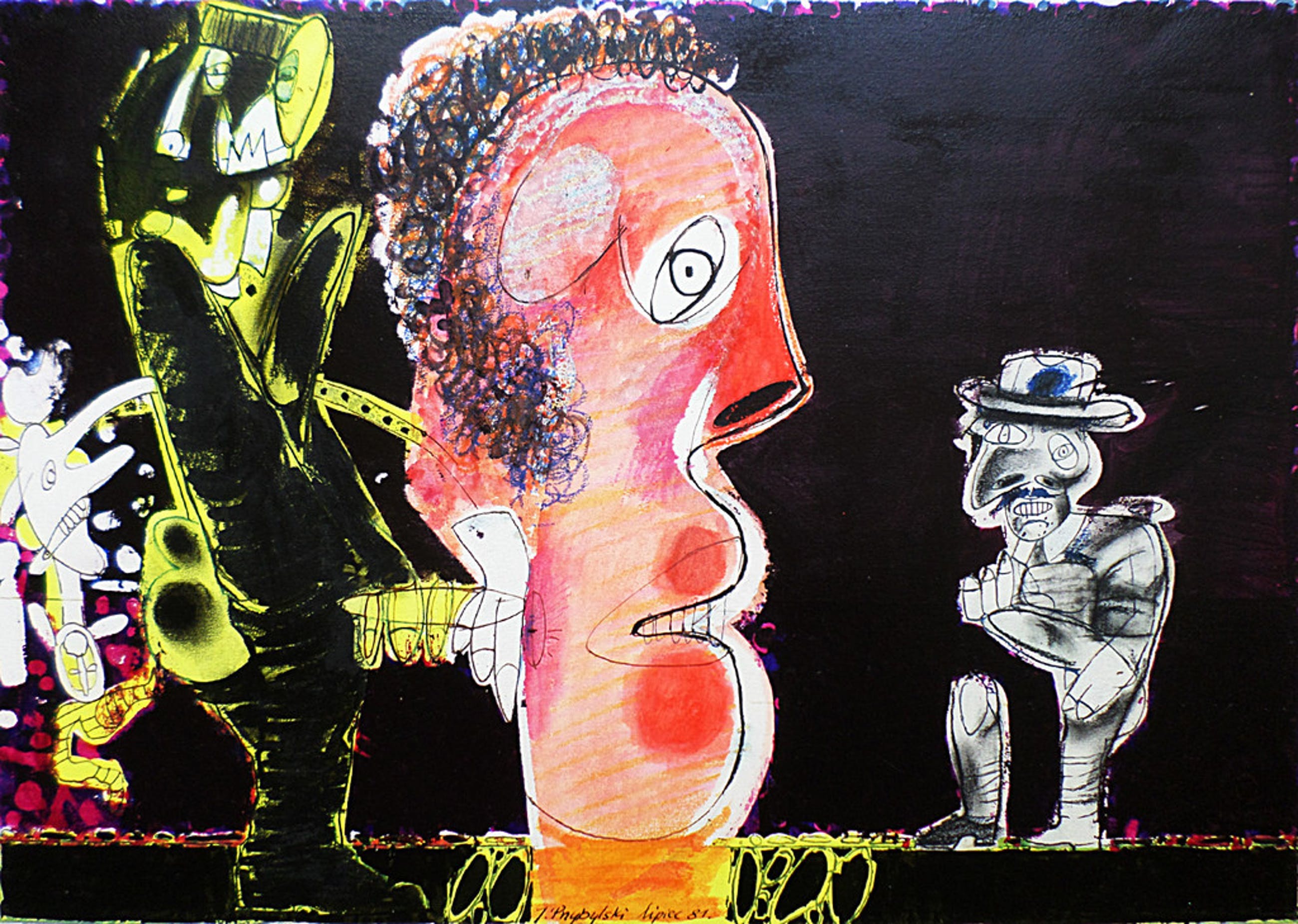 Steeds meer Poolse medelanders, dan moet er ook meer Poolse kunst in Nederland te koop zijn. Waarvan akte; mooi werk van de internationaal gerenommeerde kunstenaar Janusz Przybylski; kort door de bocht een Poolse Lucebert.