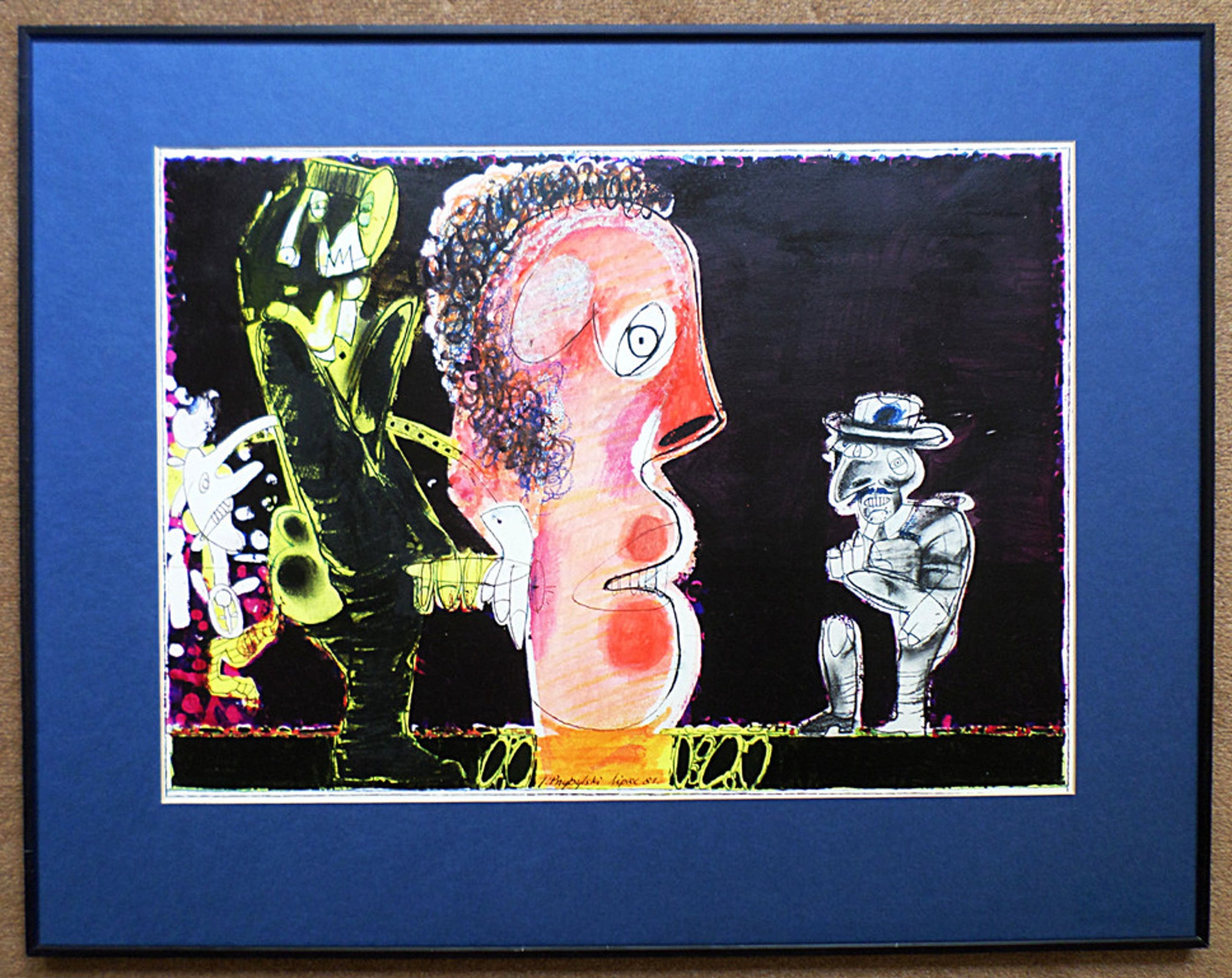 Unica, gemengde techniek op zwaar, geschept papier in mooie strakke lijst, achter glas en passe-partout. Handgesigneerd en gedateerd; “Lipiec 81” is “Juli 81” in het pools.