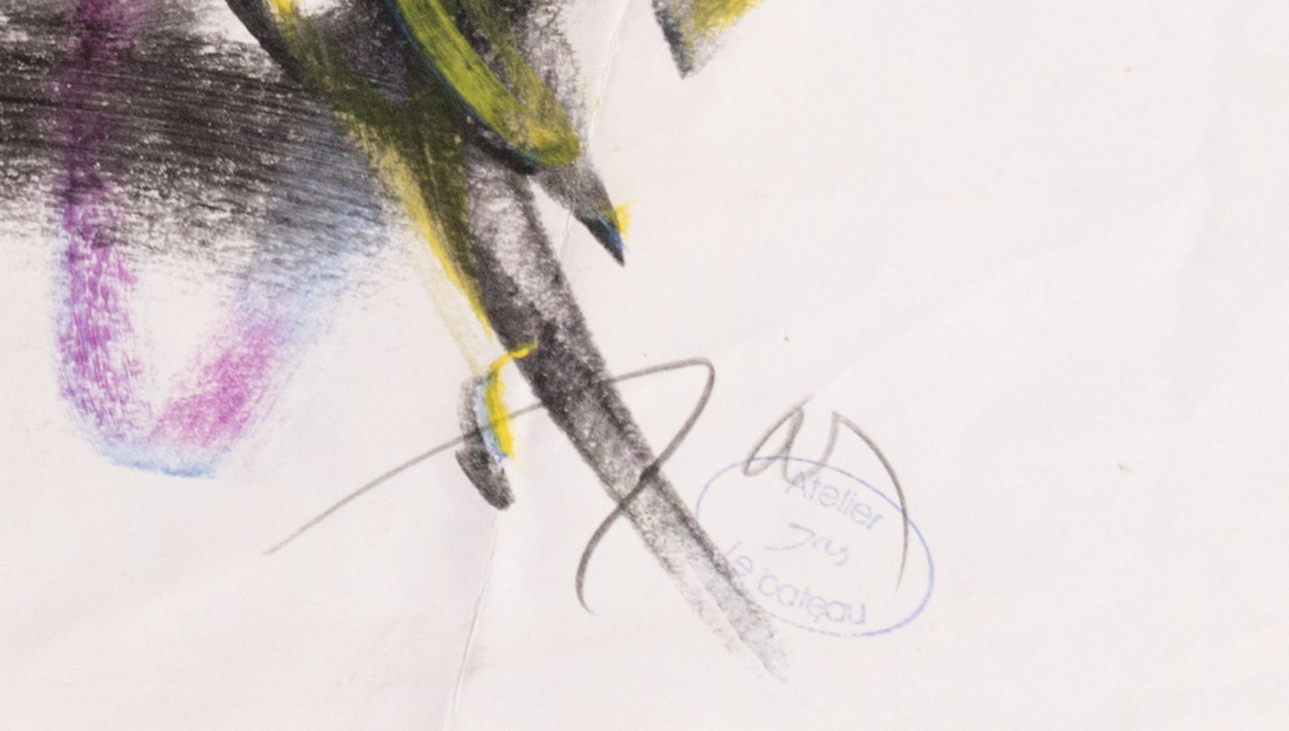 Getekend met het speciaal door JAS ontwikkelde Clowny-krijt, meerkleurig krijt wat bij elke hoek en elke beweging een ander effect sorteert. Ook Karel Appel en Willem de Kooning hebben later gebruik gemaakt van zijn krijt.