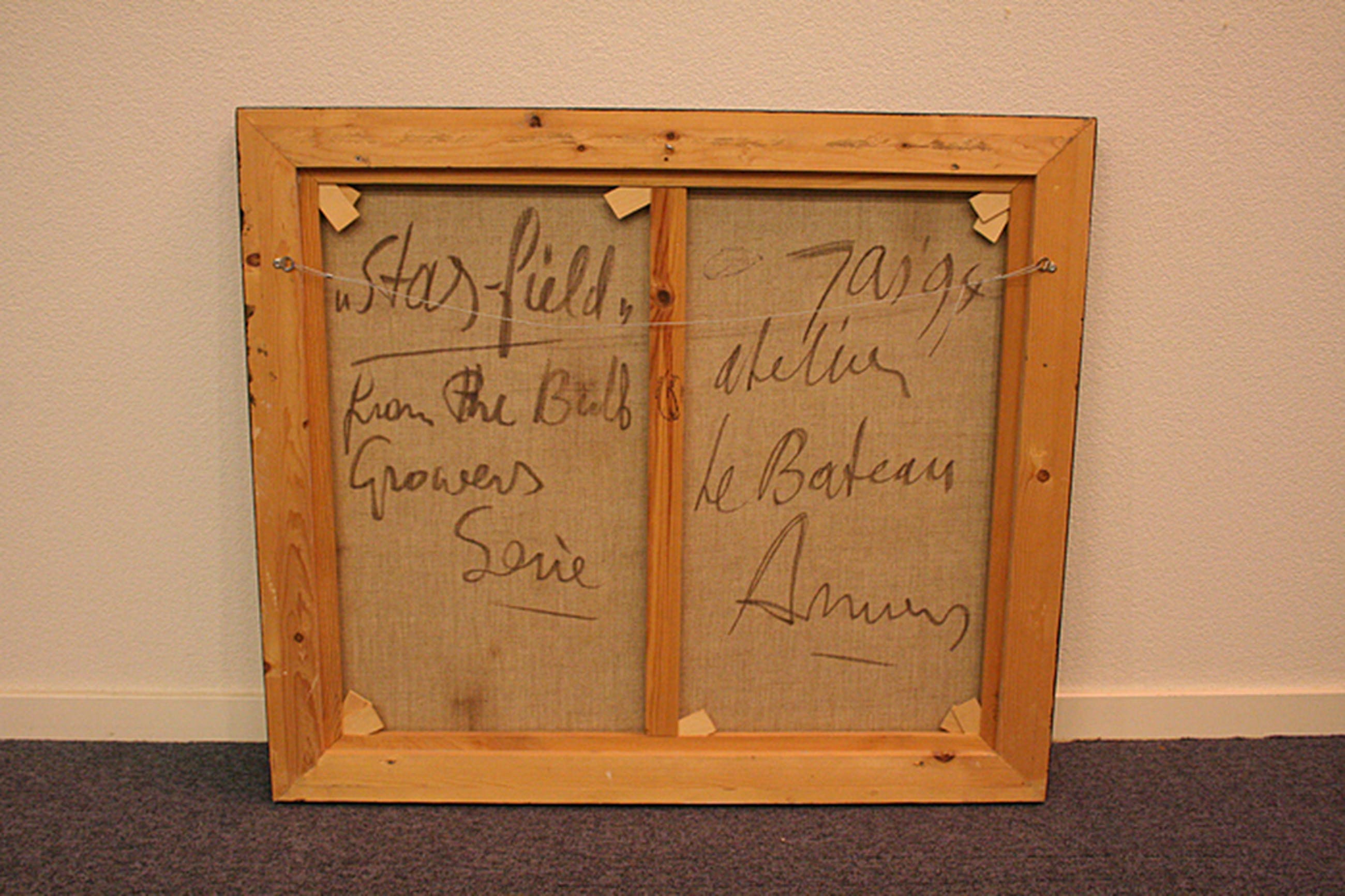 Schilderij op doek van JAS uit 1994. Gesigneerd links onder. Afm.: 60 x 70 cm. Titel: "Stas-field". Origineel schilderij met een abstracte voorstelling geïnspireerd door de bollenvelden. Ingelijst (baklijst).