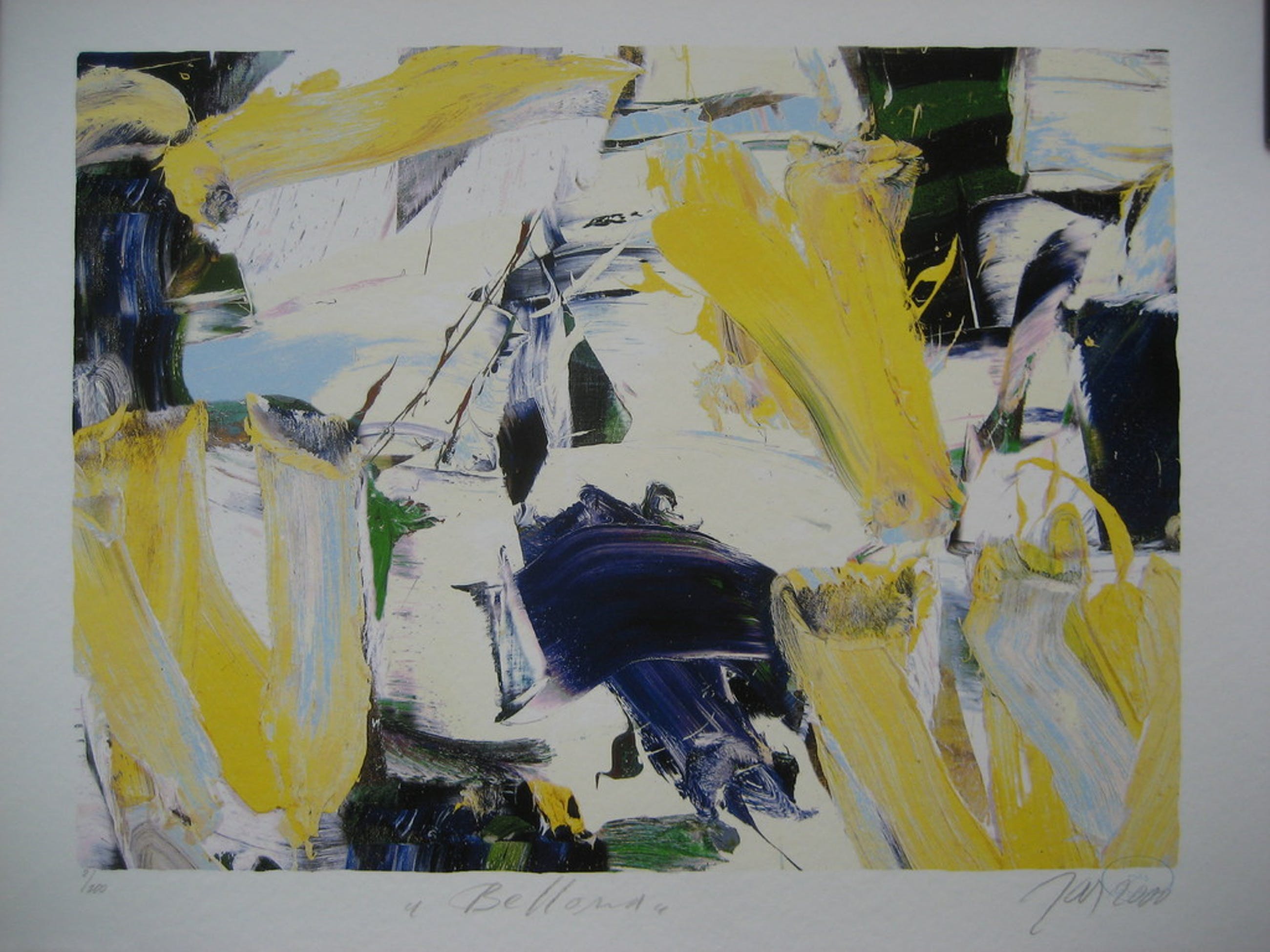 Deze prachtige zeefdruk is JAS ten voeten uit. Zijn gepassioneerde penseelvoering toont duidelijk verwijzingen naar- en verwantschap met- Willem de Kooning en Karel Appel.