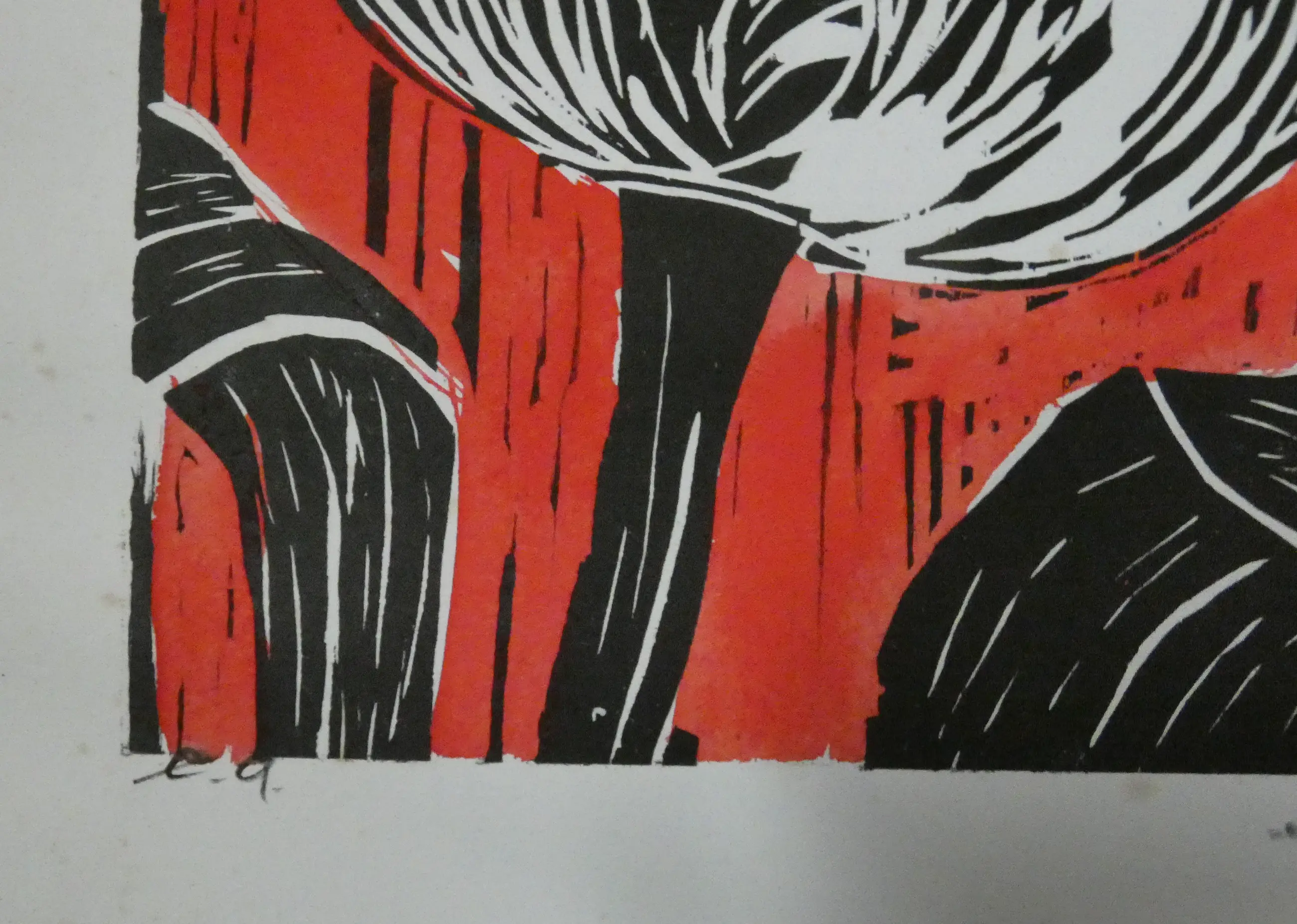 Een bijzonder krachtige houtdruk van Jas. Het is zijn onmiskenbare herkenbare stijl.