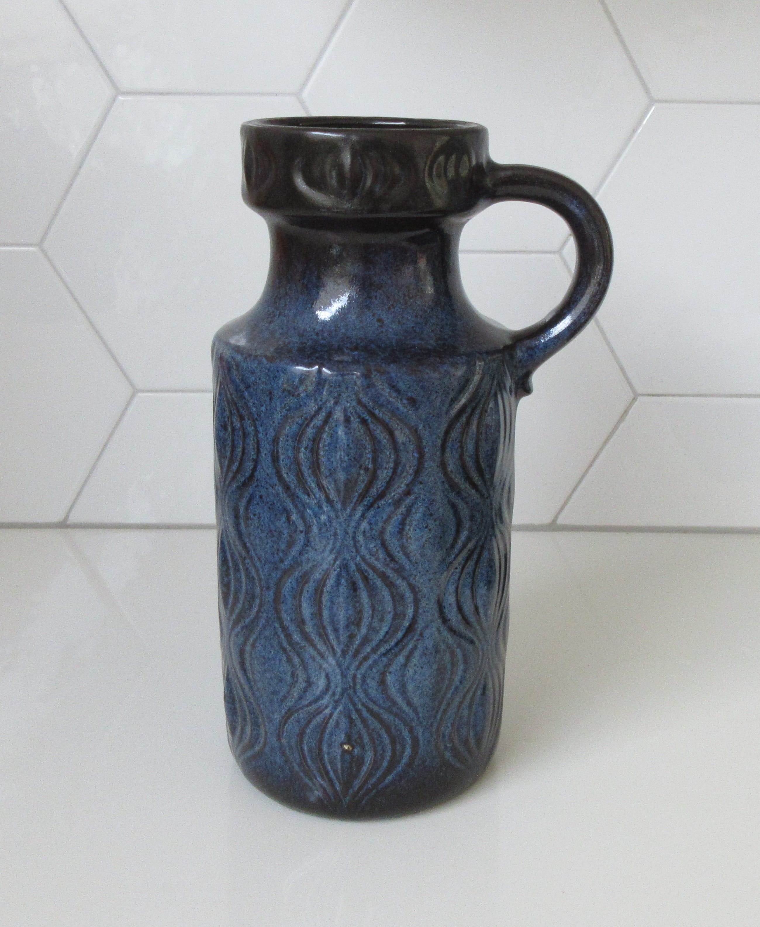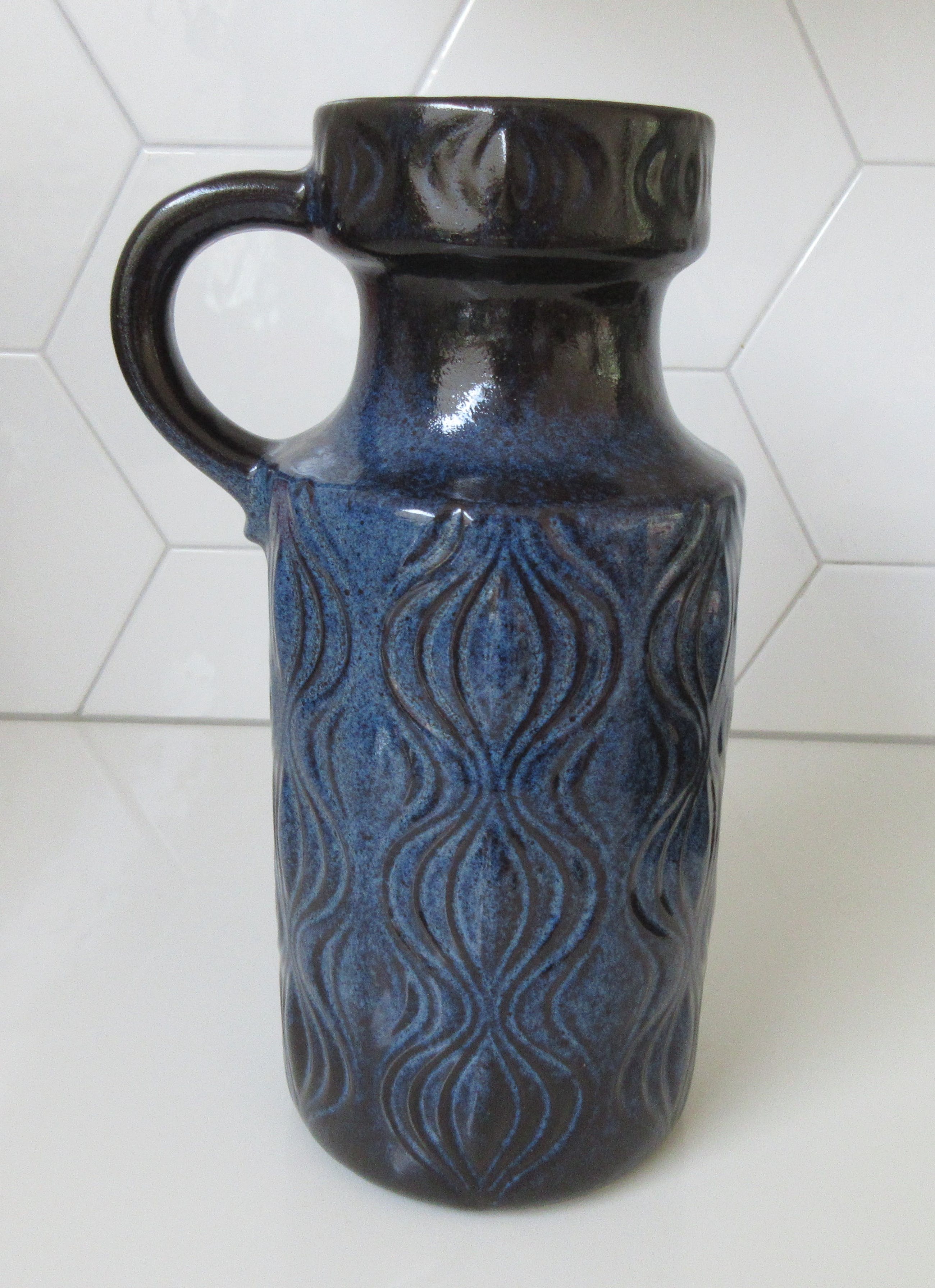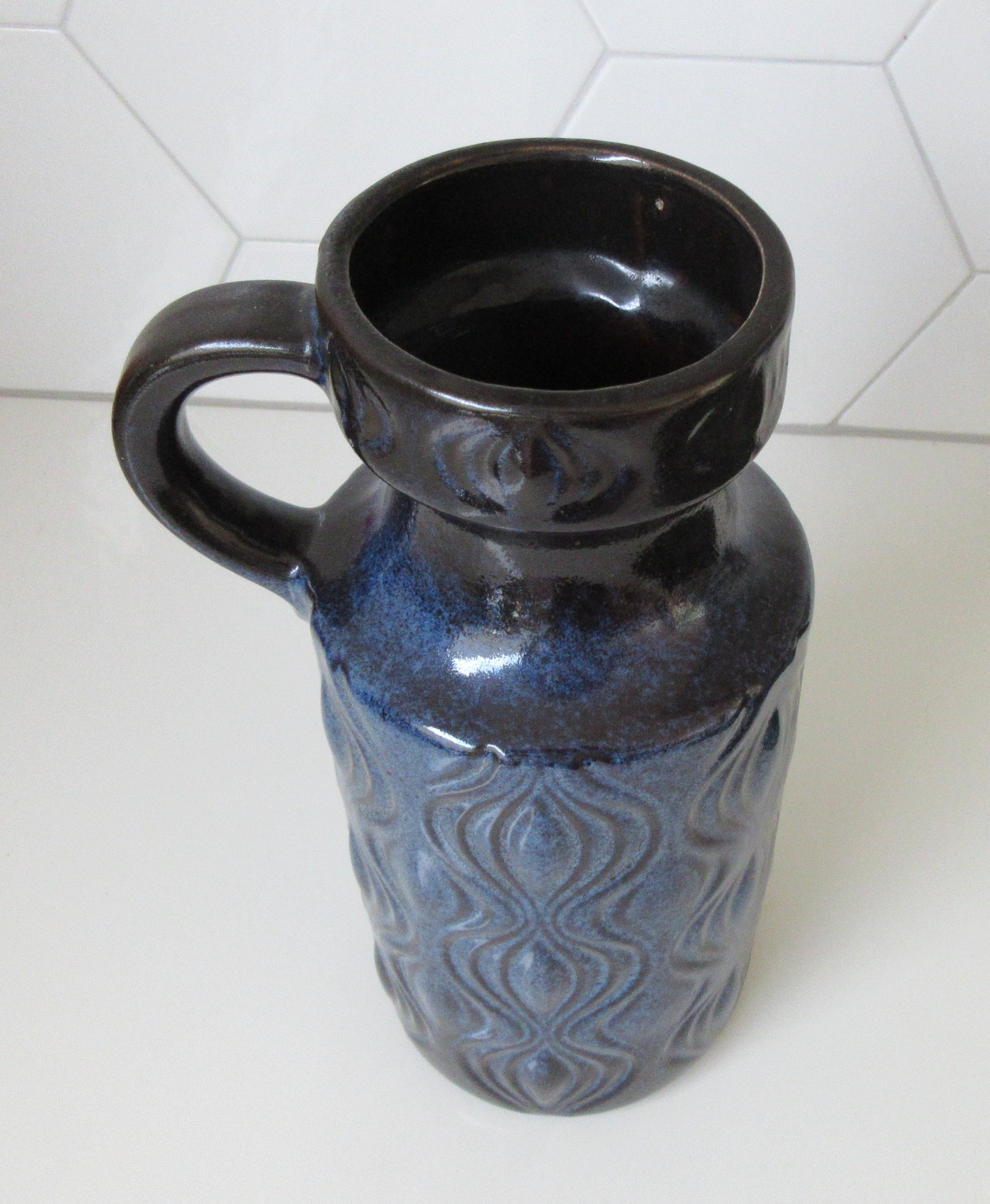 Blauw zwarte kruikvaas Amsterdam a.k.a "Ui" (modelnr 485). In prima onbeschadigde conditie. Ingedrukt nr op de bodem + W Germany. Afmetingen; 27 cm hoog, 12 cm diameter.