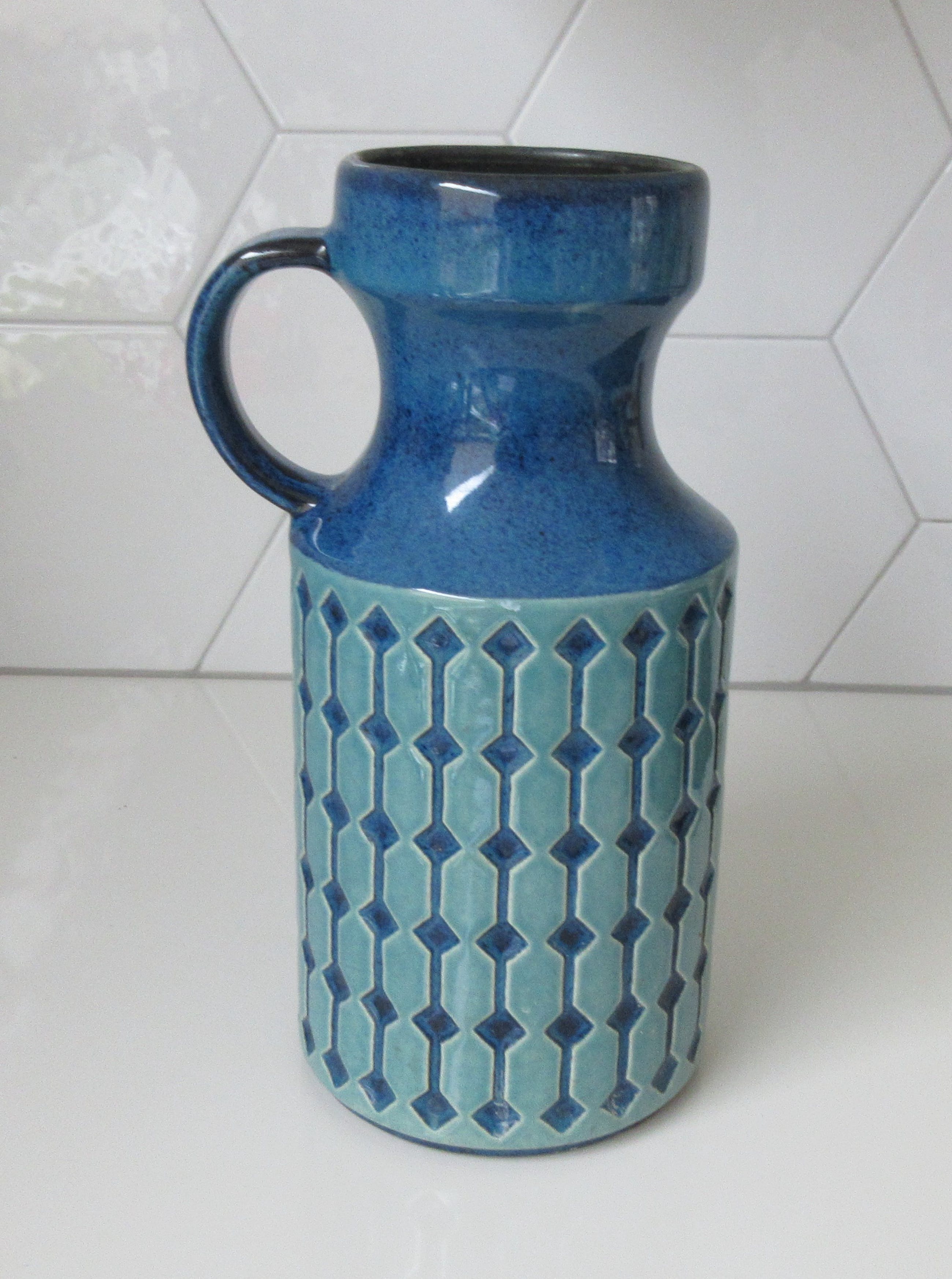 Blauw turqoise kruikvaas modelnr 1640-28 van Jasba. In zeer goede conditie heeft op de voetring twee minimale fleebites. Ingedrukt merk en nummer op de bodem. Afmetingen; 28 cm hoog, 13 cm diameter.
