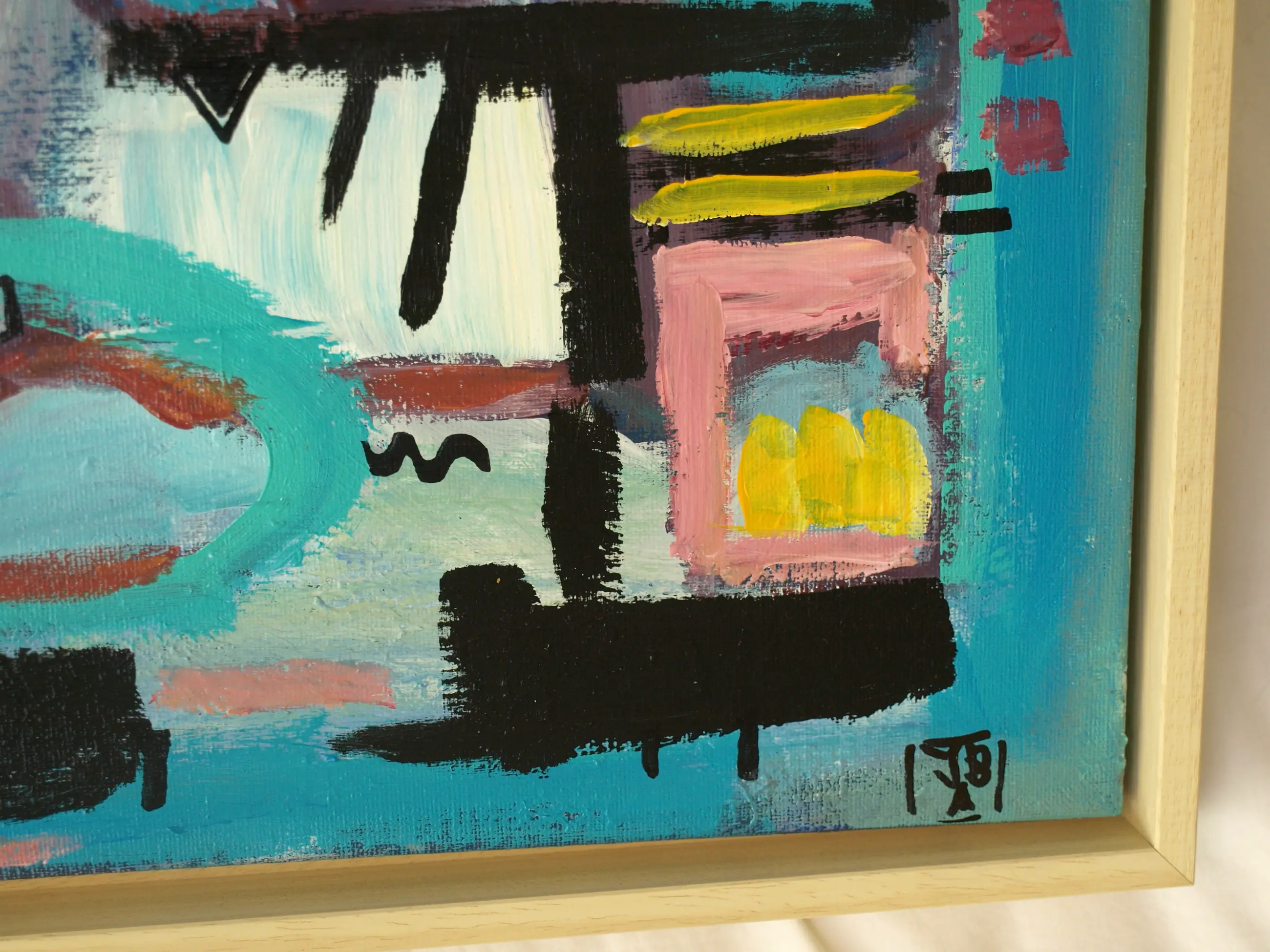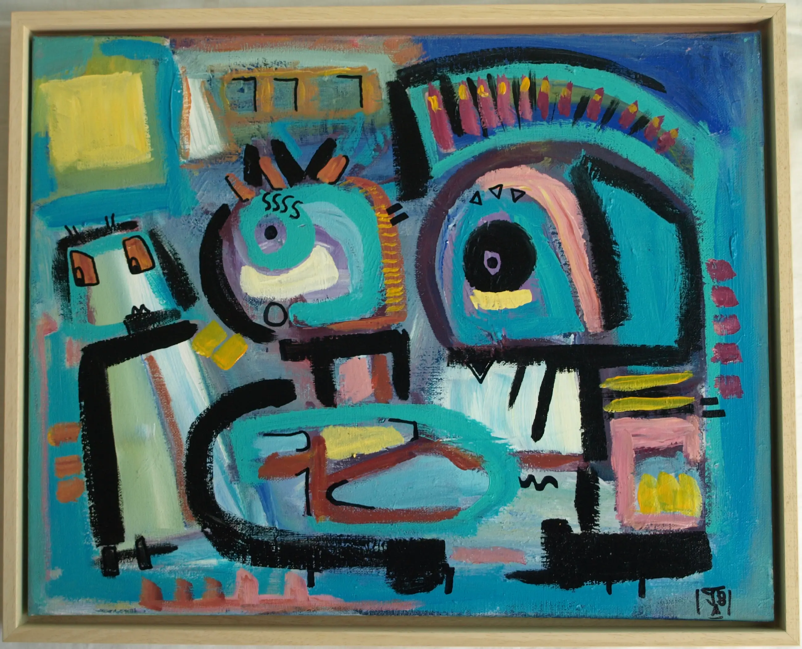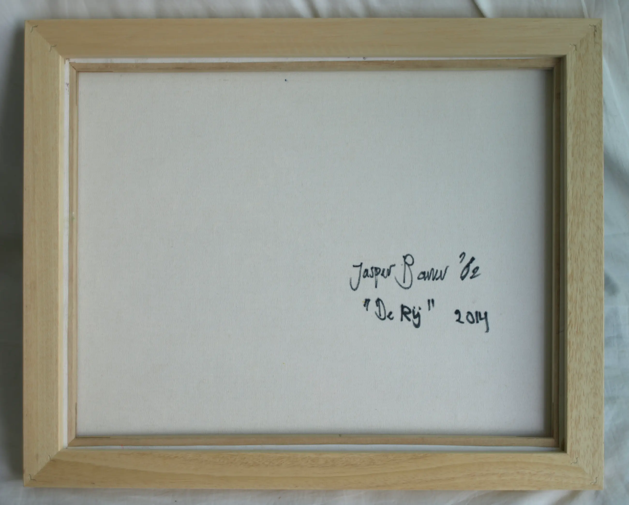 Een schilderij uit 2014 van de Amsterdamse kunstenaar Jasper Banen (1962), getiteld “De Rij”. -Techniek: acrylverf op doek, gevernist en opgespannen op een houten spieraam. -Ingelijst in een houten baklijst. -Gesigneerd rechtsonder in het werk met het monogram van de kunstenaar en ook gesigneerd, gedateerd en getiteld op de achterkant van het doek. -Afmetingen: Lijst, 43 x 54 x 4 cm. Spieraam/beeld, 40 x 50 cm. -Herkomst: Uit het atelier van de kunstenaar. -Conditie: In zeer goede staat. Zie ook de foto’s. Kan zo aan de muur.