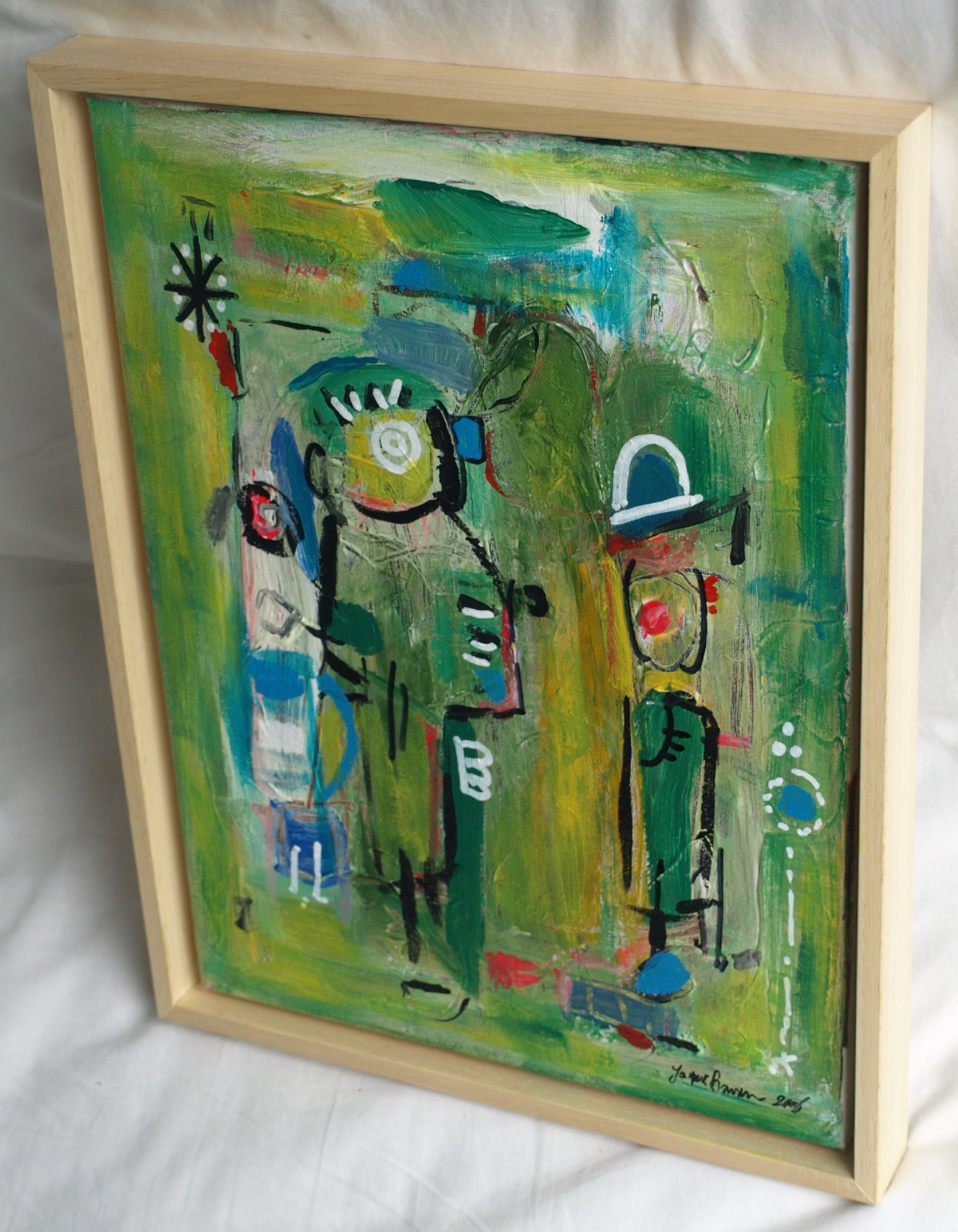 Een schilderij uit 2006 van de Amsterdamse kunstenaar Jasper Banen (1962), getiteld "De verhalenverteller". -Techniek: acrylverf op doek, opgespannen op een houten spieraam. -Ingelijst in een houten baklijst. -Gesigneerd en gedateerd rechtsonder in het werk en ook gesigneerd, gedateerd en getiteld op de achterkant van het doek. -Afmetingen: Lijst, 43 x 33 x 4 cm. Spieraam/beeld, 40 x 30 cm. -Herkomst: Uit het atelier van de kunstenaar. -Conditie: In zeer goede staat. Zie ook de foto’s. Kan zo aan de muur.
