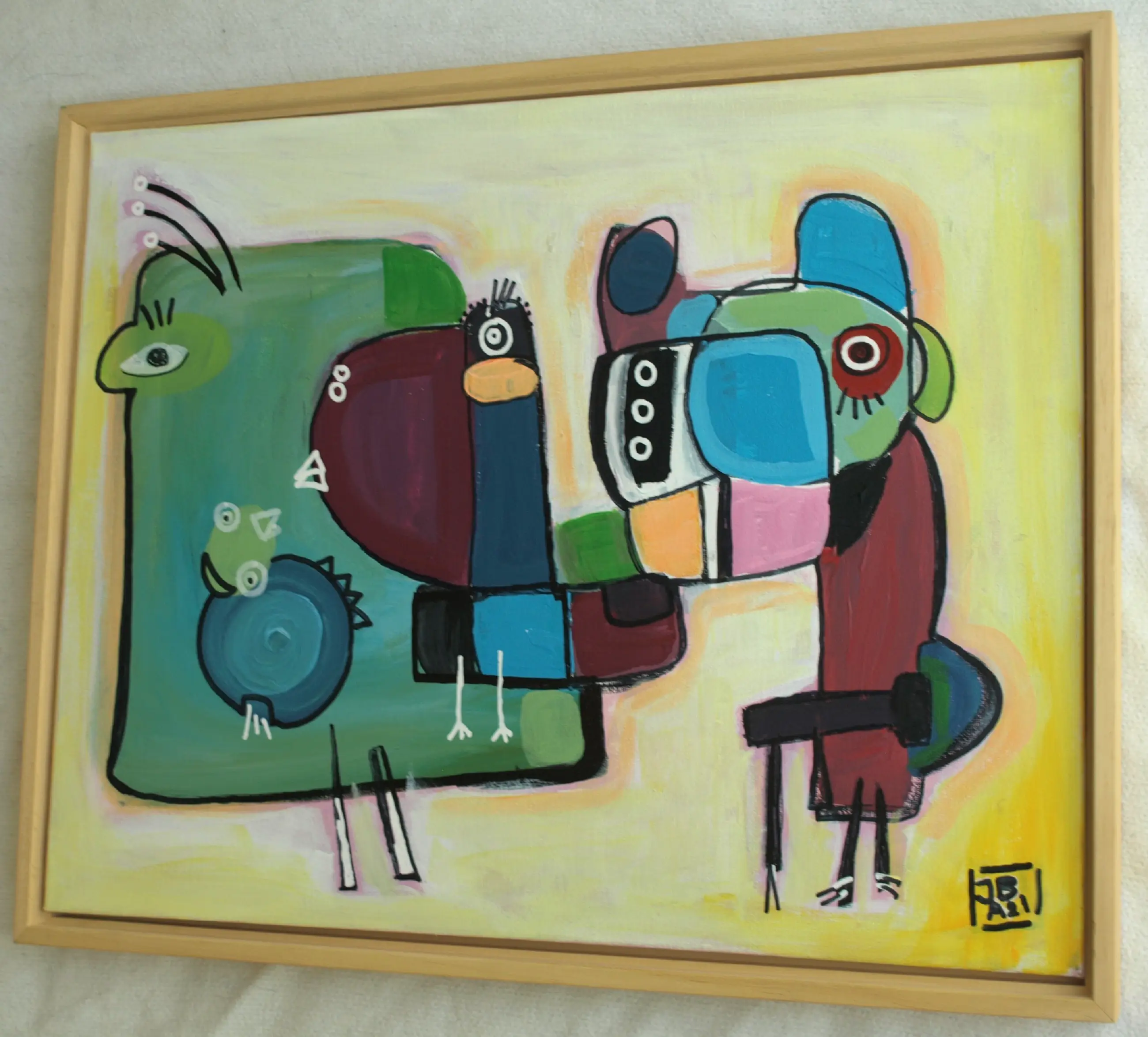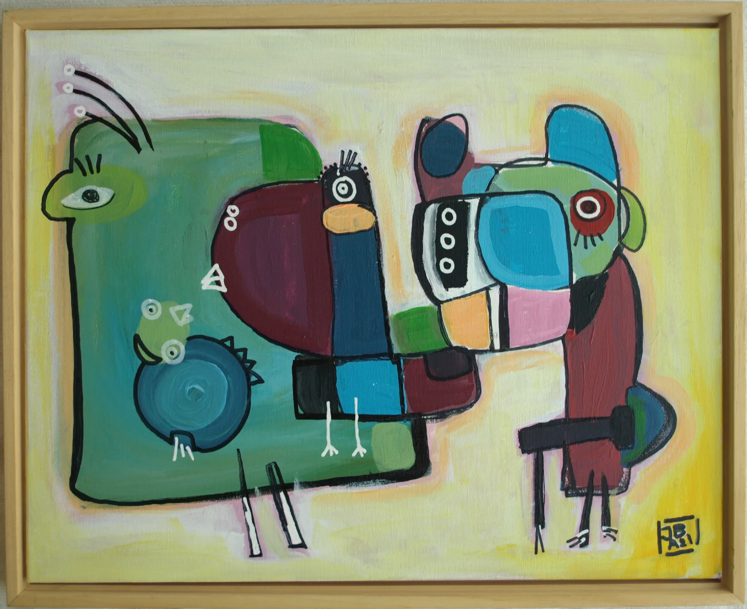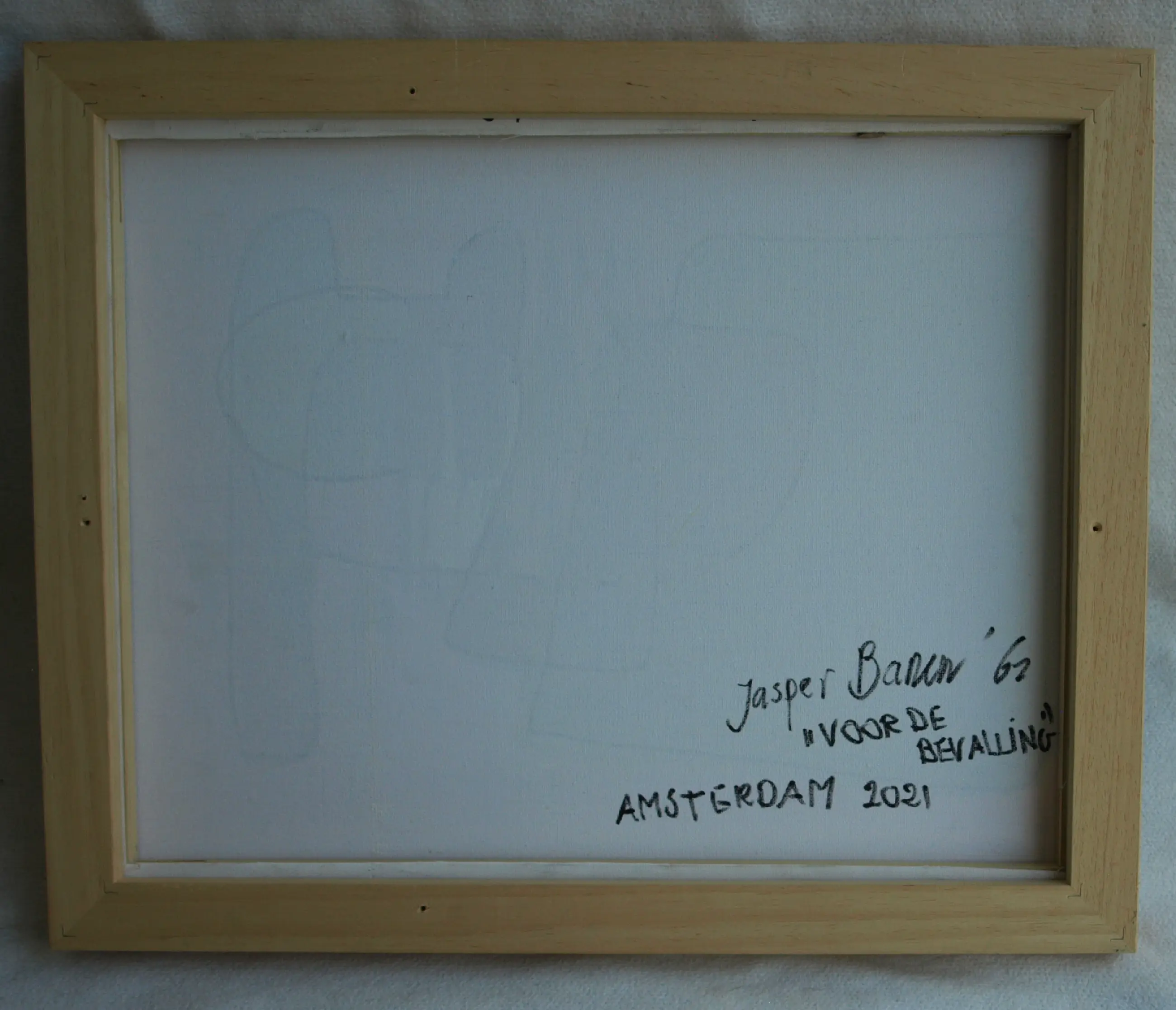 Een schilderij uit 2021 van de Amsterdamse kunstenaar Jasper Banen (1962), getiteld “Voor de bevalling”. -Techniek: acrylverf op doek, opgespannen op een houten spieraam. -Ingelijst in een houten baklijst. -Gesigneerd (monogram) en gedateerd rechtsonder in het werk en ook gesigneerd, gedateerd en getiteld op de achterkant van het doek. -Afmetingen: Lijst, 43 x 53 x 4 cm. Beeld, 40 x 50 cm. -Herkomst: Uit het atelier van de kunstenaar. -Conditie: In zeer goede staat. Zie ook de foto’s. Kan zo aan de muur.