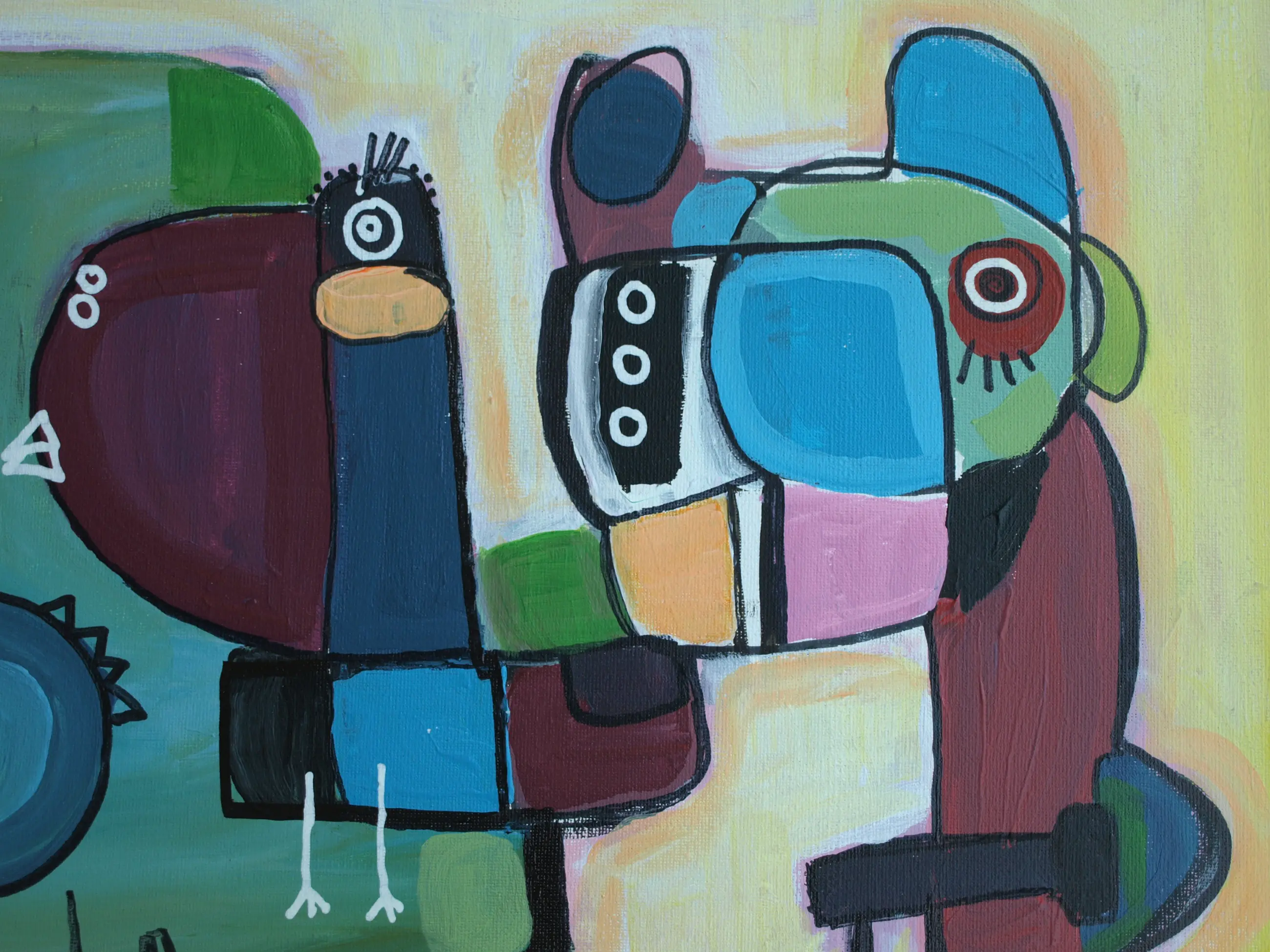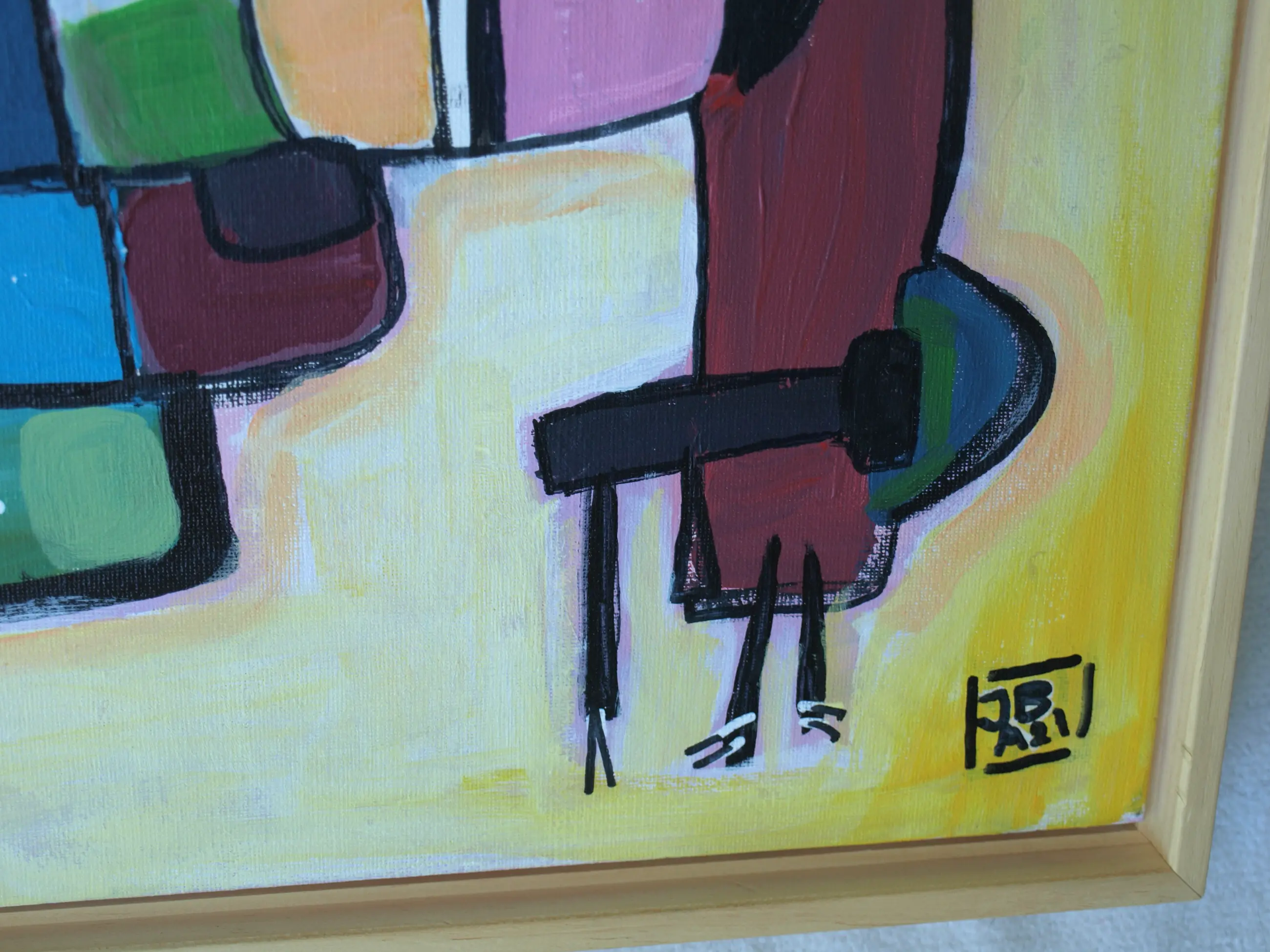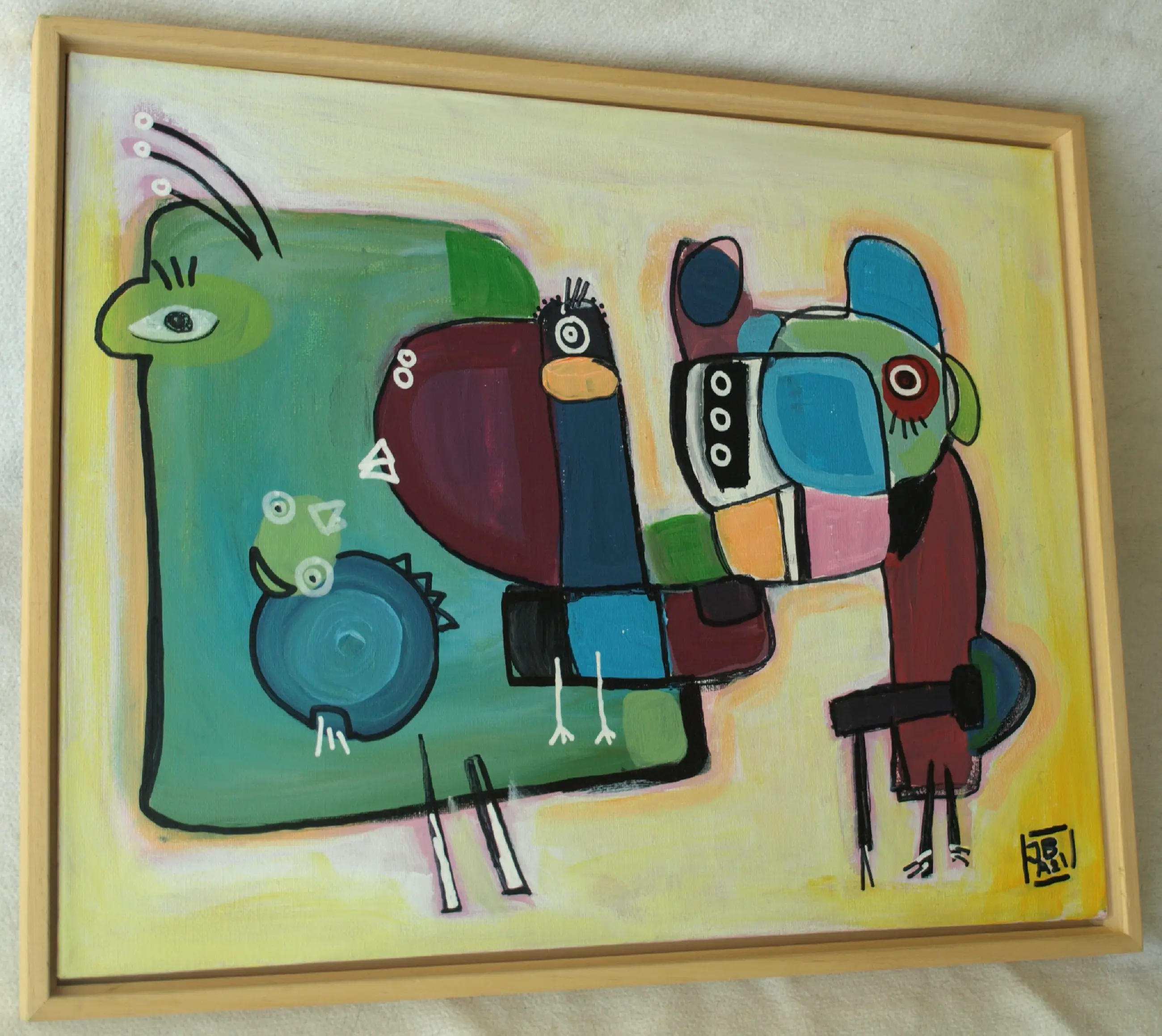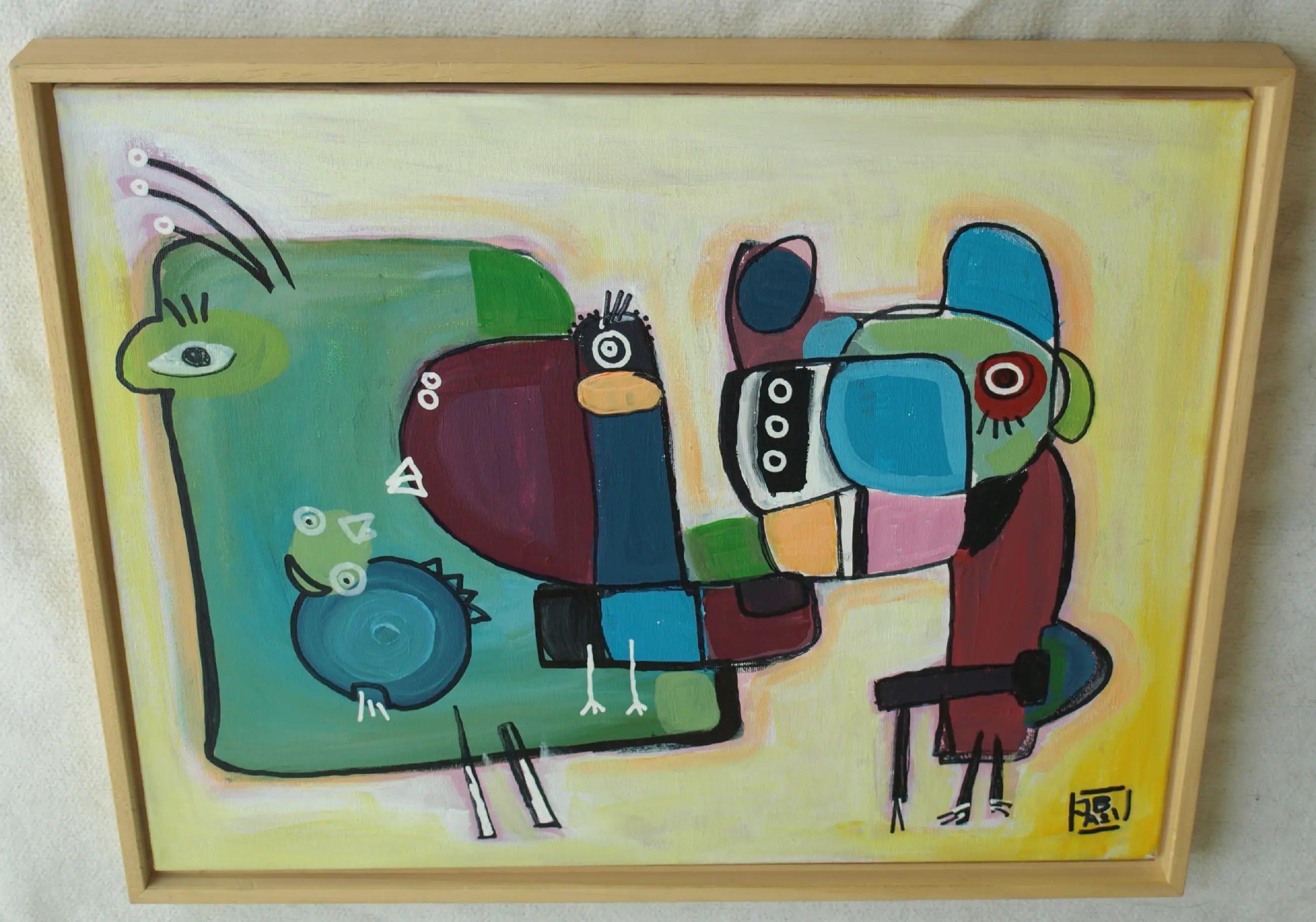 Een schilderij uit 2021 van de Amsterdamse kunstenaar Jasper Banen (1962), getiteld “Voor de bevalling”. -Techniek: acrylverf op doek, opgespannen op een houten spieraam. -Ingelijst in een houten baklijst. -Gesigneerd (monogram) en gedateerd rechtsonder in het werk en ook gesigneerd, gedateerd en getiteld op de achterkant van het doek. -Afmetingen: Lijst, 43 x 53 x 4 cm. Beeld, 40 x 50 cm. -Herkomst: Uit het atelier van de kunstenaar. -Conditie: In zeer goede staat. Zie ook de foto’s. Kan zo aan de muur.