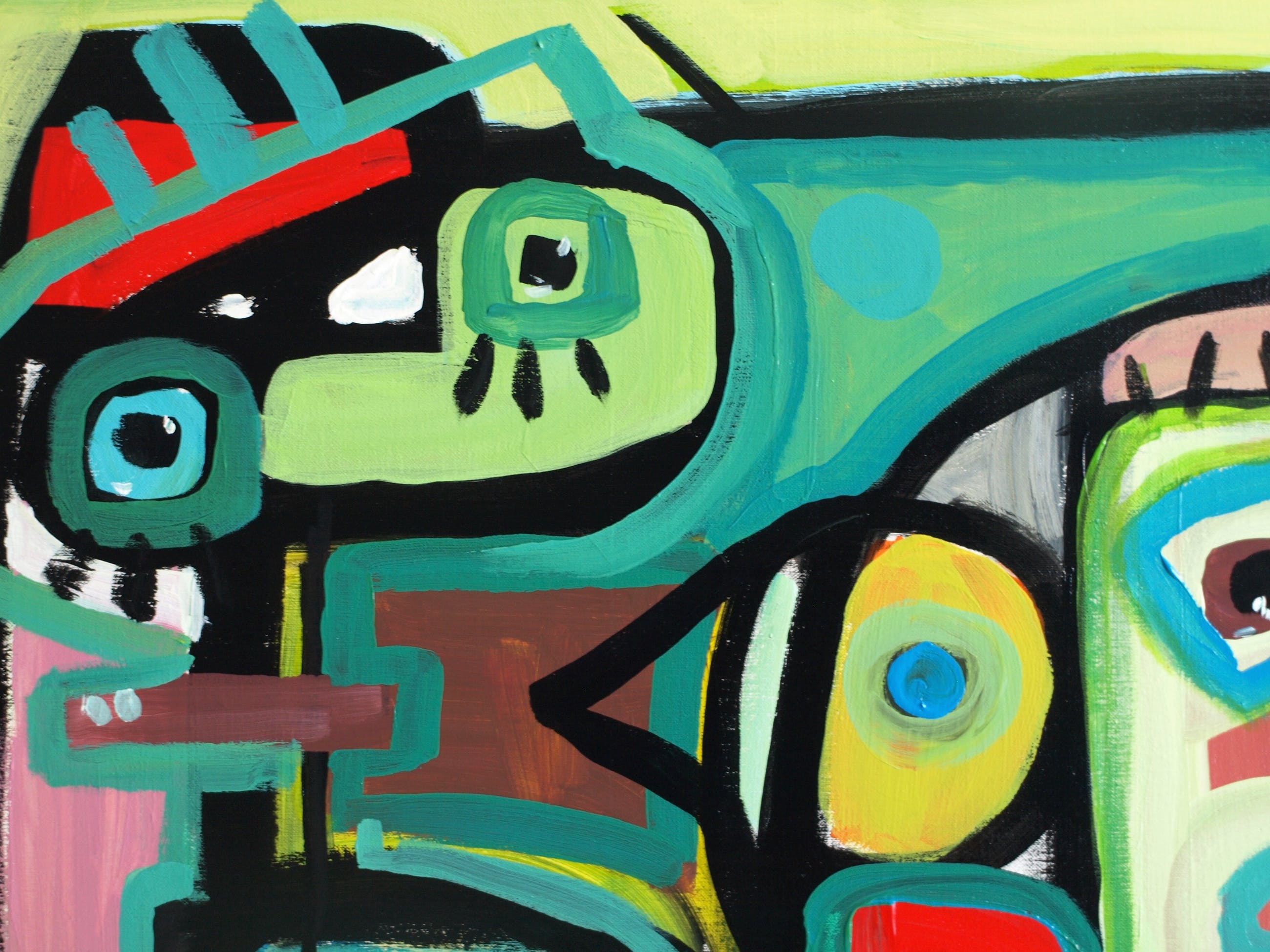 Een groot schilderij uit 2010 van de Amsterdamse kunstenaar Jasper Banen (1962). -Techniek: acrylverf op een ca. 50 jaar oud linnen doek, opgespannen op een houten spieraam. De zijkanten zijn beschilderd. Kan zo aan de muur. -Gesigneerd, gedateerd en getiteld op de achterkant van het doek. -Afmetingen: 70 x 100 cm. -Herkomst: Uit het atelier van de kunstenaar. -Conditie: In zeer goede staat. Zie ook de foto’s.