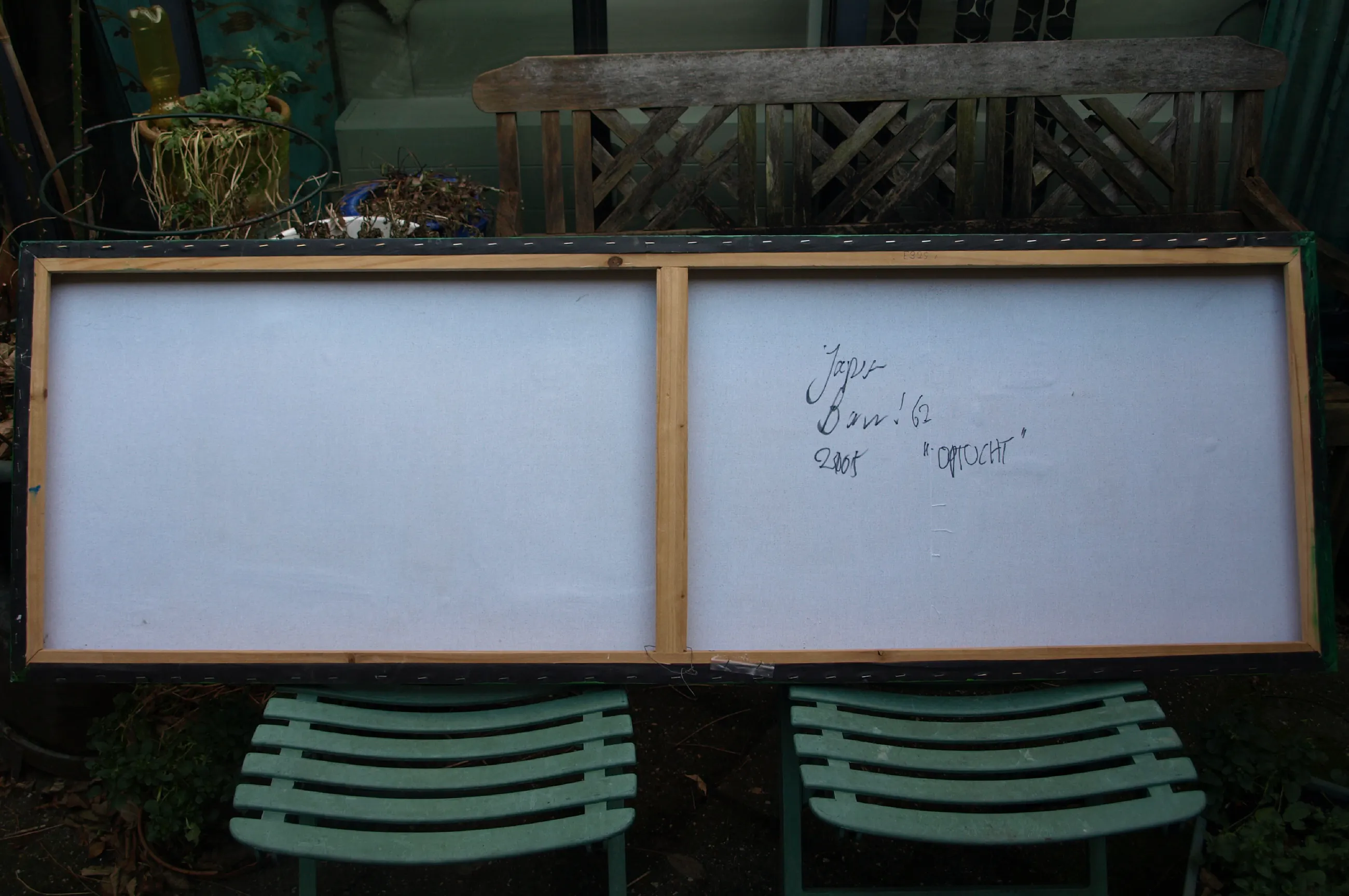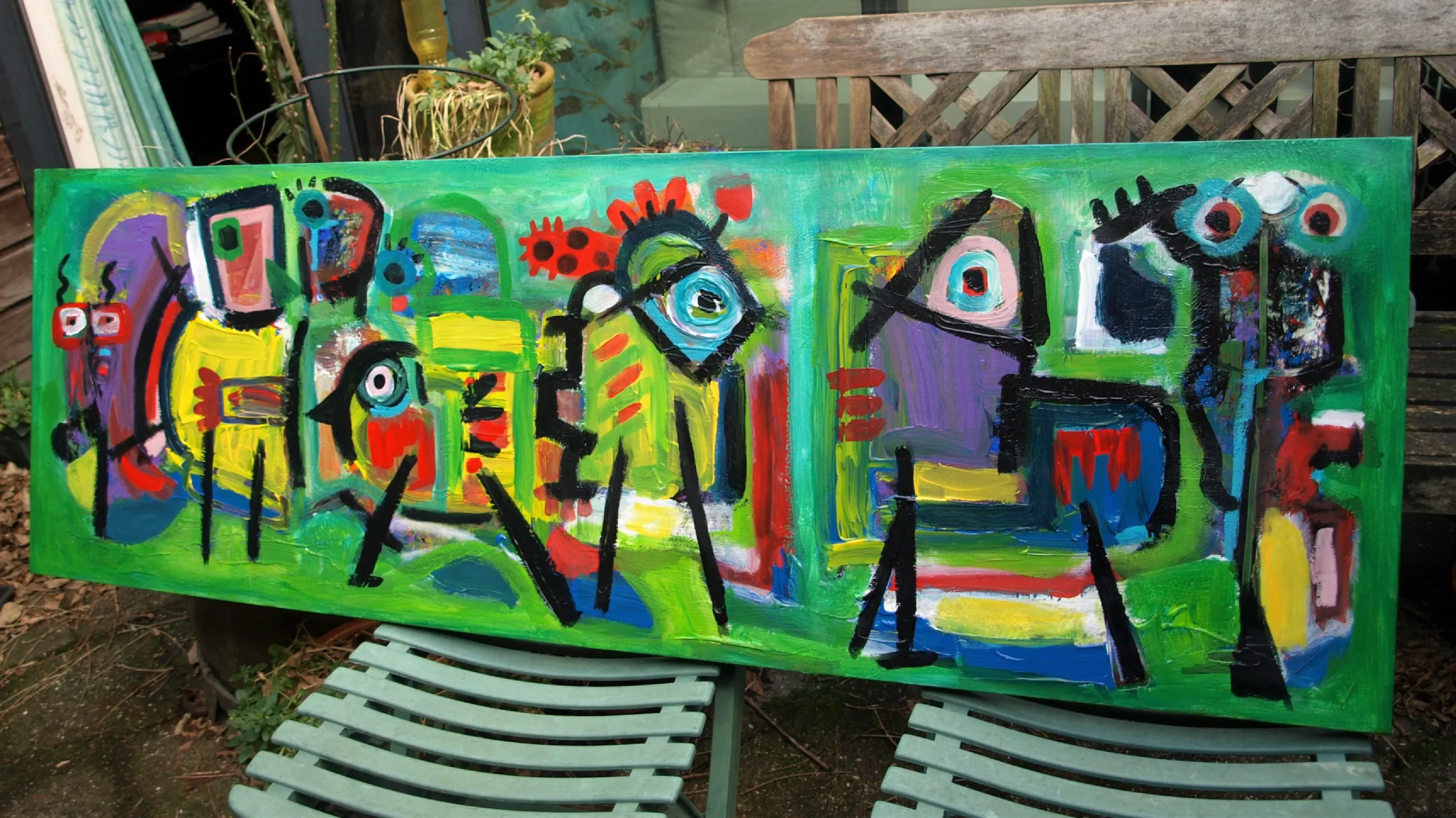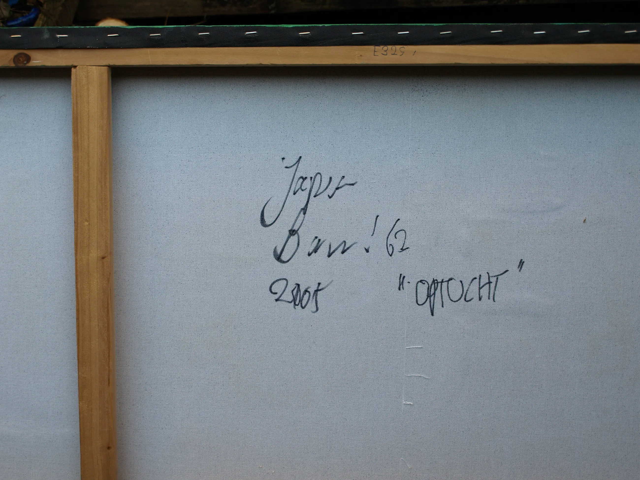Een groot schilderij uit 2005 van de Amsterdamse kunstenaar Jasper Banen (1962), getiteld "Optocht". -Techniek: acrylverf op doek, opgespannen op een dik houten spieraam. De zijkanten zijn beschilderd. -Kan zo aan de muur. -Gesigneerd, gedateerd en getiteld op de achterkant van het doek. -Afmetingen: 50 x 150 cm. -Herkomst: Uit het atelier van de kunstenaar. -Conditie: In zeer goede staat. Zie ook de foto’s.
