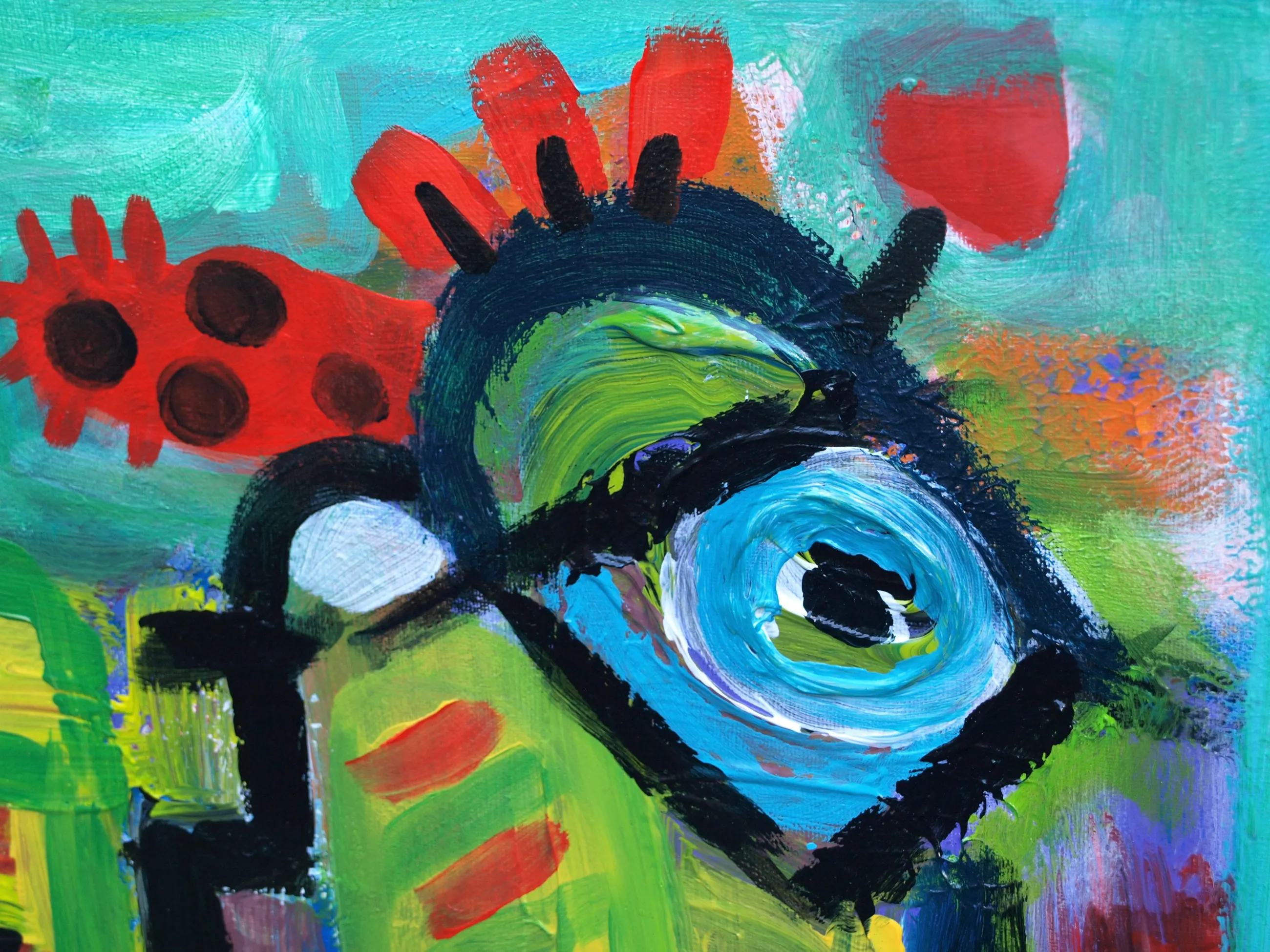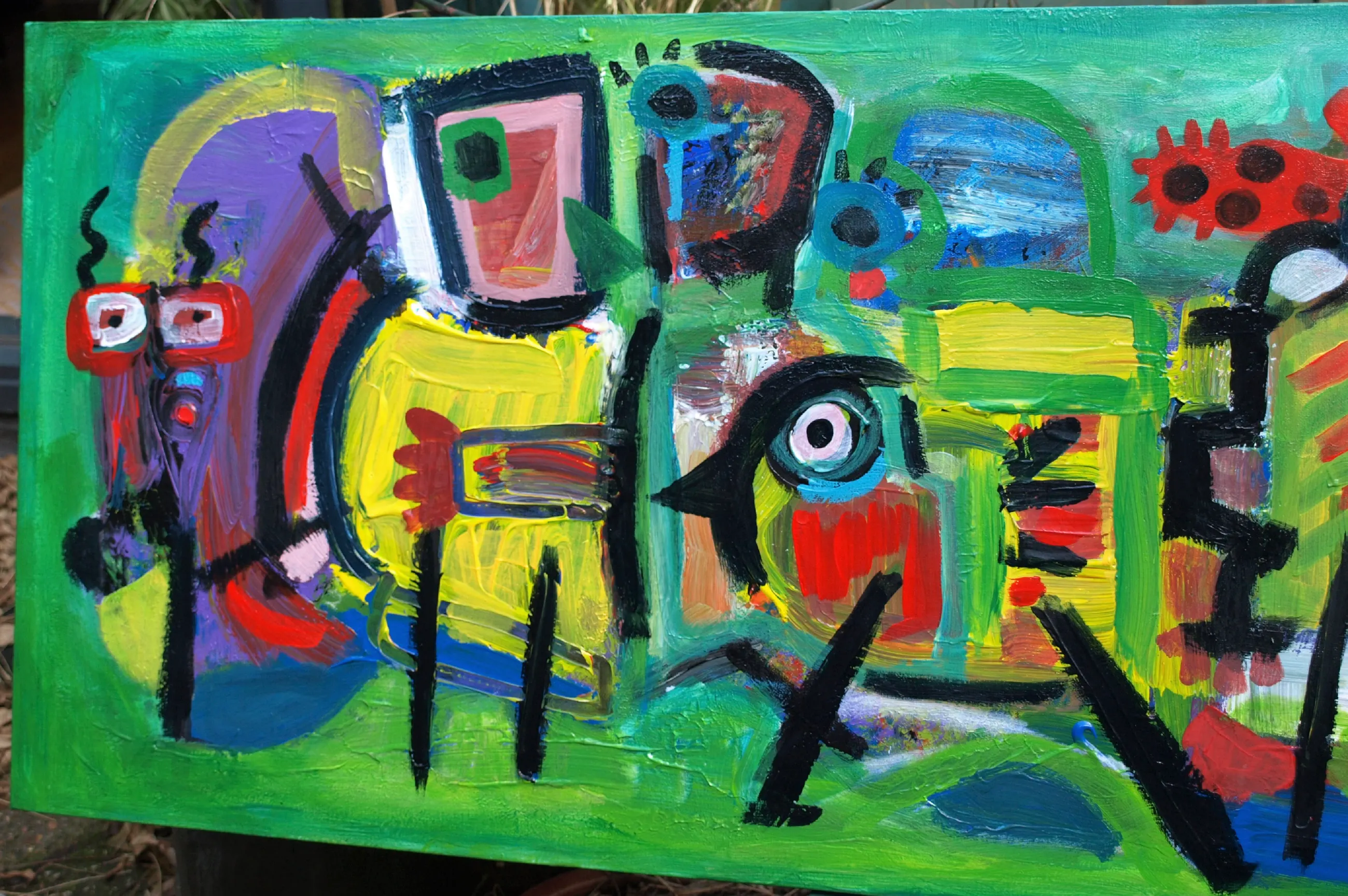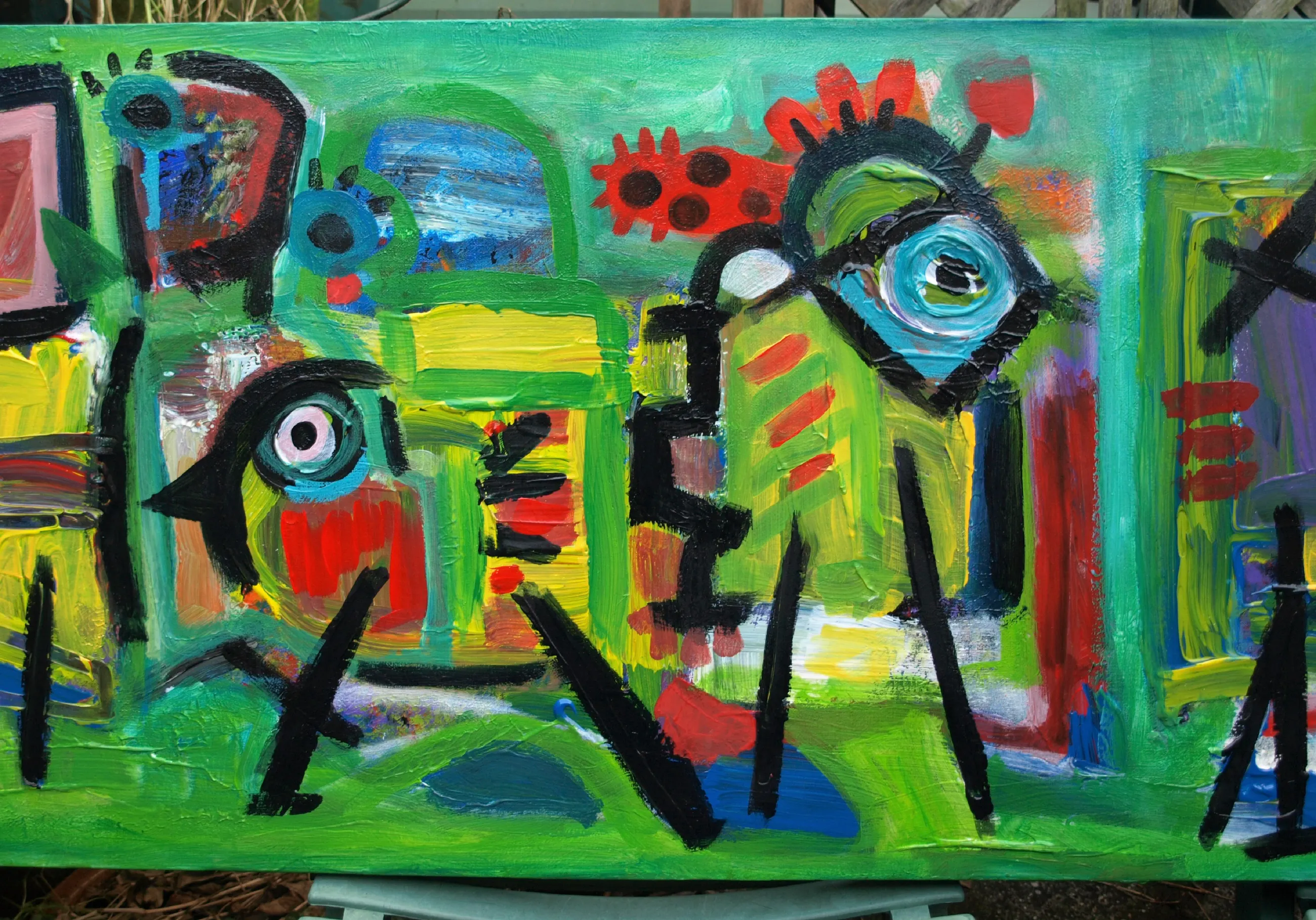 Een groot schilderij uit 2005 van de Amsterdamse kunstenaar Jasper Banen (1962), getiteld "Optocht". -Techniek: acrylverf op doek, opgespannen op een dik houten spieraam. De zijkanten zijn beschilderd. -Kan zo aan de muur. -Gesigneerd, gedateerd en getiteld op de achterkant van het doek. -Afmetingen: 50 x 150 cm. -Herkomst: Uit het atelier van de kunstenaar. -Conditie: In zeer goede staat. Zie ook de foto’s.