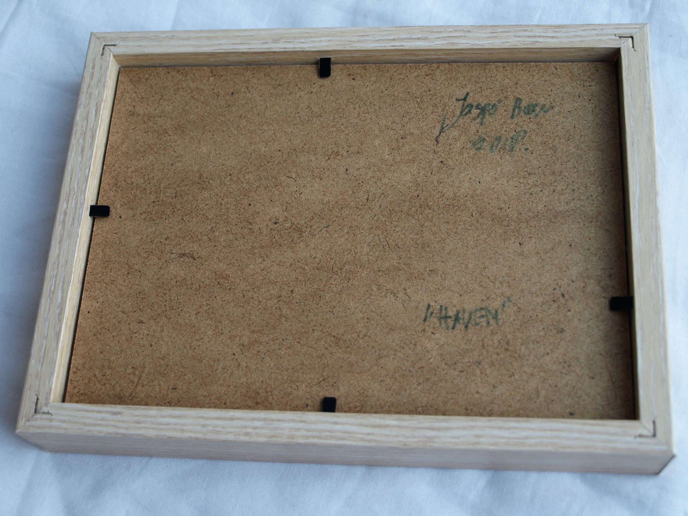 Acrylverf, pastel, potlood en pen op karton en ingelijst in een houten baklijst. Het karton is ‘zwevend’ bevestigd in de baklijst.