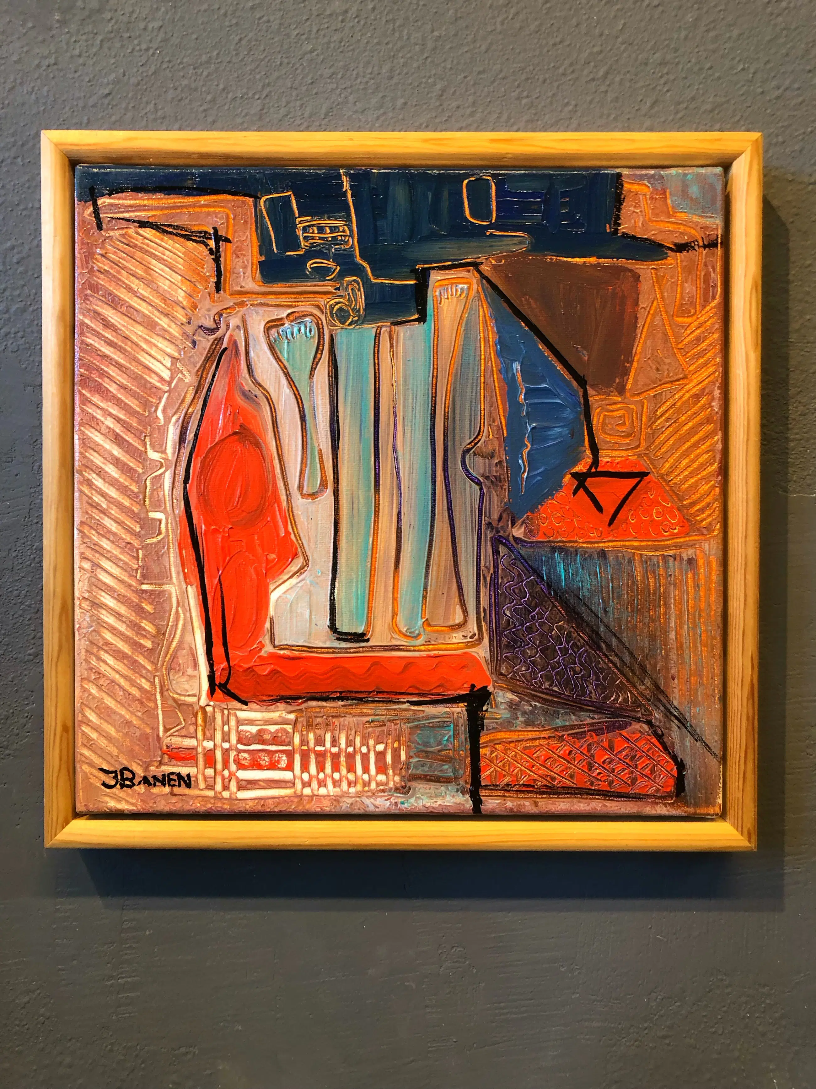 Leuk klein schilderij in een baklijst. Dik in verf opgezet. Het werk kan zo op worden gehangen.