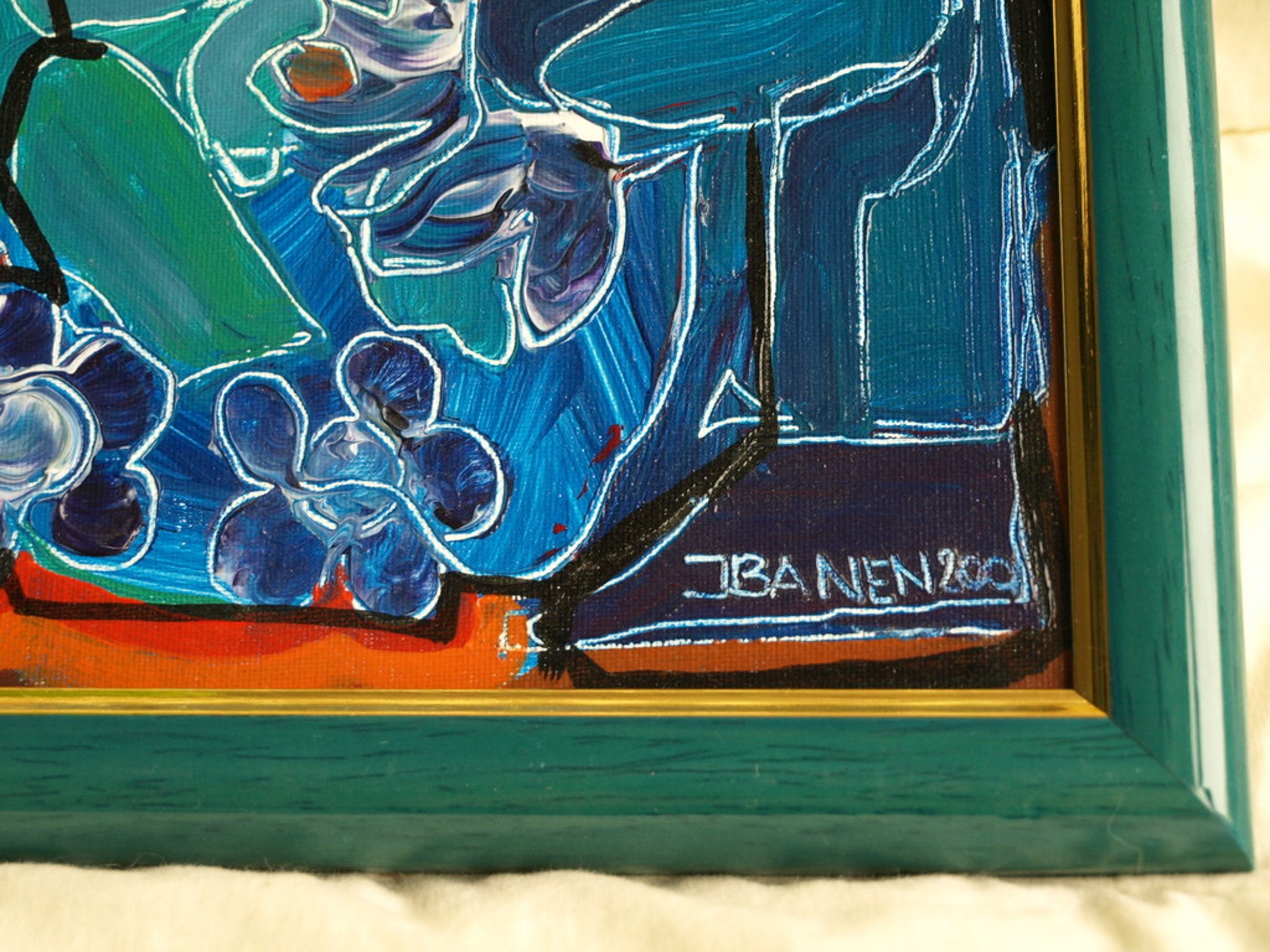 Geschilderd op canvasboard en ingelijst in een houten lijst.