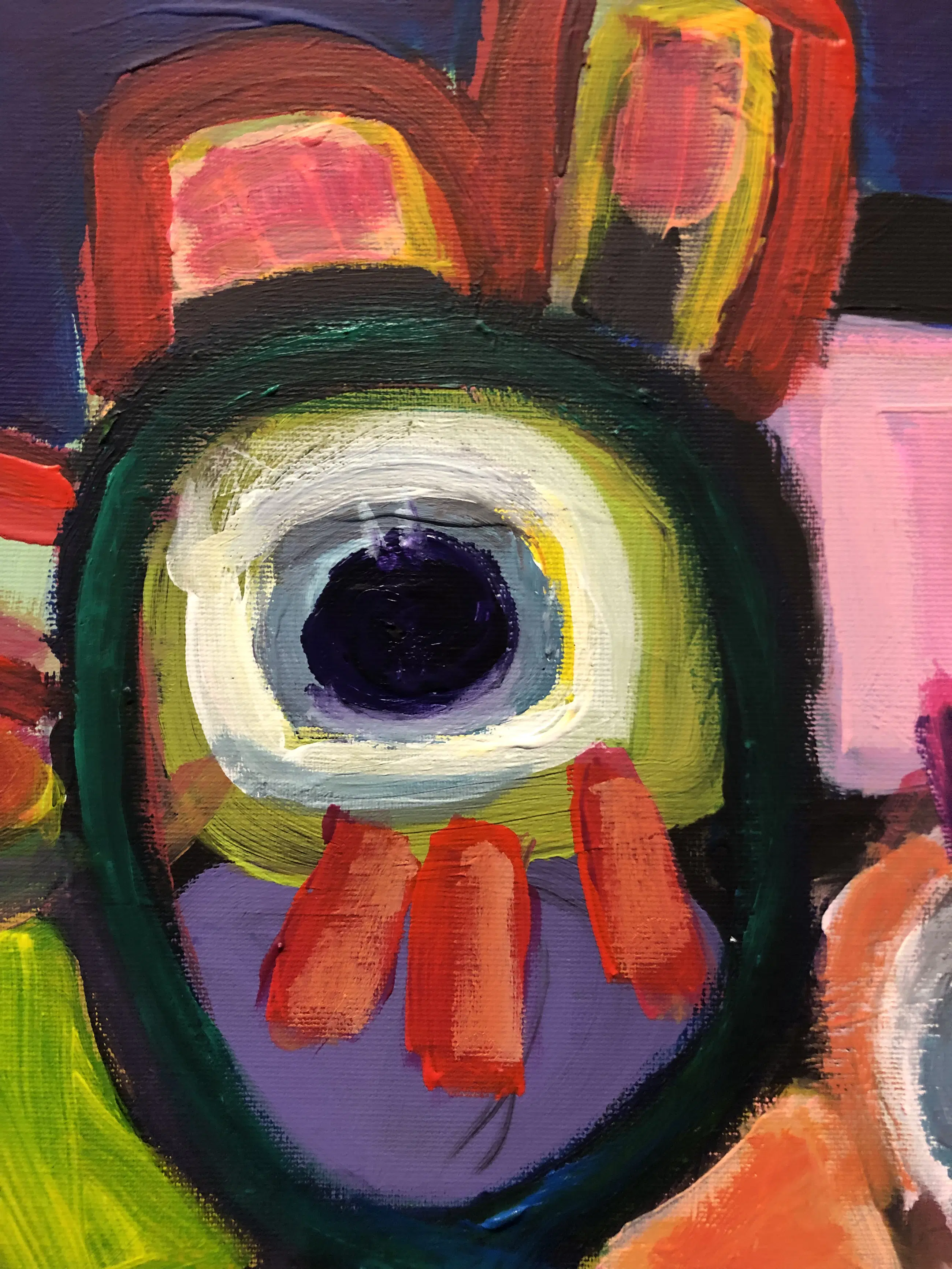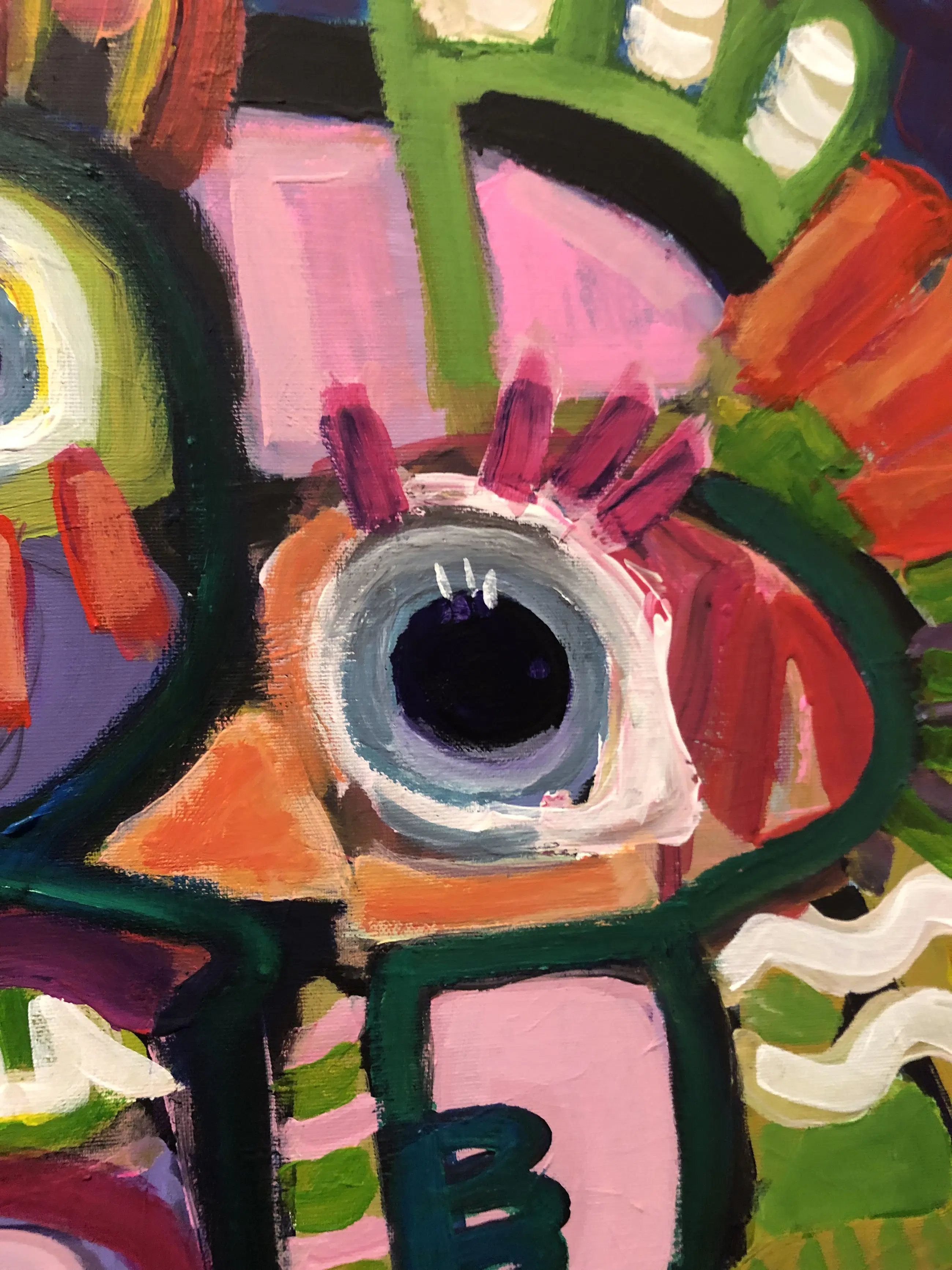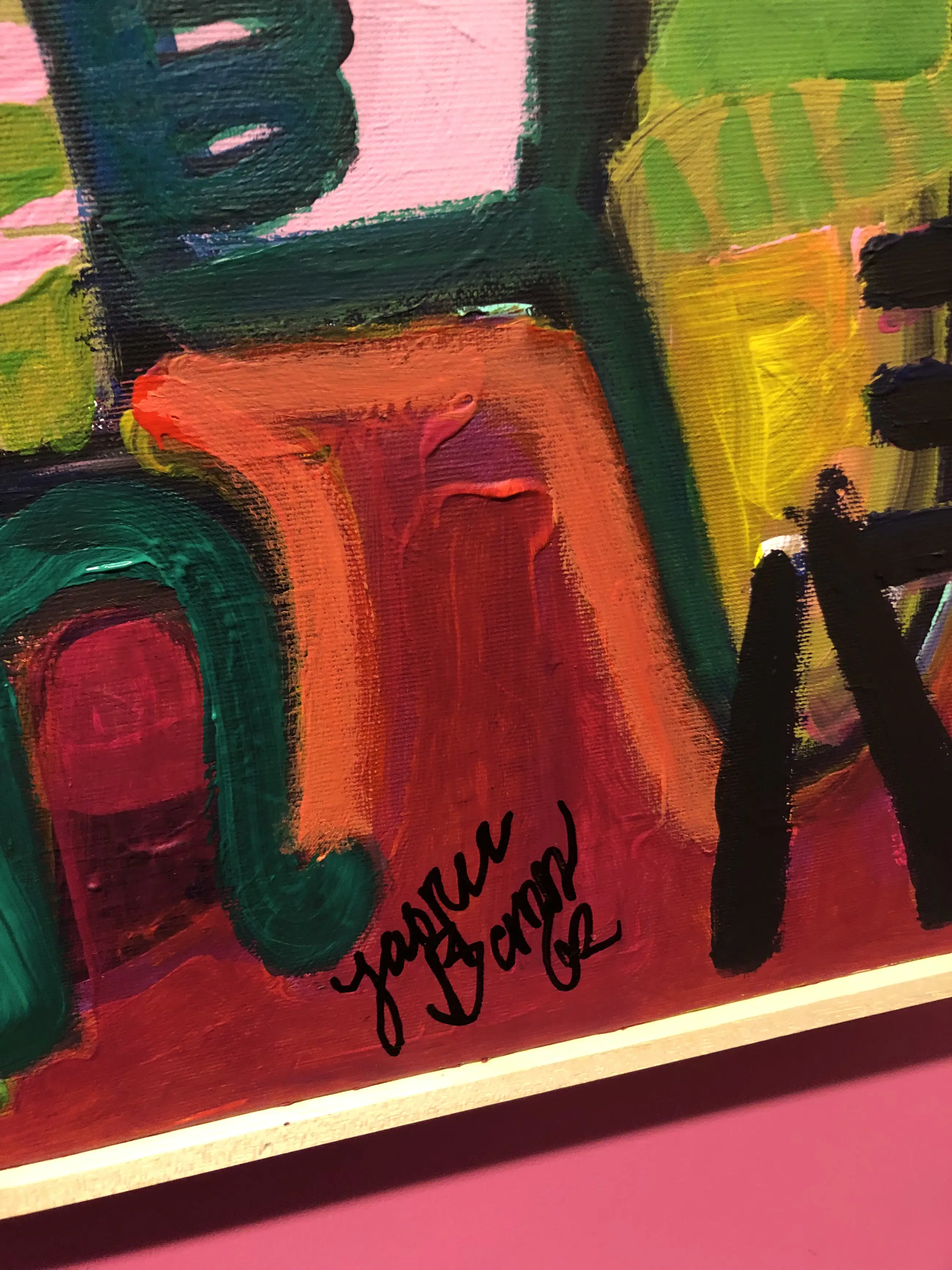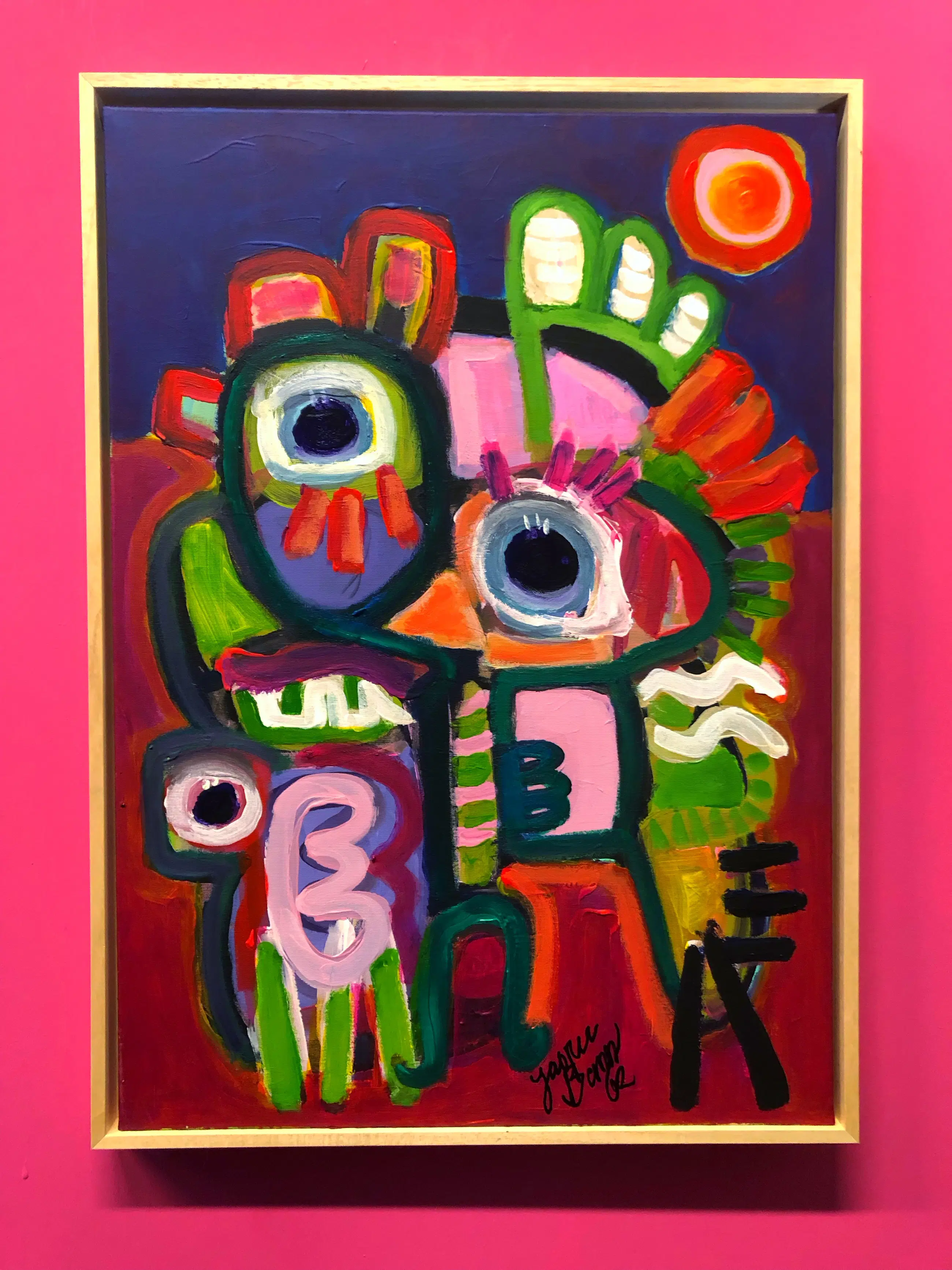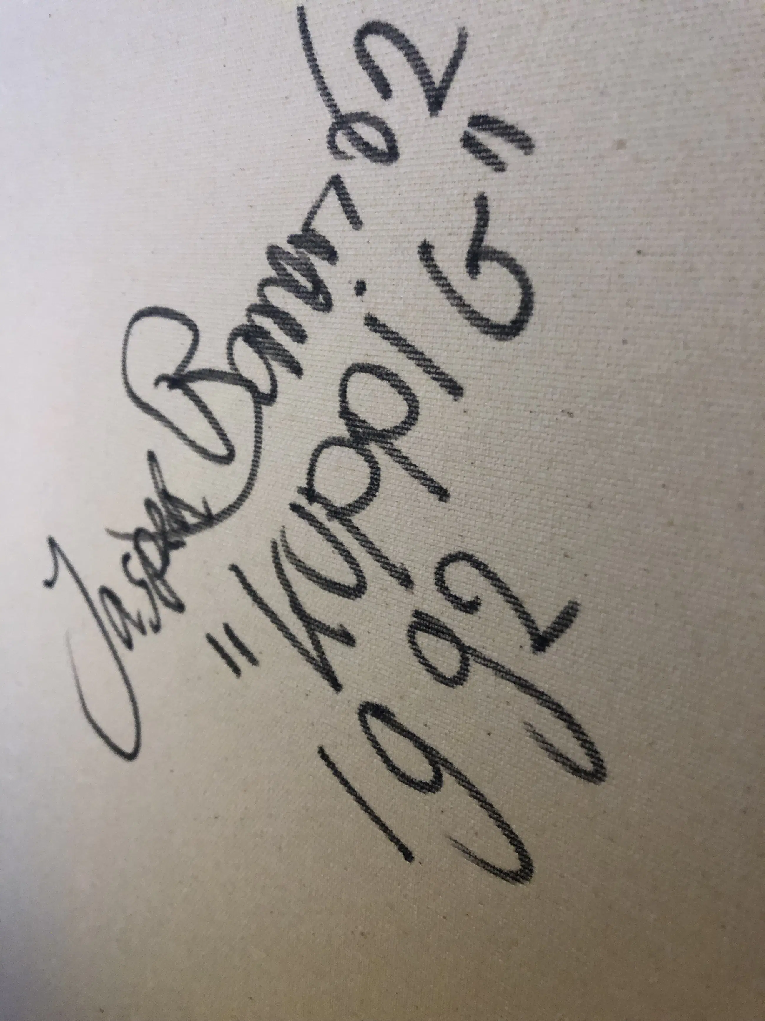 Dit schilderij uit 1992 heeft een krachtig toon en kleur. Het schilderij is bevestigd in een mooie houte baklijst en zo aan de muur.