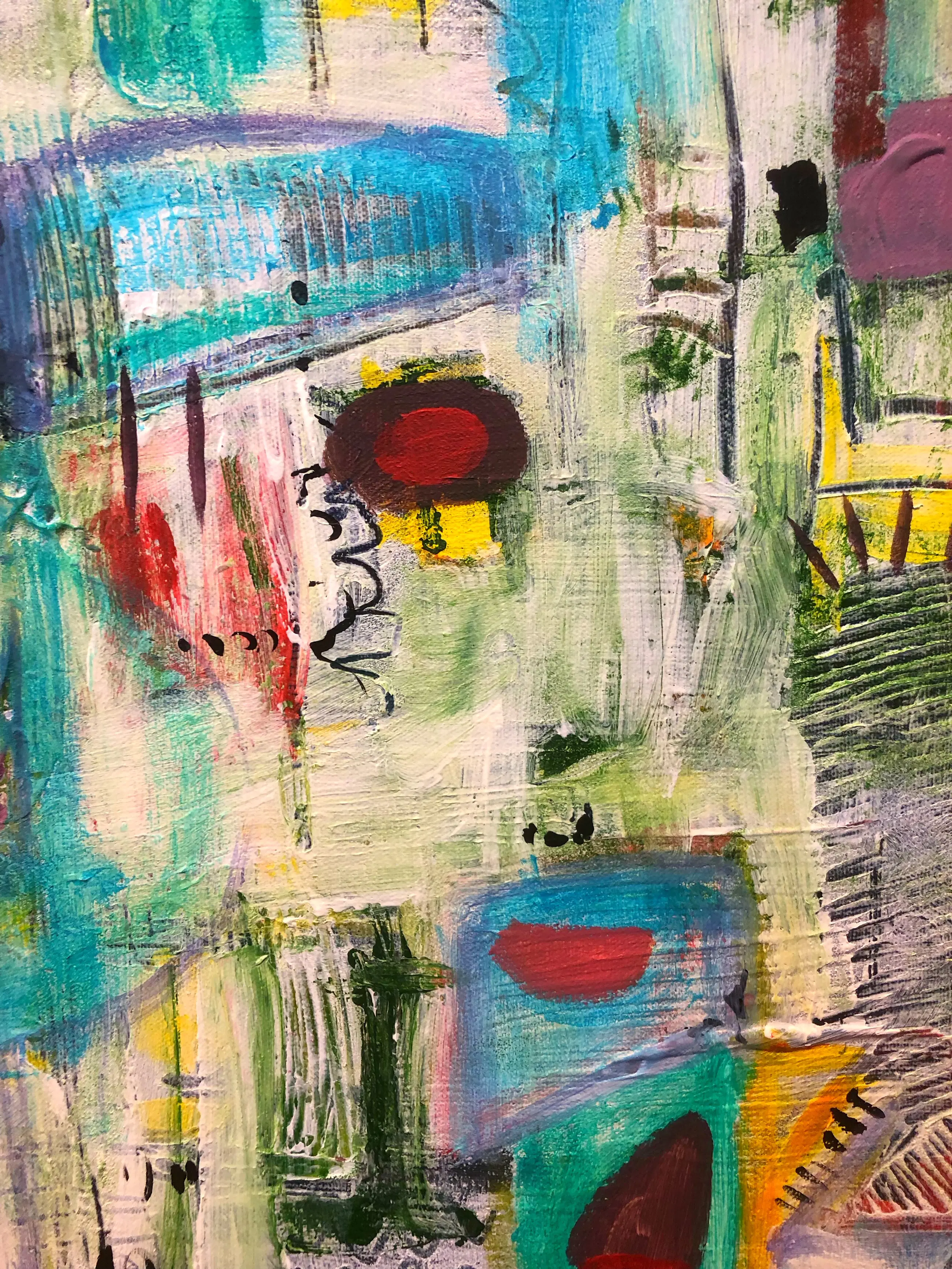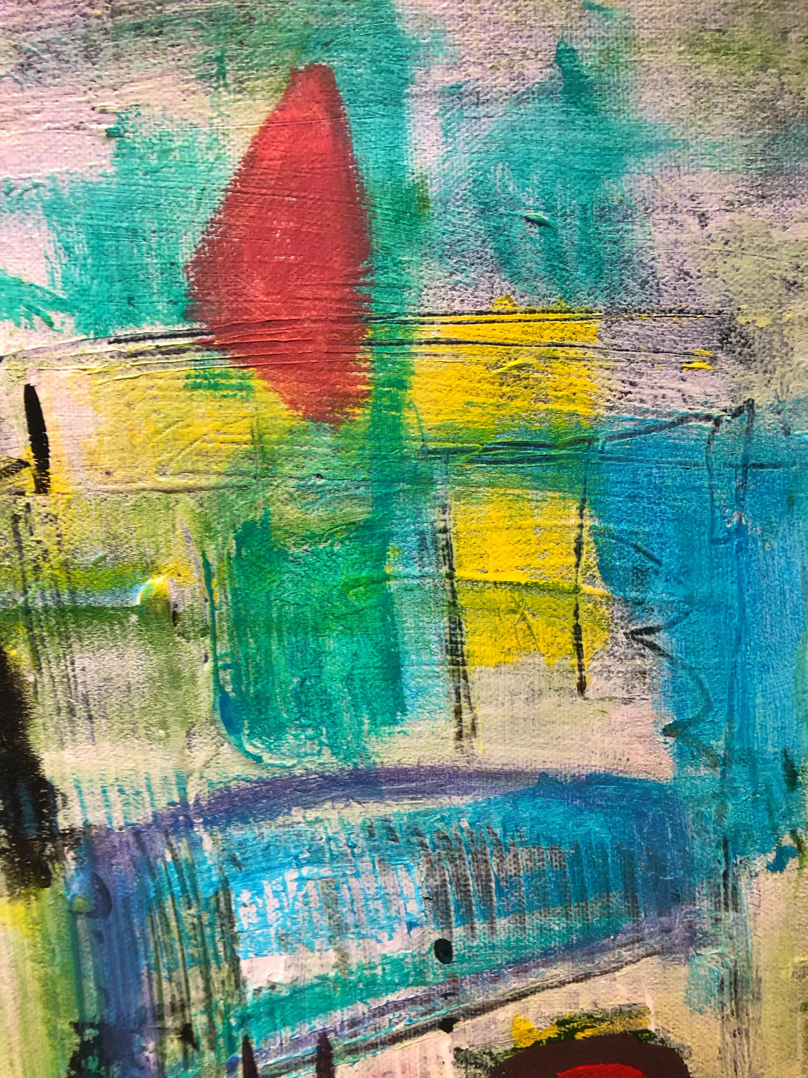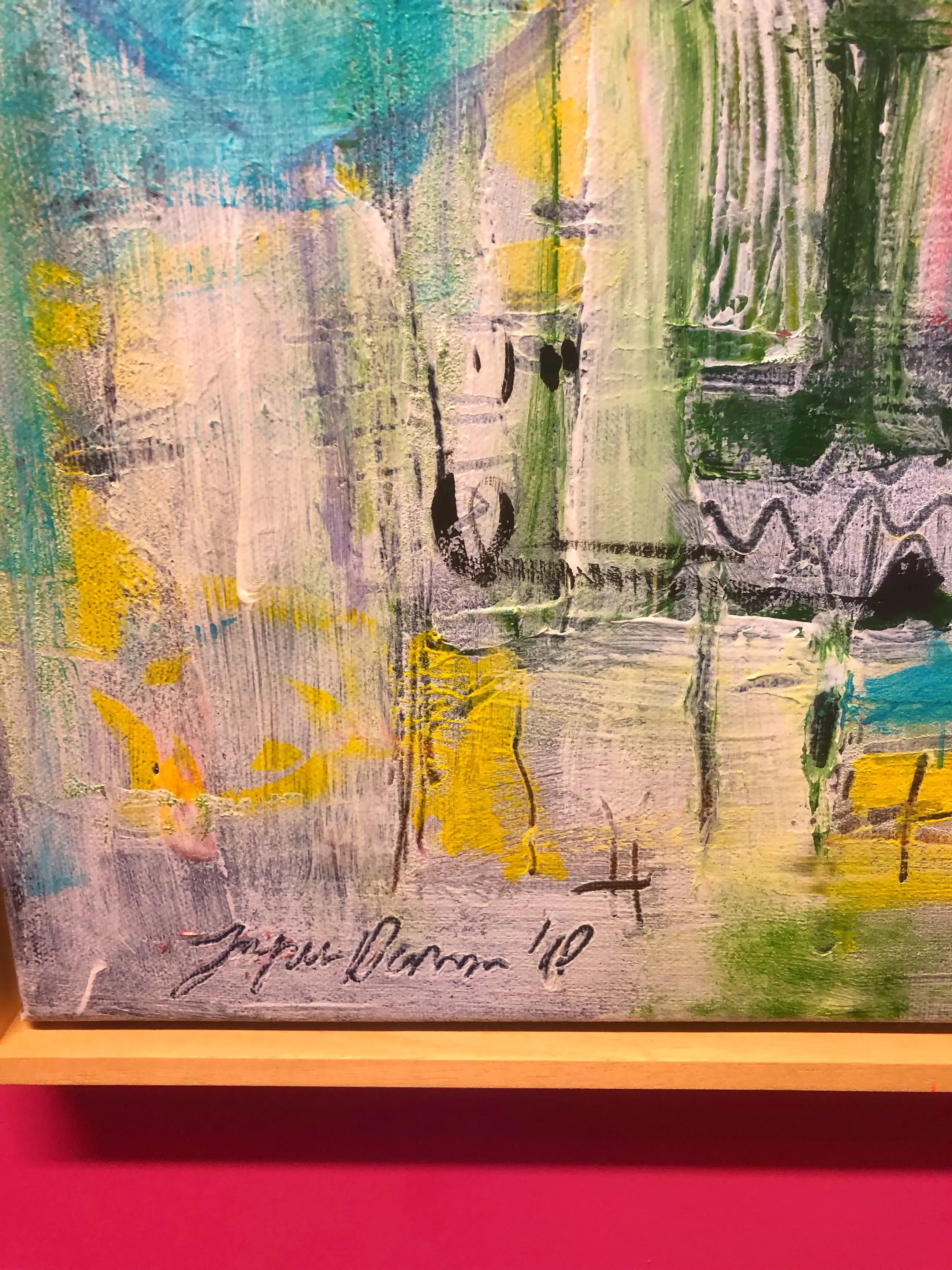 Dit intense abstracte schilderij laat structuur, vorm en beweging zien. Inspiratie Miro, Karel Appel en Picasso. Vormen hebben ruimte, maar staan ook in verbinding met elkaar. Er is evenwicht en er geen ontwrichting. Het werk is in een baklijst ingelijst en kan zo opgehangen worden.