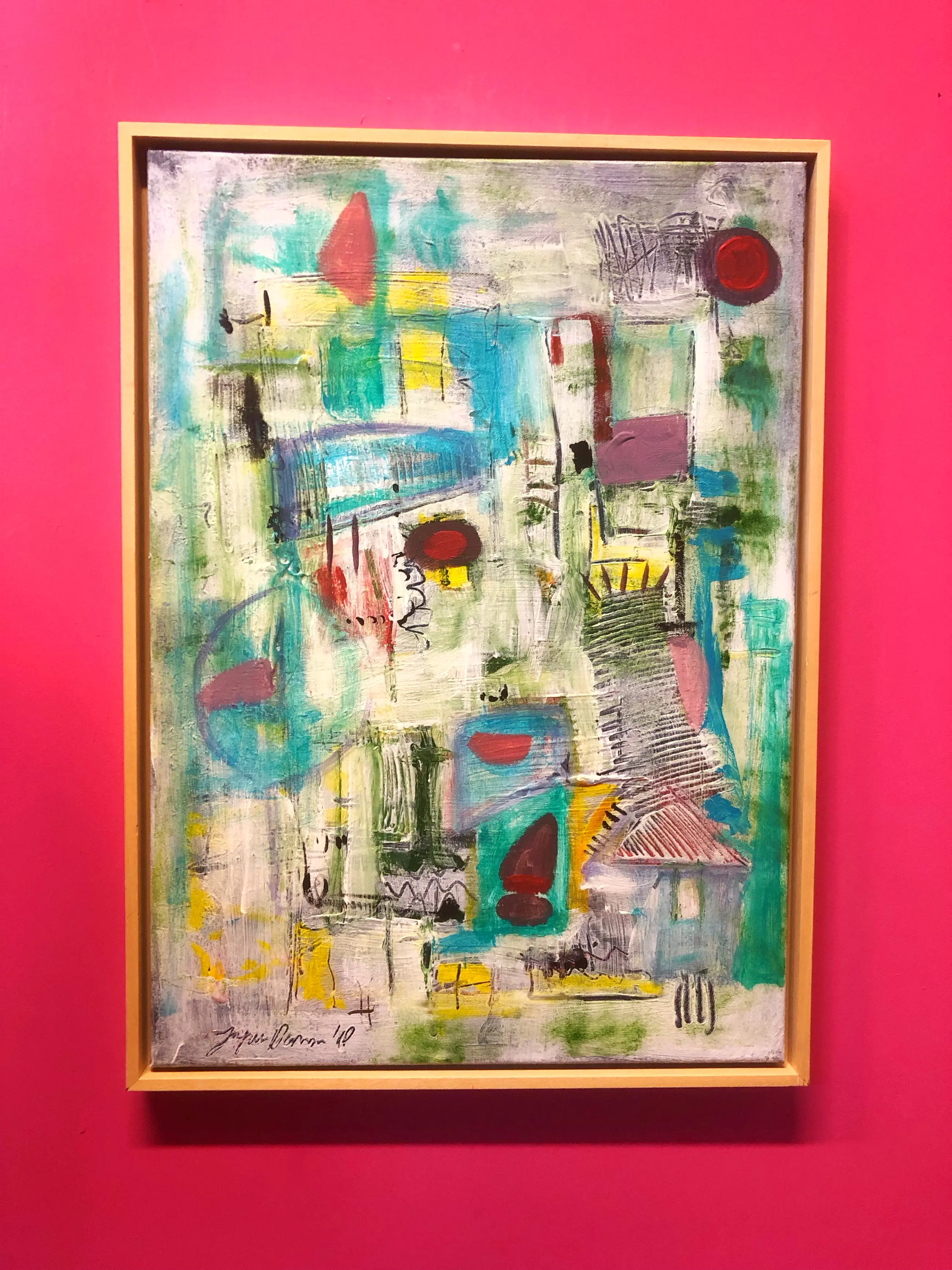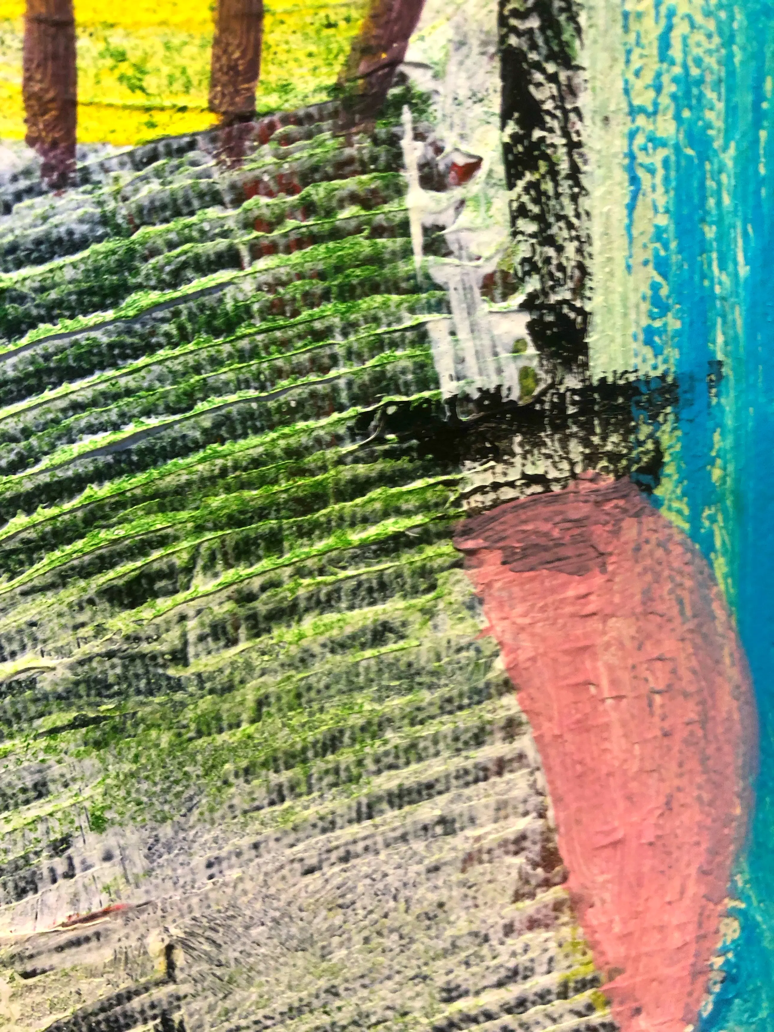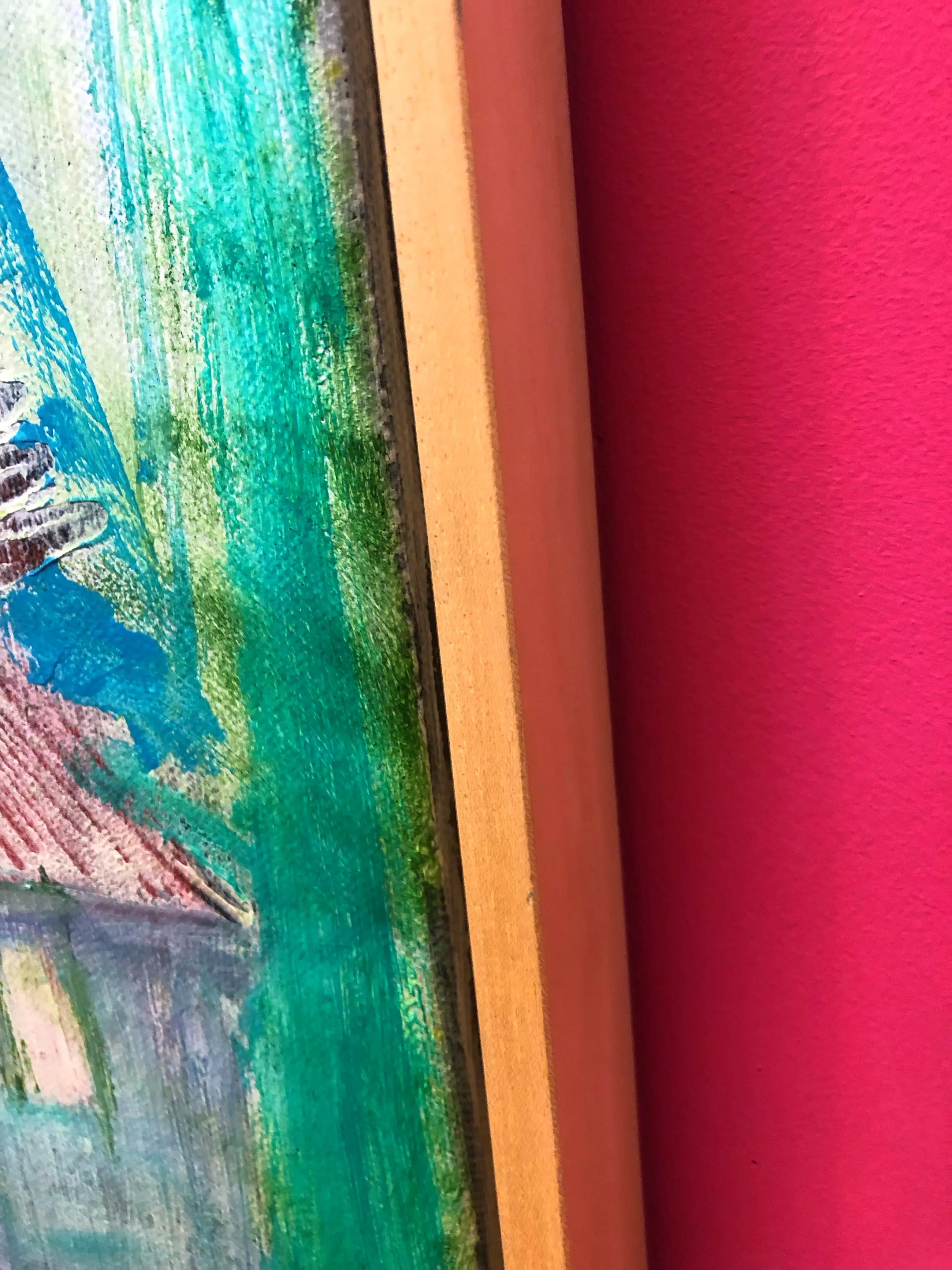 Dit intense abstracte schilderij laat structuur, vorm en beweging zien. Inspiratie Miro, Karel Appel en Picasso. Vormen hebben ruimte, maar staan ook in verbinding met elkaar. Er is evenwicht en er geen ontwrichting. Het werk is in een baklijst ingelijst en kan zo opgehangen worden.