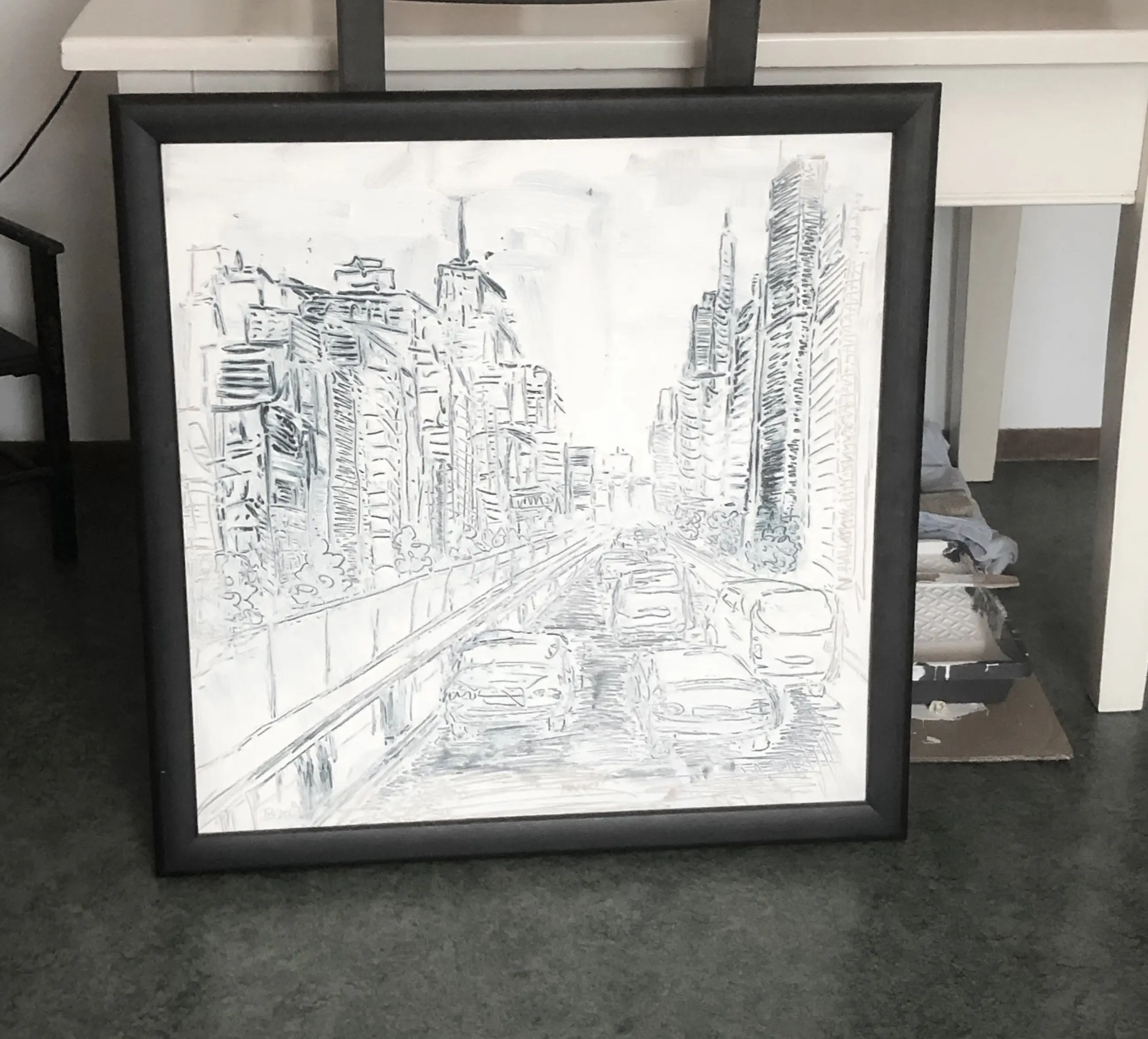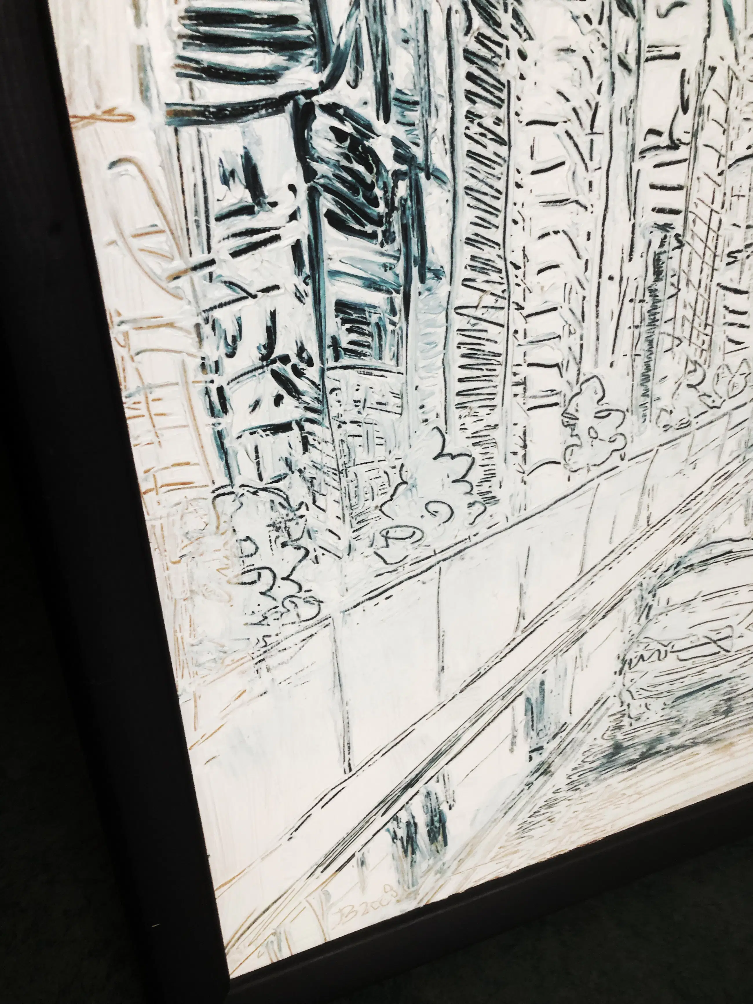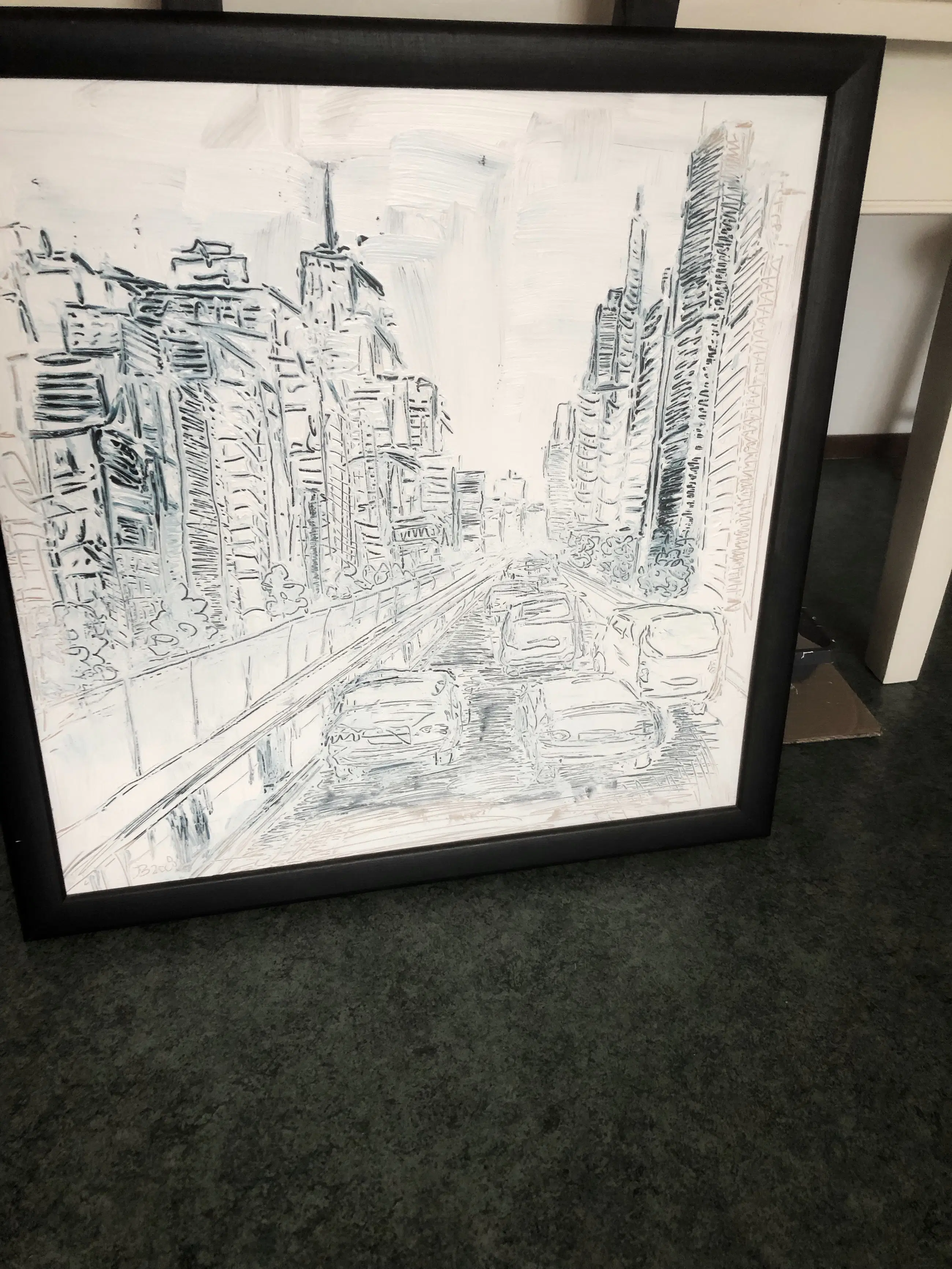 Het werk is op paneel geschilderd. Het is een modern stadsgezicht. Ingelijst en kan zo opgehangen worden.