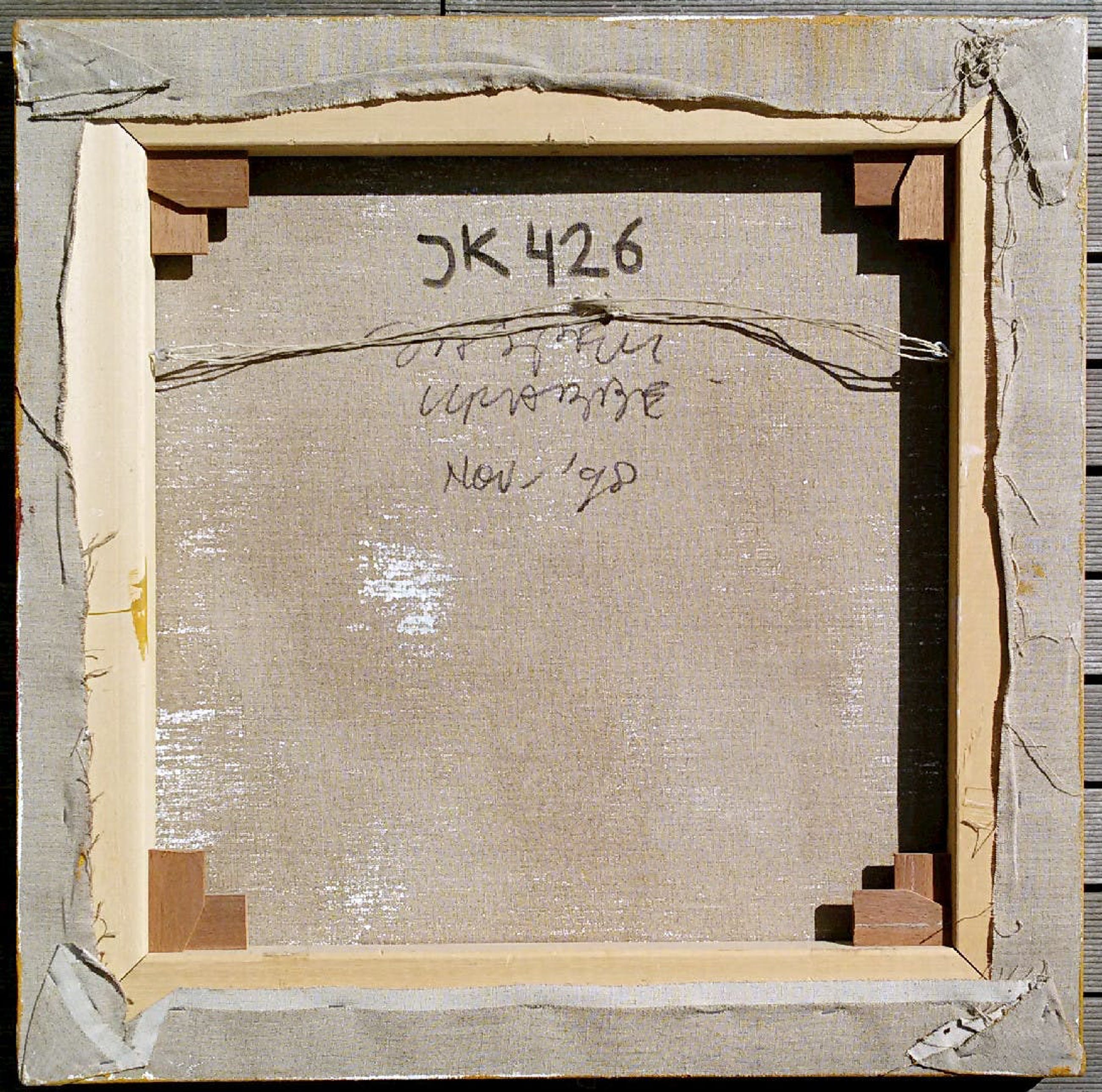 Mooi, abstract werk met flarden figuratieve herinneringen van Jasper Krabbé. Gemengde techniek (olieverf, krijt, collage) op doek, in verso gesigneerd, gedateerd (nov ’98) en genummerd (JK426). In uitstekende conditie. Inlijsten is niet nodig want het doek is over de rand heen beschilderd (4 cm. diep, de dikte van het spieraam).