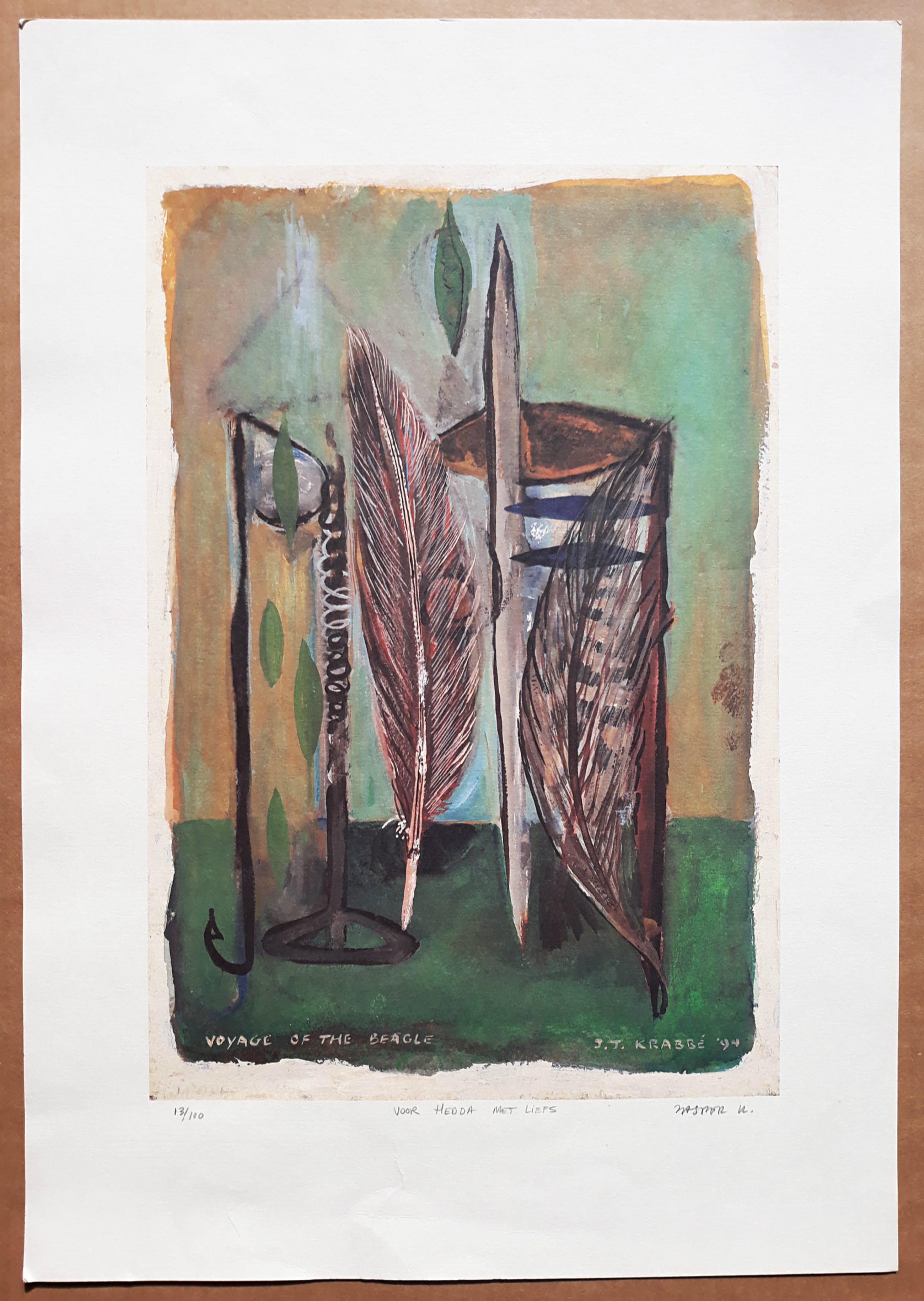 Mooi stilleven van Jasper Krabbé. Een stilleven gebaseerd op de reis (1831-1836) en het boek (1839) van Charles Darwin op de HMS Beagle. Zeefdruk op papier, met potlood gesigneerd, genummerd (13/100) en met opdracht “voor Hedda met liefs”, ook gesigneerd en gedateerd (‘94) in de plaat. Afkomstig uit de nalatenschap van televisie- en filmmaakster Hedda van Gennep. In zeer goede conditie, wat kreukjes in de marge onderin die ingelijst met passe-partout niet zichtbaar zijn.