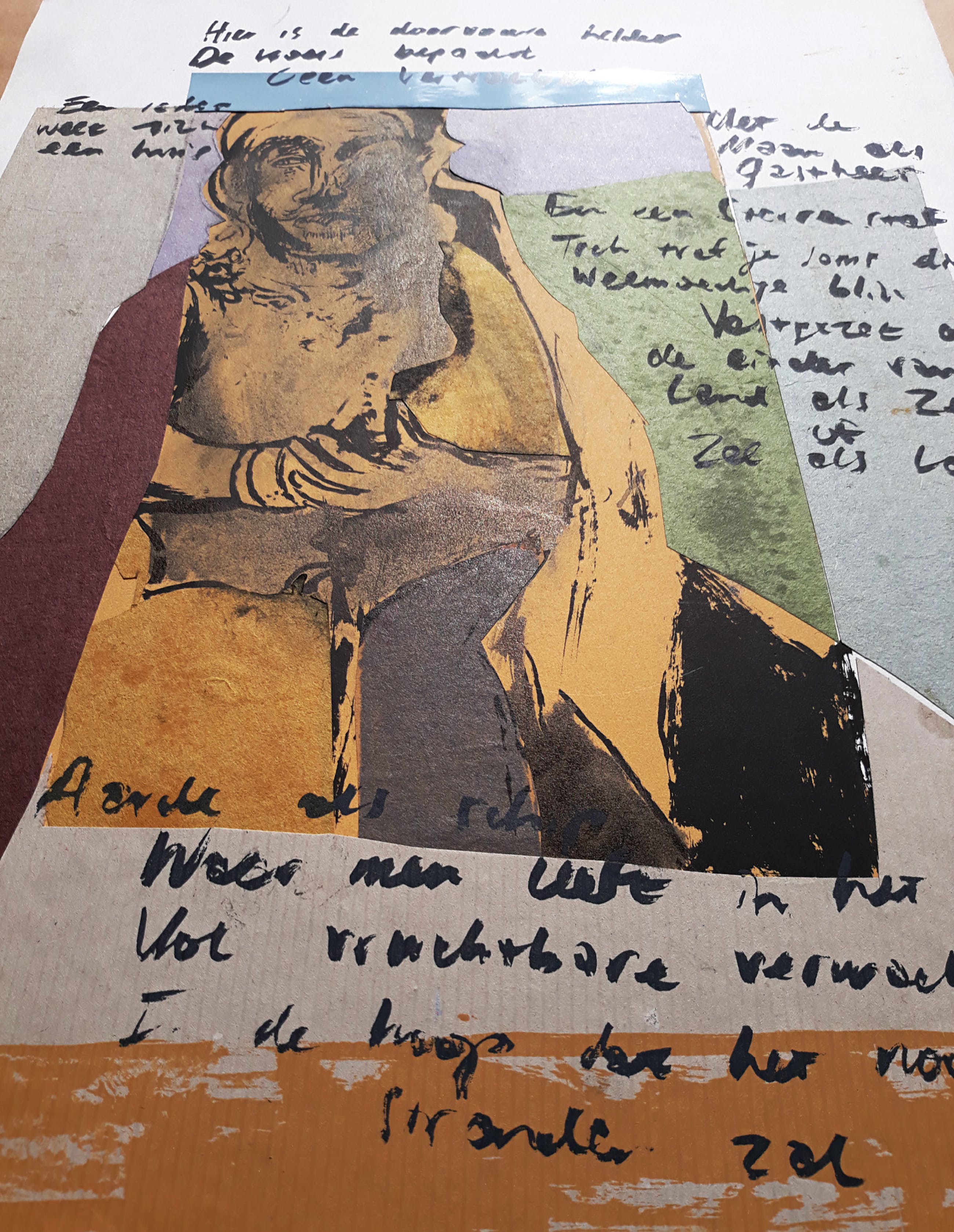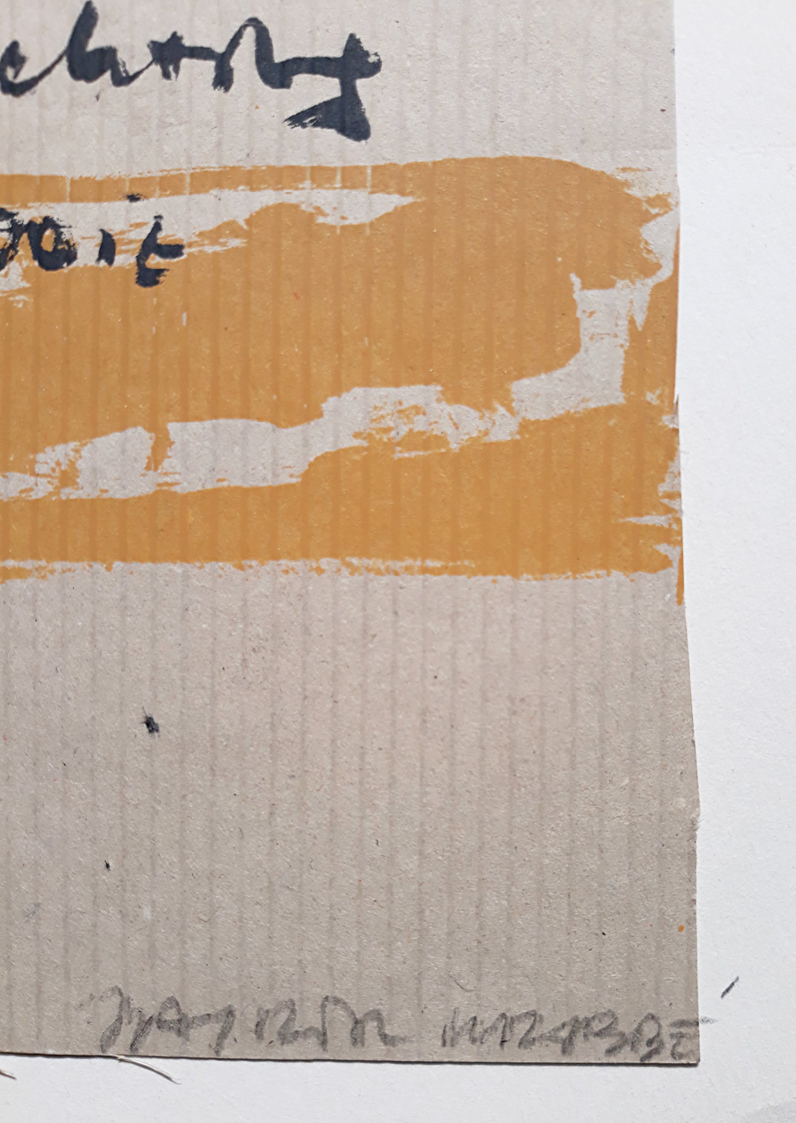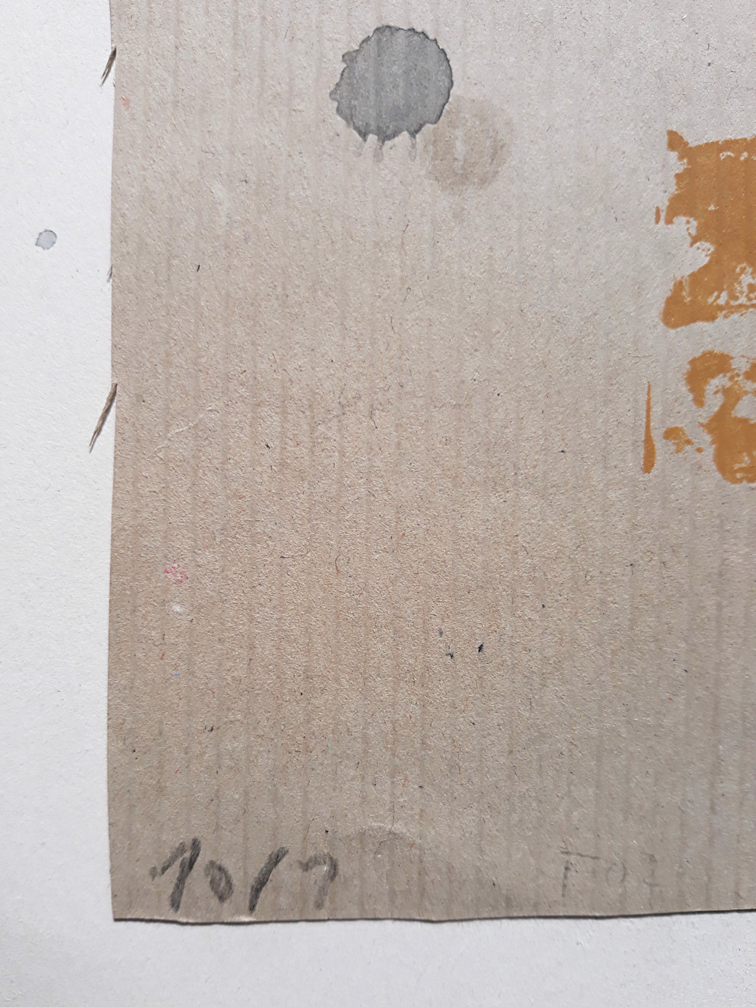 Apart en gecompliceerd werk van Jasper Krabbé. Gemengde techniek (inkt?, potlood?, zeefdruk?) op collage op papier, met potlood gesigneerd en genummerd(?), met opdracht “voor Hedda”. Afkomstig uit de nalatenschap van televisie- en filmmaakster Hedda van Gennep. In zeer goede conditie.