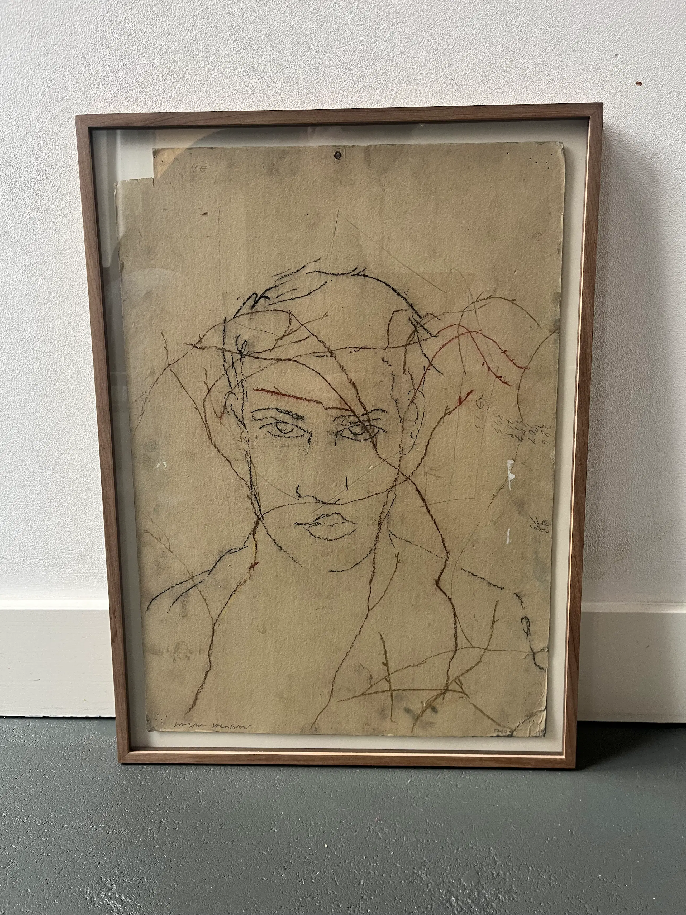Zelfportret van Jasper Krabbe, kenmerkend voor Krabbe is gebruikt materiaal (overgebleven, eerder gebruikt, gerecycled board) de ondergrond van zijn tekeningen.