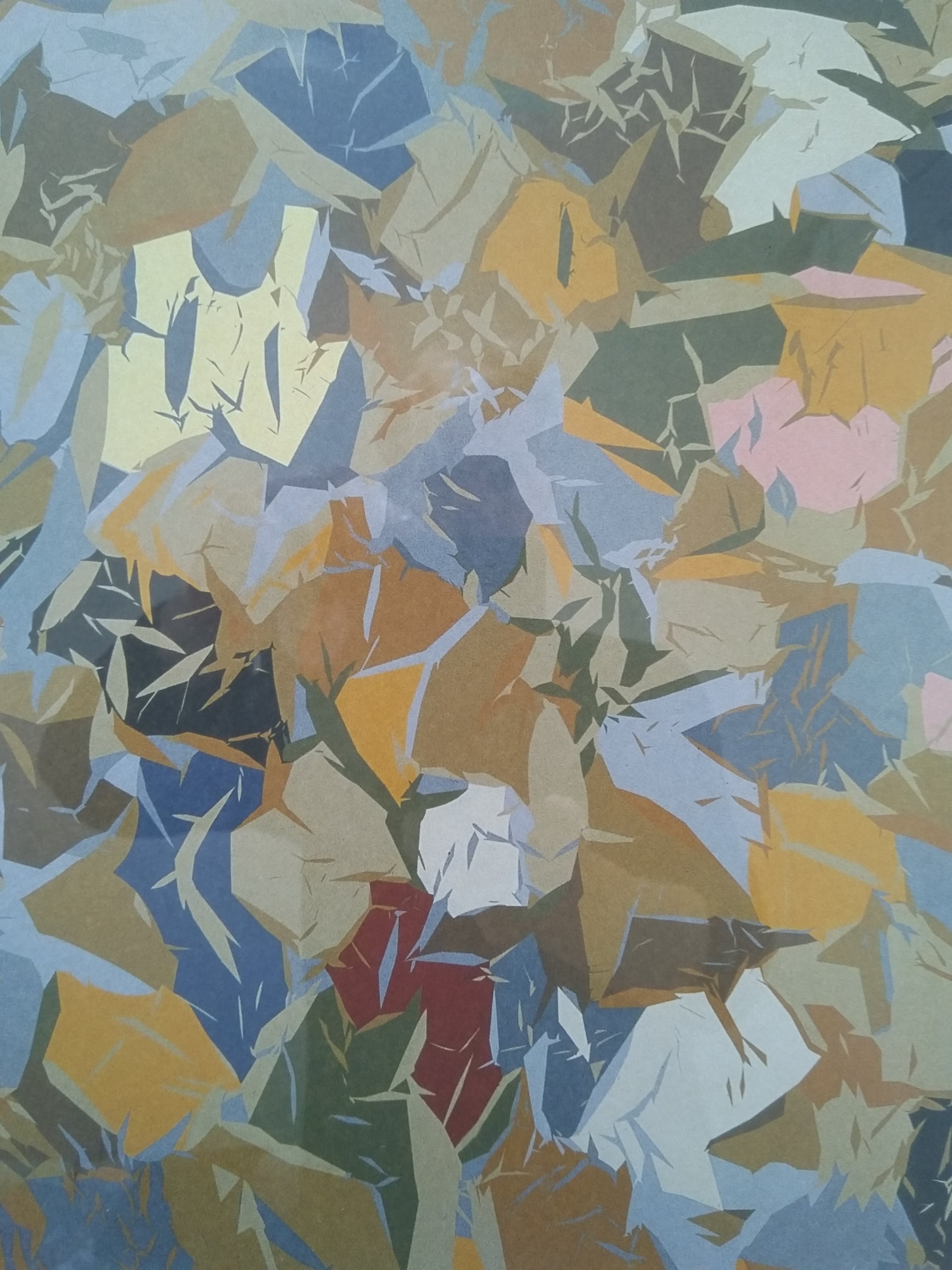 "De stap naar zijn latere, abstracte, veelal monochrome muurschilderingen is hier al duidelijk te zien. Dit werk doet denken aan een abstractie van een veld-boeket" (Tekst: D.Smits)