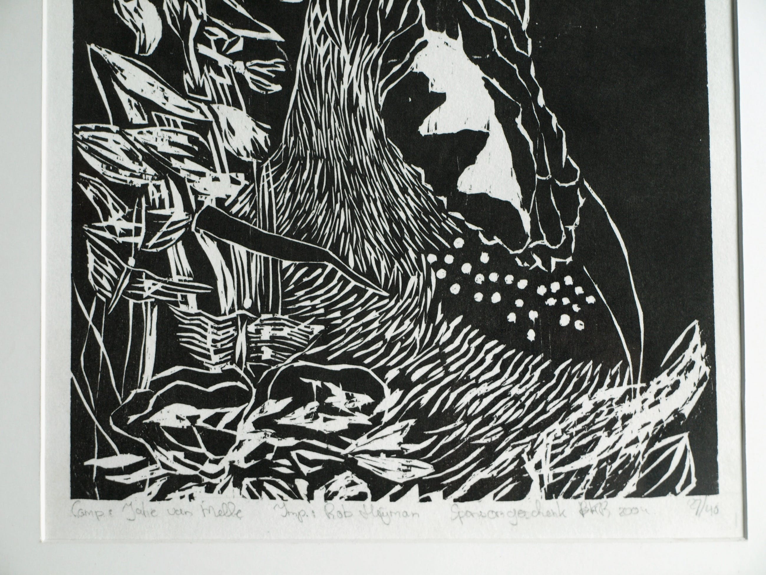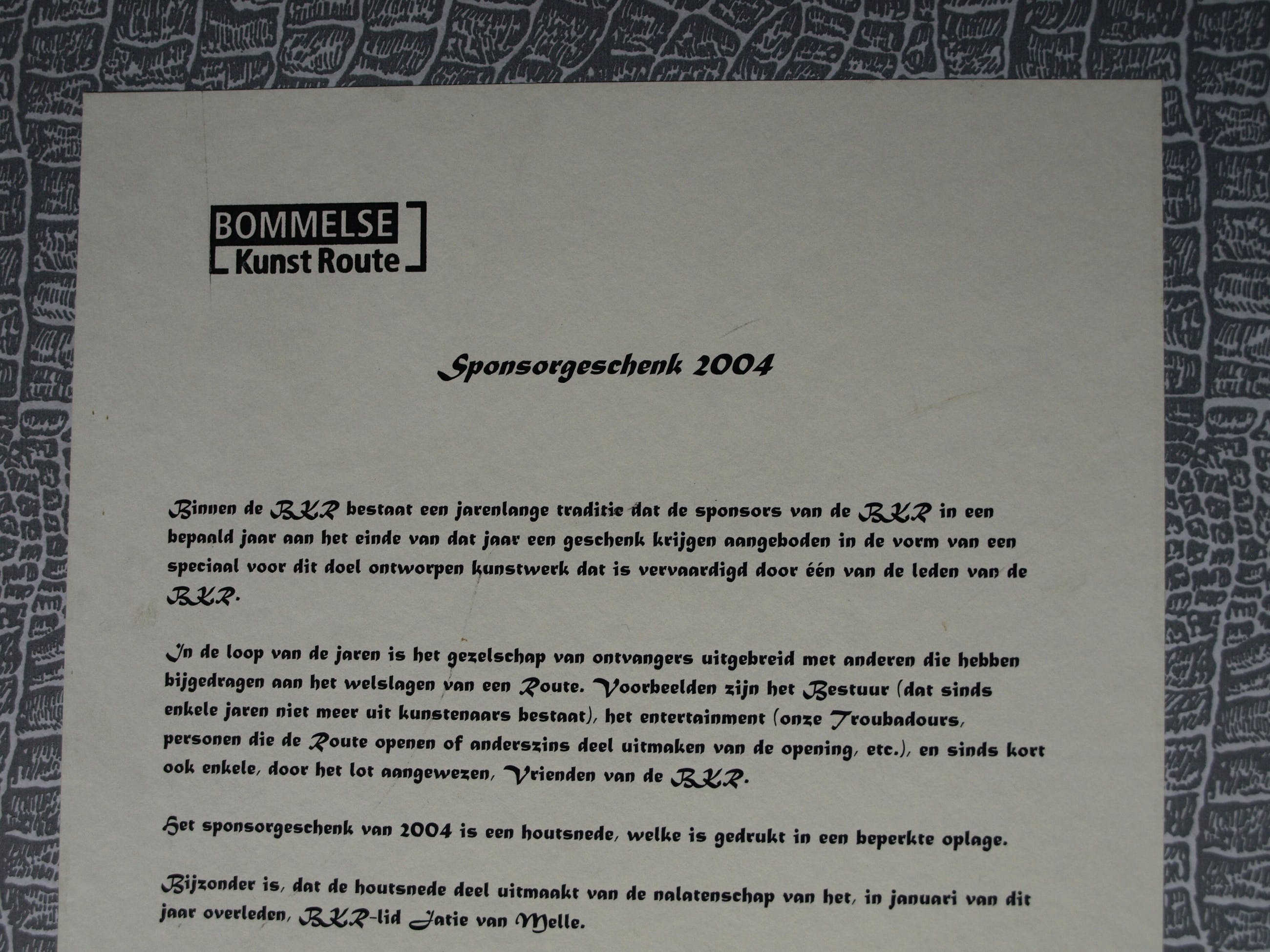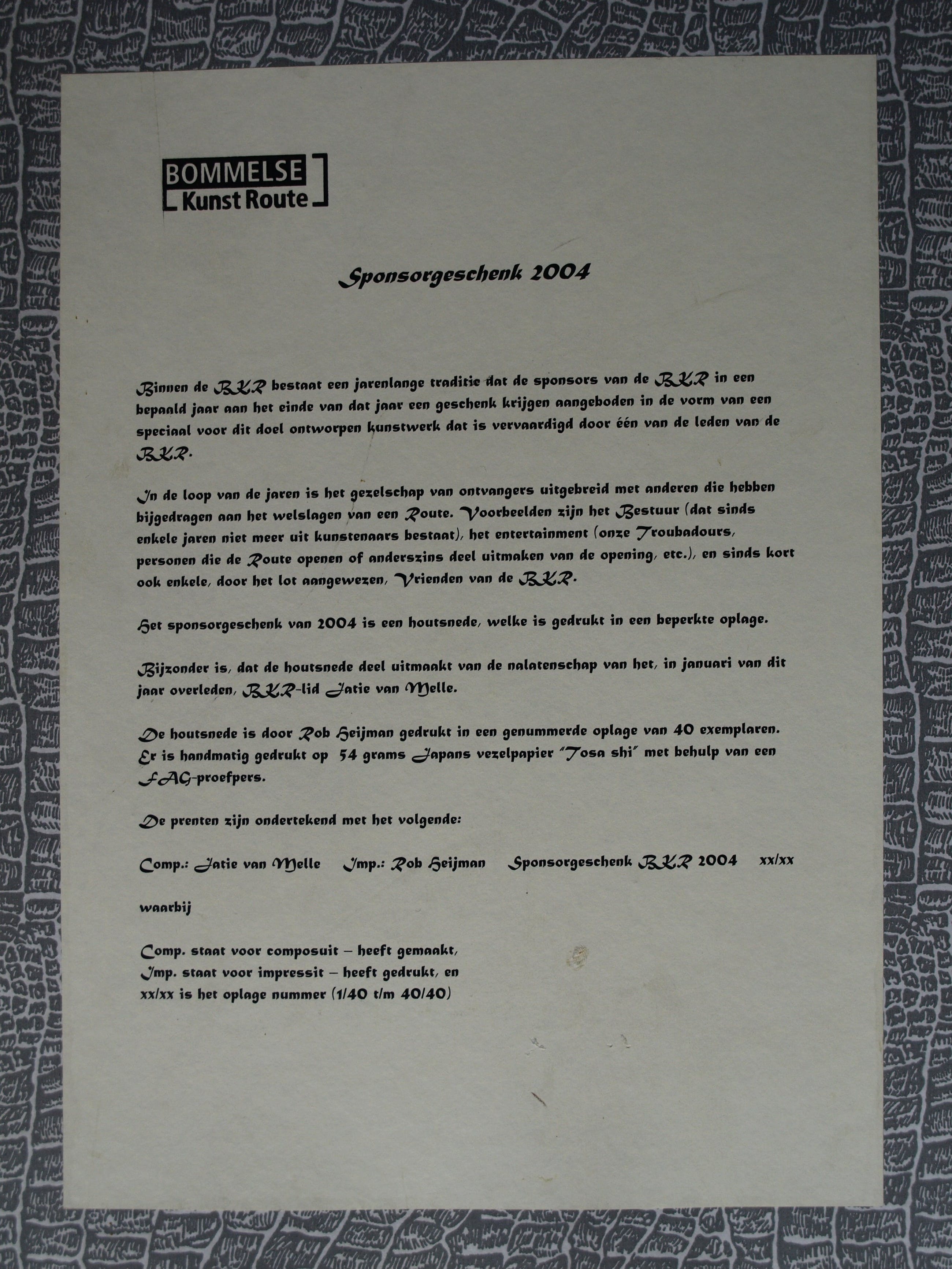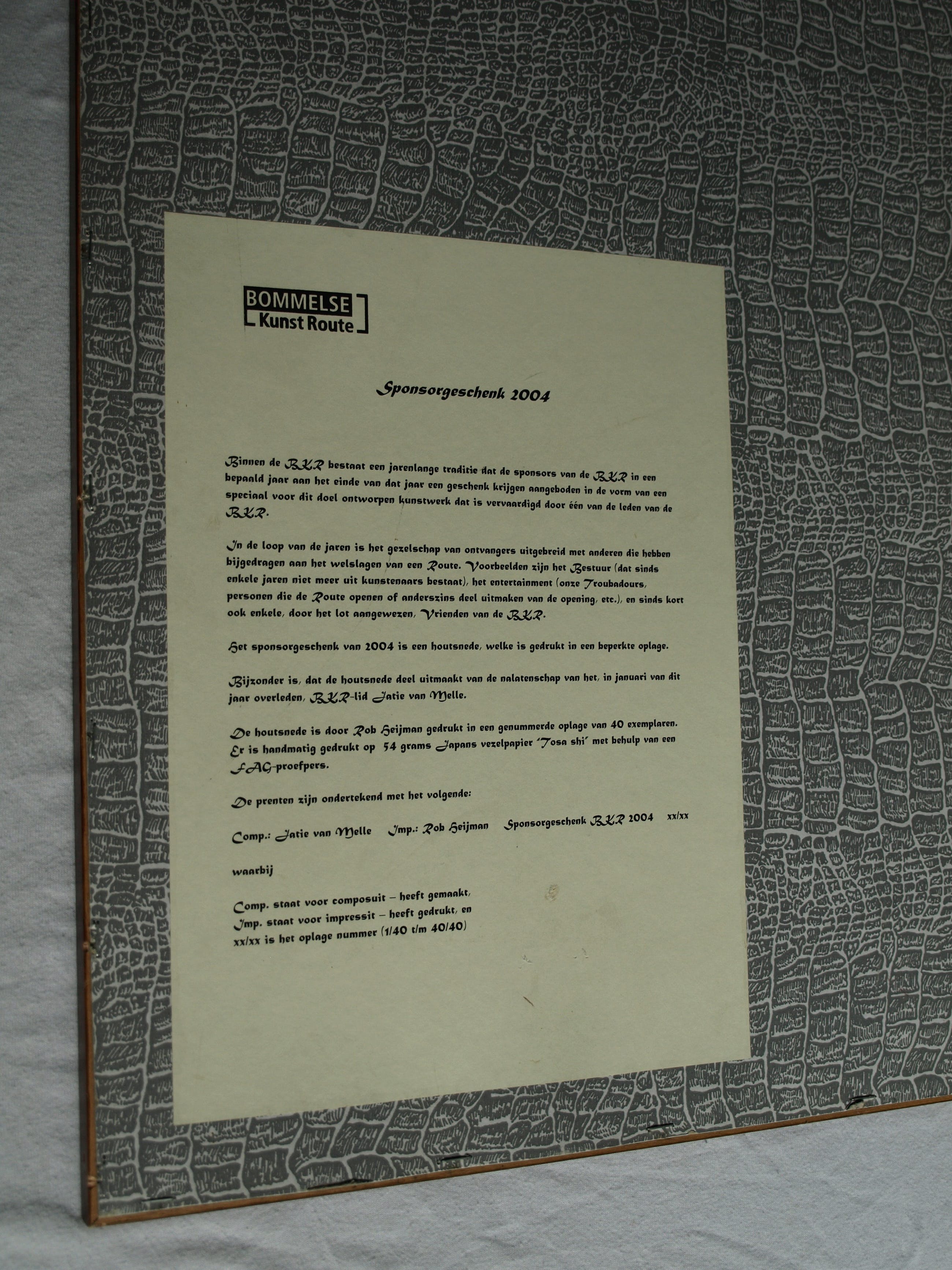 Een grote ingelijste houtsnede uit 2004 van de Nederlandse kunstenares Jatie van Melle (1917-2004). Deze houtsnede was ‘het Sponsorgeschenk’ van de BKR in 2004. Zie de informatie op de achterkant van de lijst, de laatste 3 foto’s).