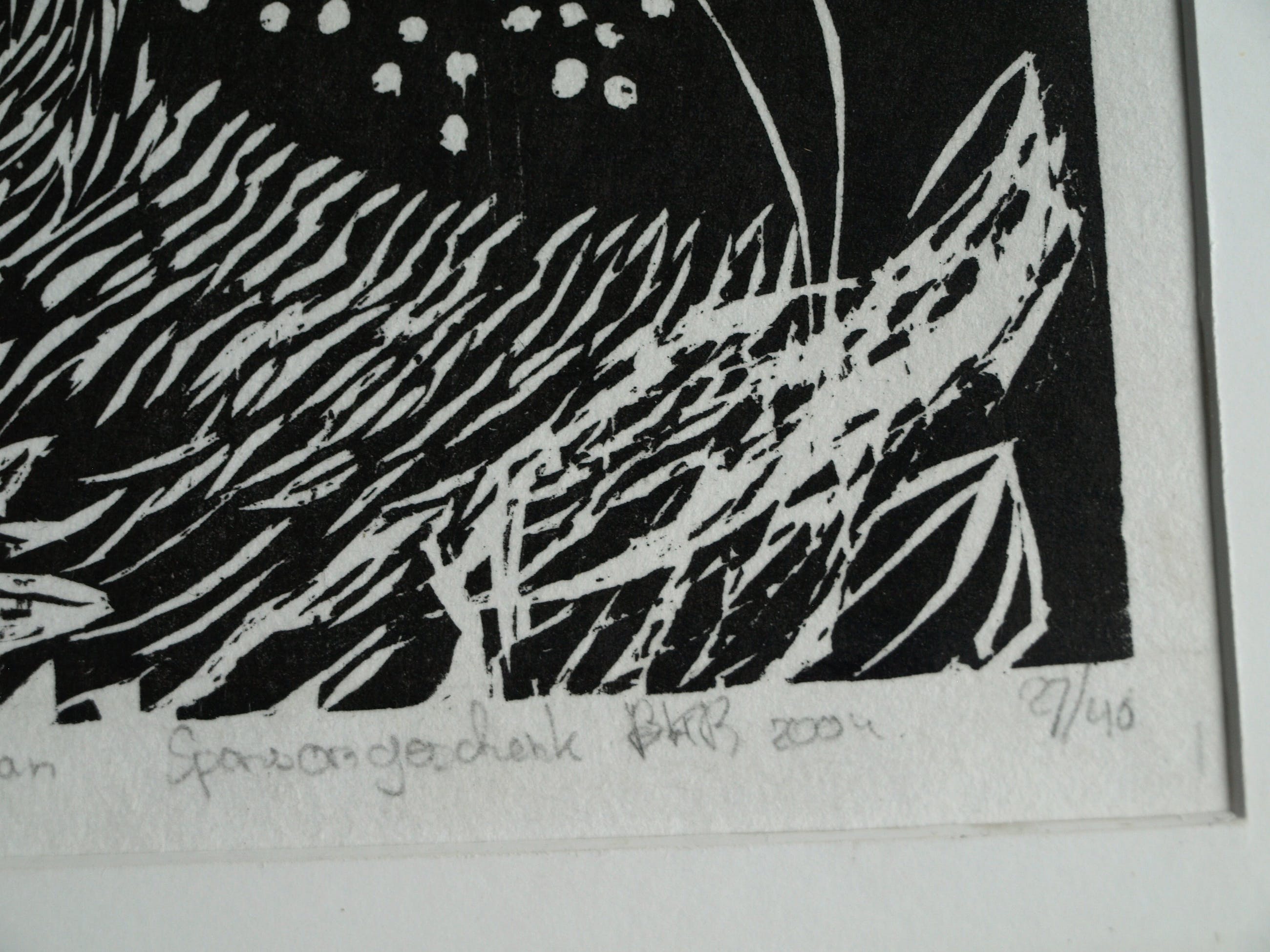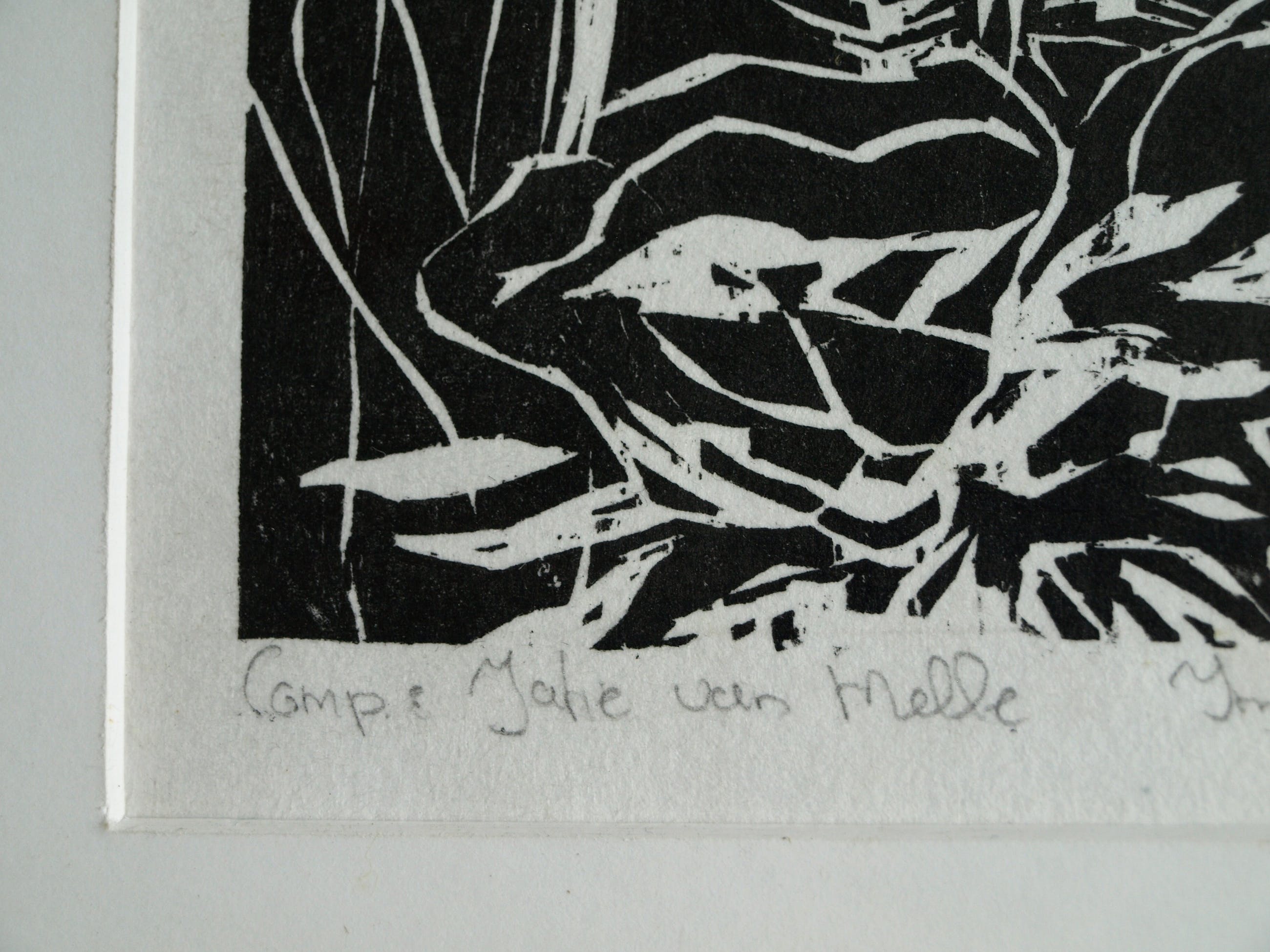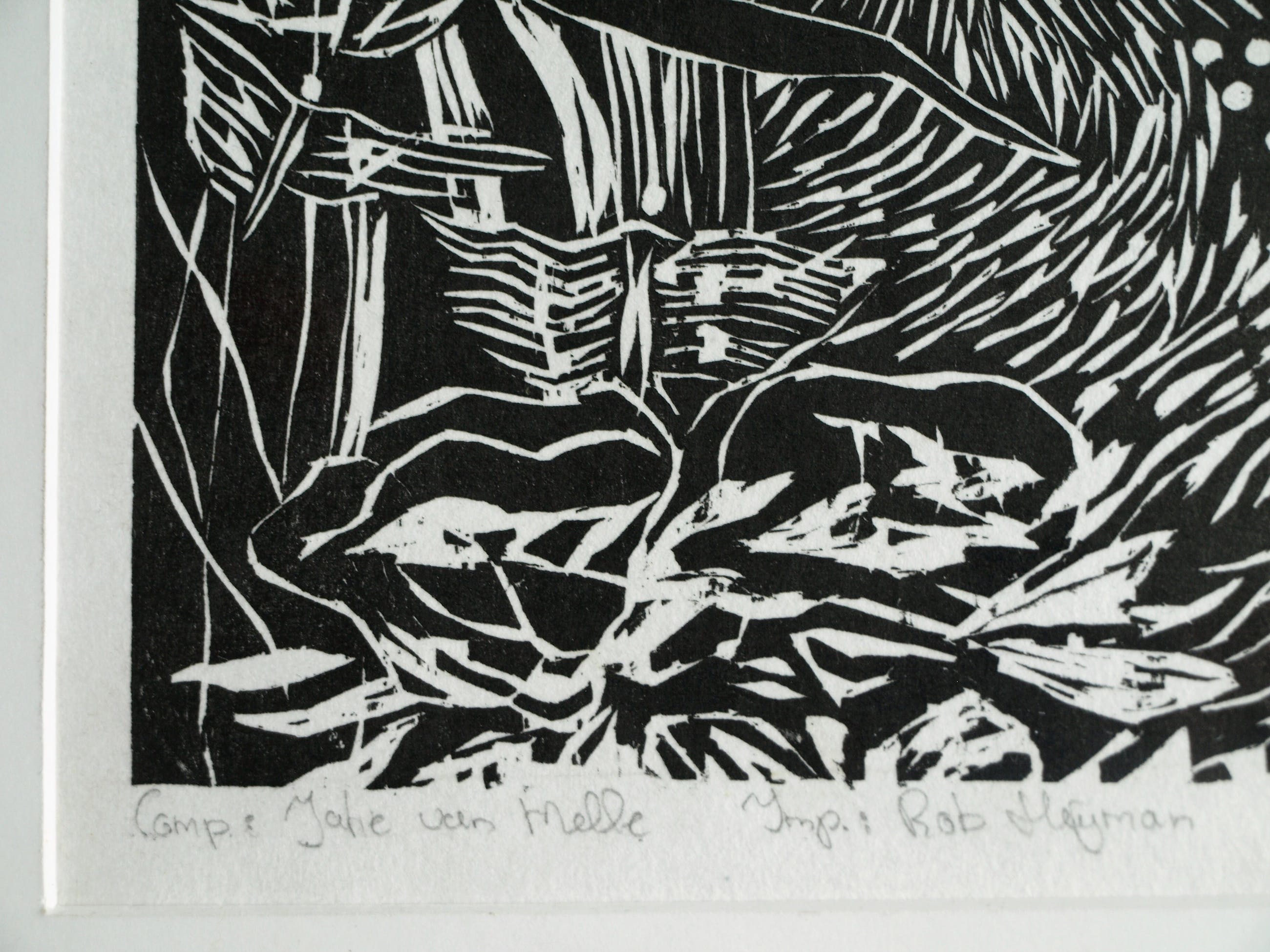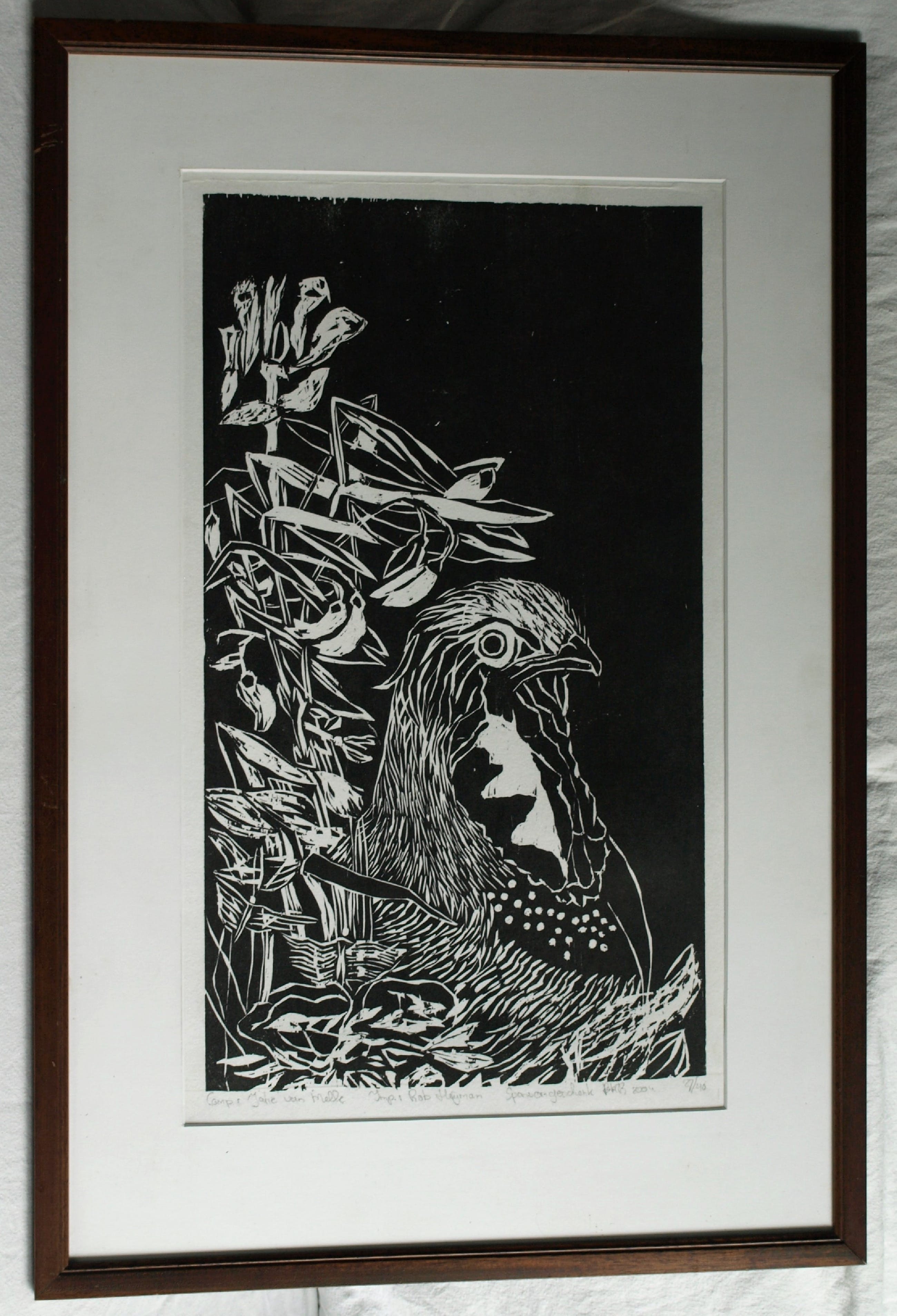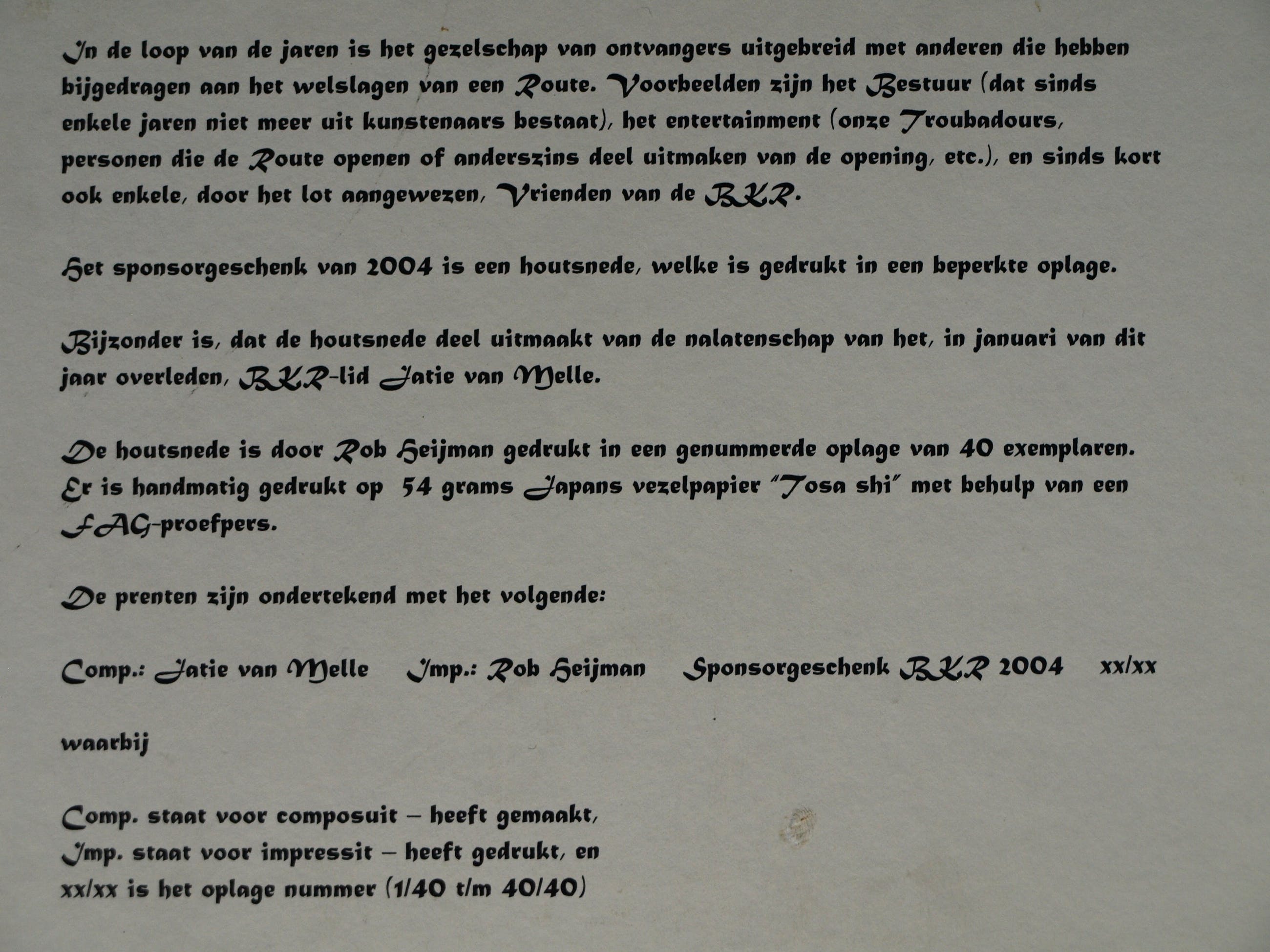 Een grote ingelijste houtsnede uit 2004 van de Nederlandse kunstenares Jatie van Melle (1917-2004). Deze houtsnede was ‘het Sponsorgeschenk’ van de BKR in 2004. Zie de informatie op de achterkant van de lijst, de laatste 3 foto’s).