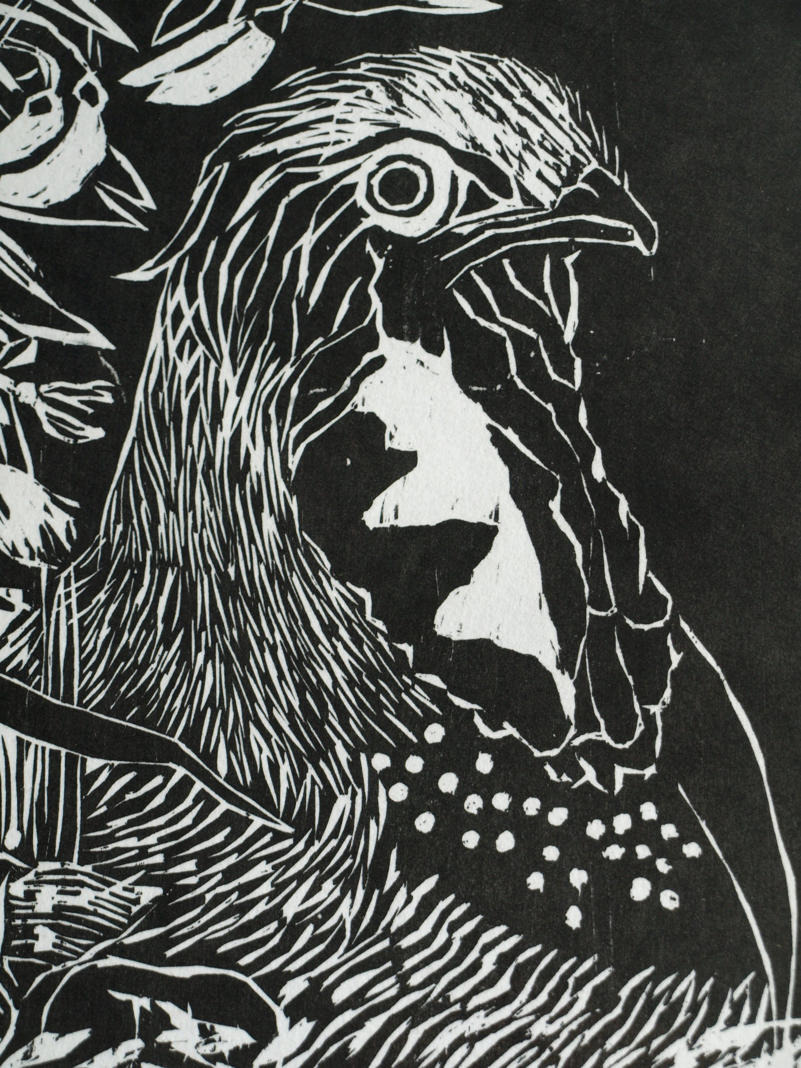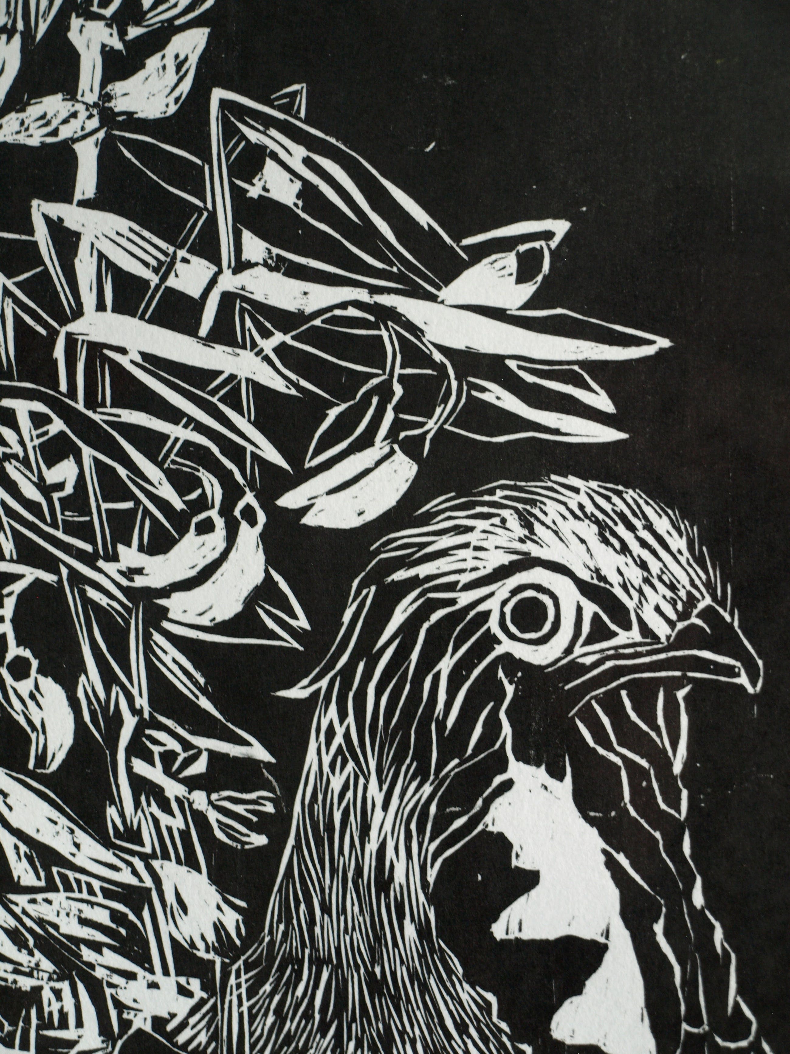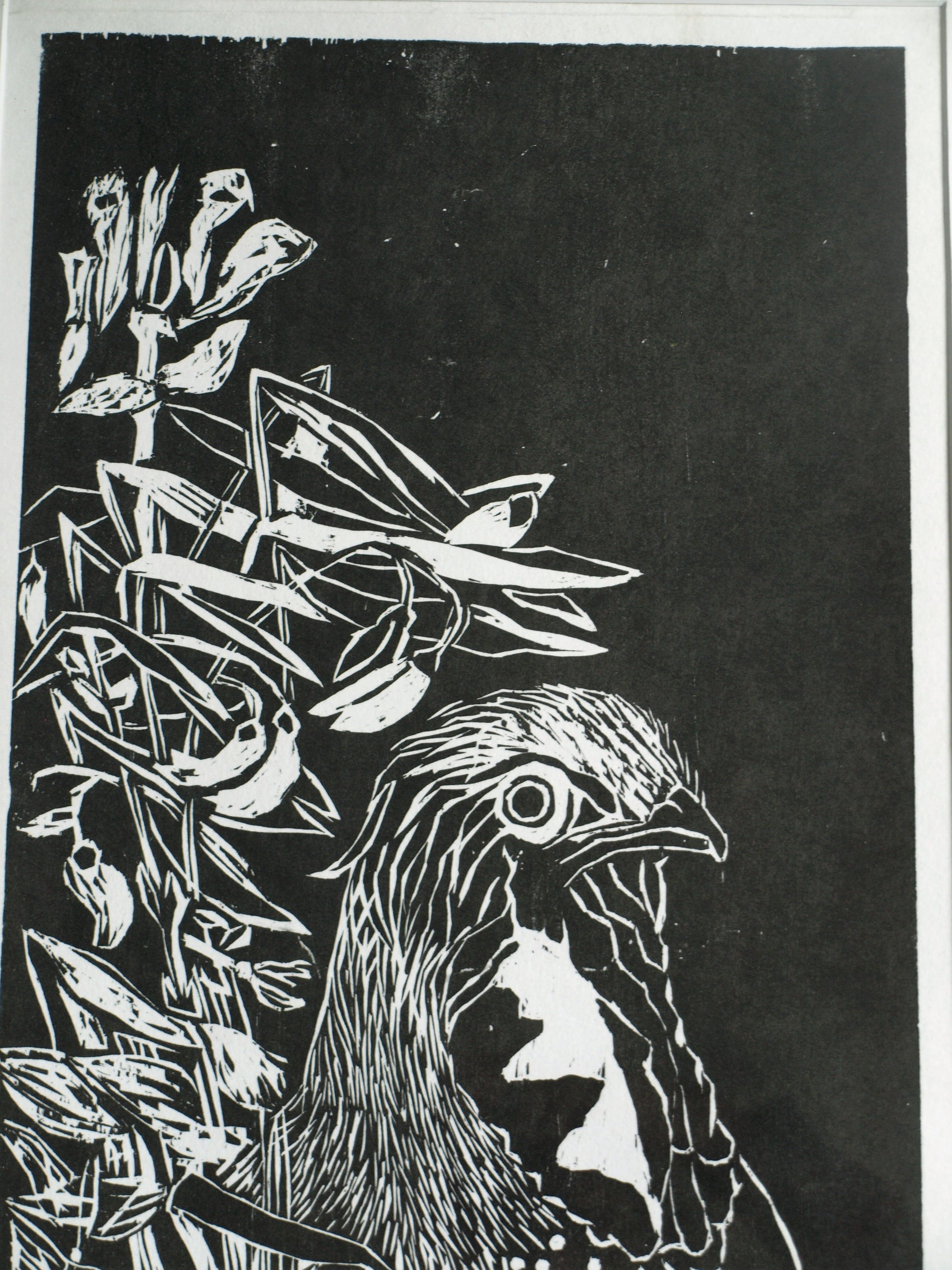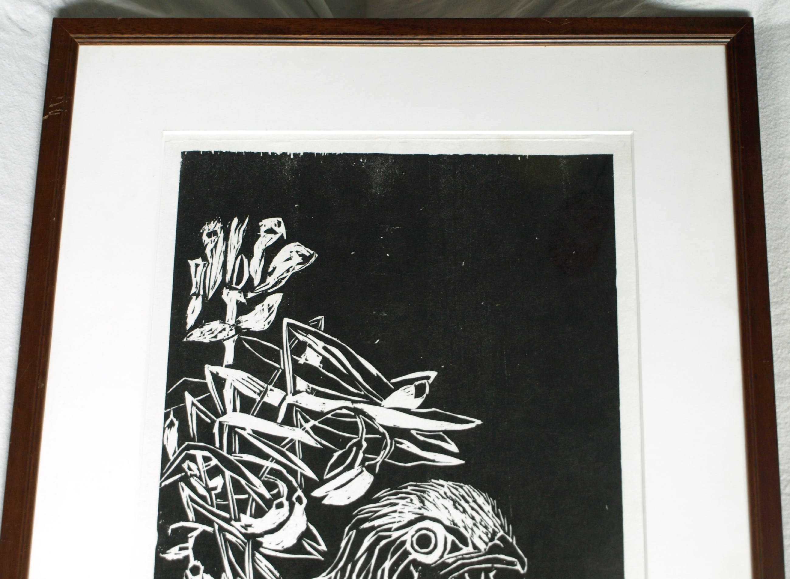Een grote ingelijste houtsnede uit 2004 van de Nederlandse kunstenares Jatie van Melle (1917-2004). Deze houtsnede was ‘het Sponsorgeschenk’ van de BKR in 2004. Zie de informatie op de achterkant van de lijst, de laatste 3 foto’s).