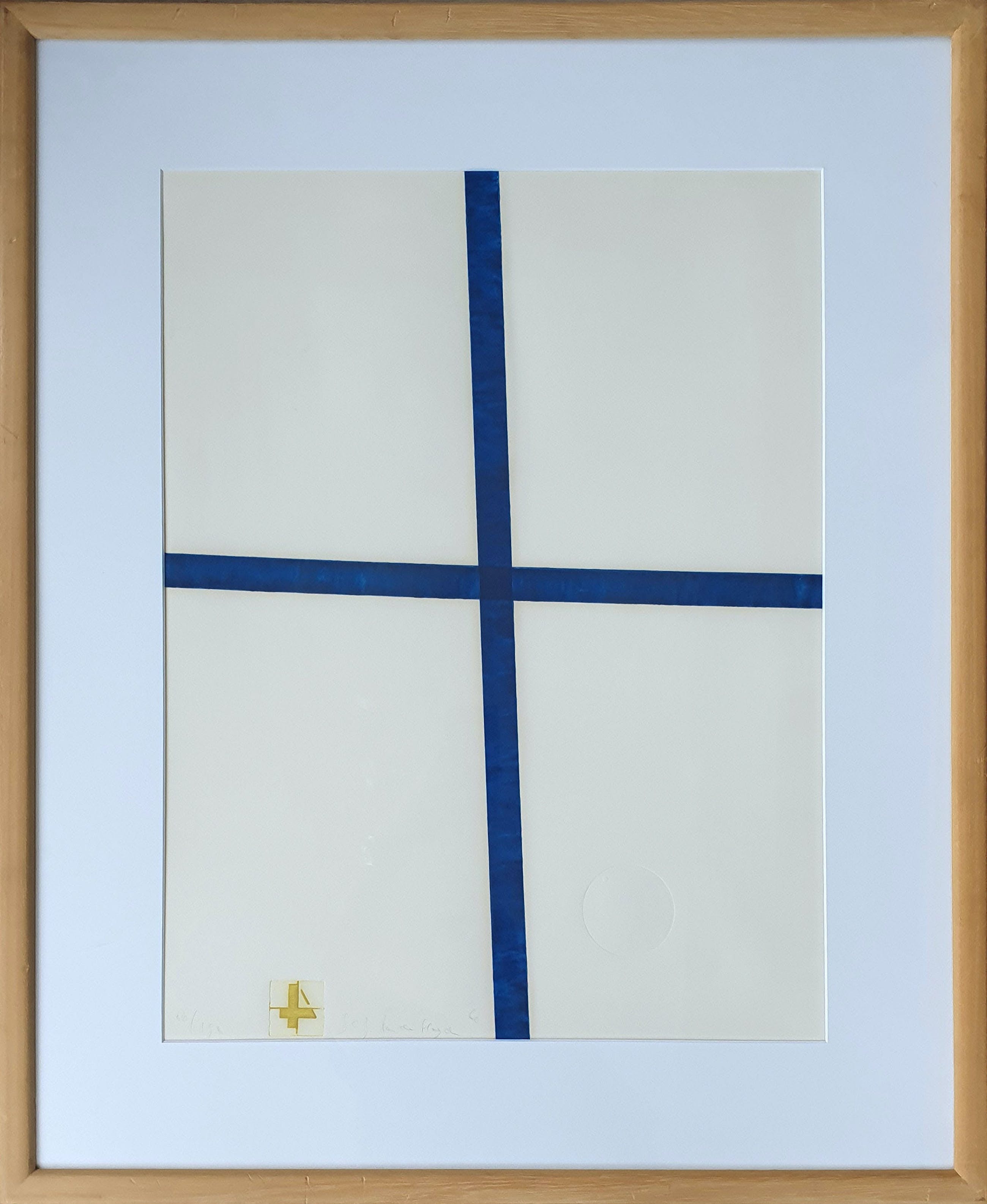 Fraaie metaaldruk van J.C.J. van der Heyden. Reliëfdruk met stukken metaal in blauw en een drukvorm in geel. Uit de Prent 190 reeks, genummerd in potlood linksonder '80/190', gesigneerd en gedateerd: 'J. van der Heyden '68'.