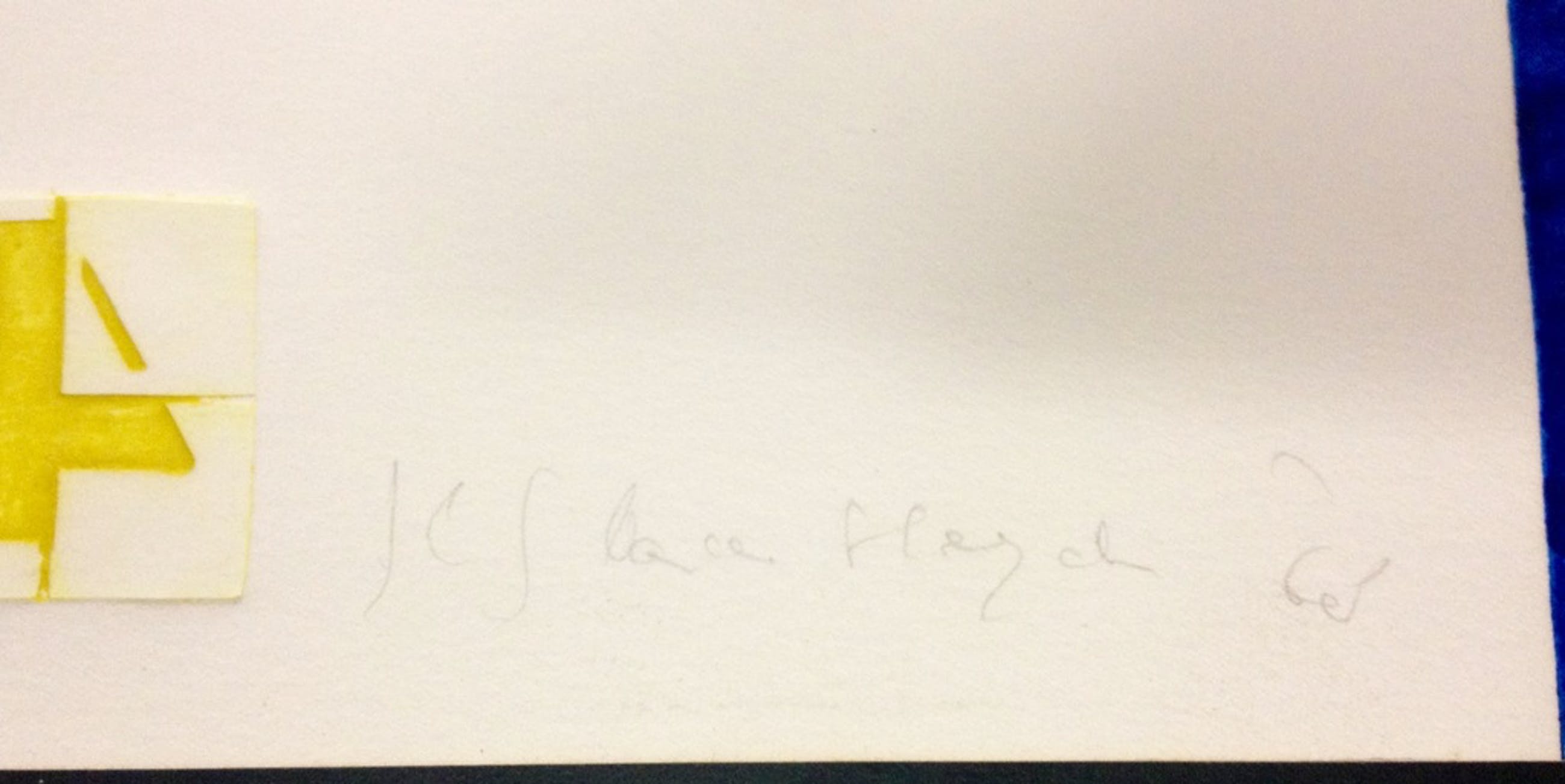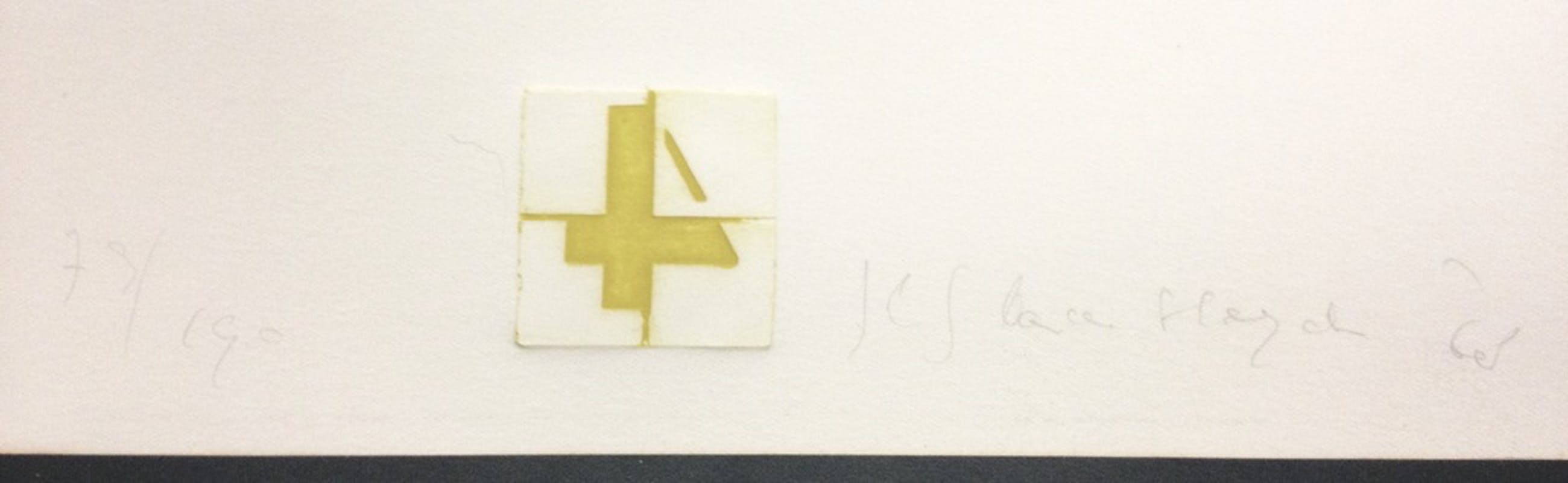 Monotype / metaaldruk van J.C.J. van der Heyden, reliëfdruk met stukken metaal in blauw en een drukvorm (cijfer '4') in geel. Uit de Prent 190 reeks, genummerd in potlood linksonder '79/190', gesigneerd en gedateerd: 'J. van der Heyden '68'. Conditie: goed, volledig blad, enige vage vochtvlekken, iets verkleurd aan de randen van het papier. 65x50 (cm)2 1968